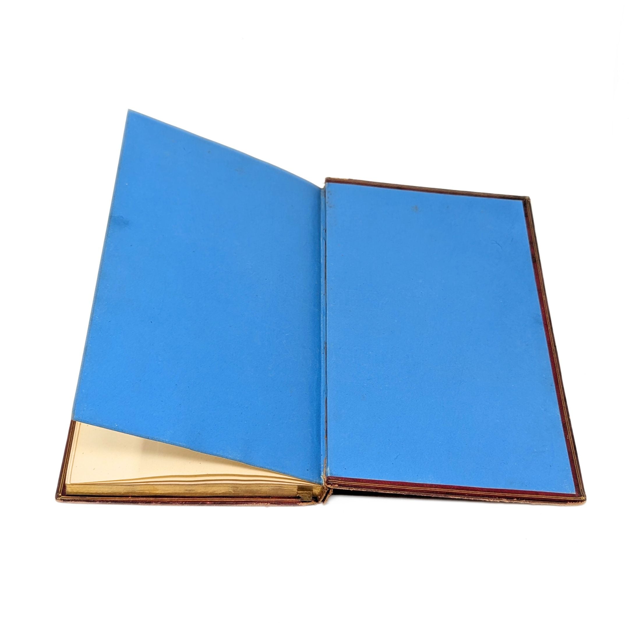 Details:  Full Moroccan red leather bound volume, decorated with gold on covers and spine.  Six raised bands on spine, very worn. Gold on all three edges of pages.  Blue glazed paper endpapers.  Engraved monogrammed bookplate inside front endpapers, opposite page inscribed by a former owner.