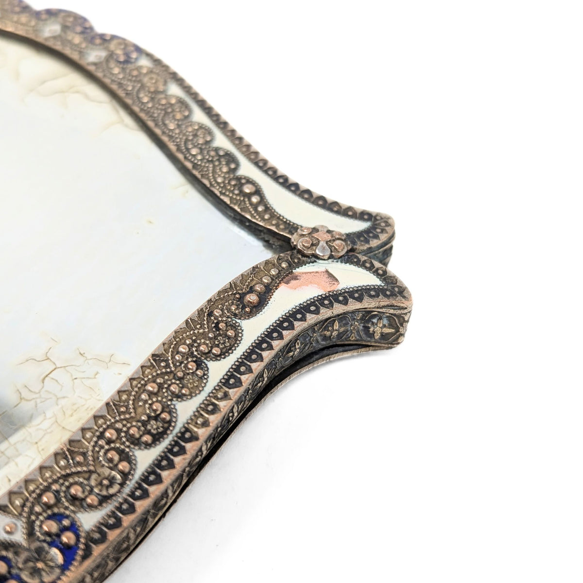 Details: Vanity brush and mirror with shield-shaped backs. Backs covered in silvery metal mesh lace and framed with metal filigree with copper showing through the cream and cobalt blue enamel. Handles made from the same metal filigree and enamel components with an enameled metal rosette on the end.  The mirror glass is shield-shaped and beveled, shows some deterioration of the silver backing around the edges. The natural bristles are set into a bone base which is in turn set into the brush frame. There is some minor enamel loss on each piece
