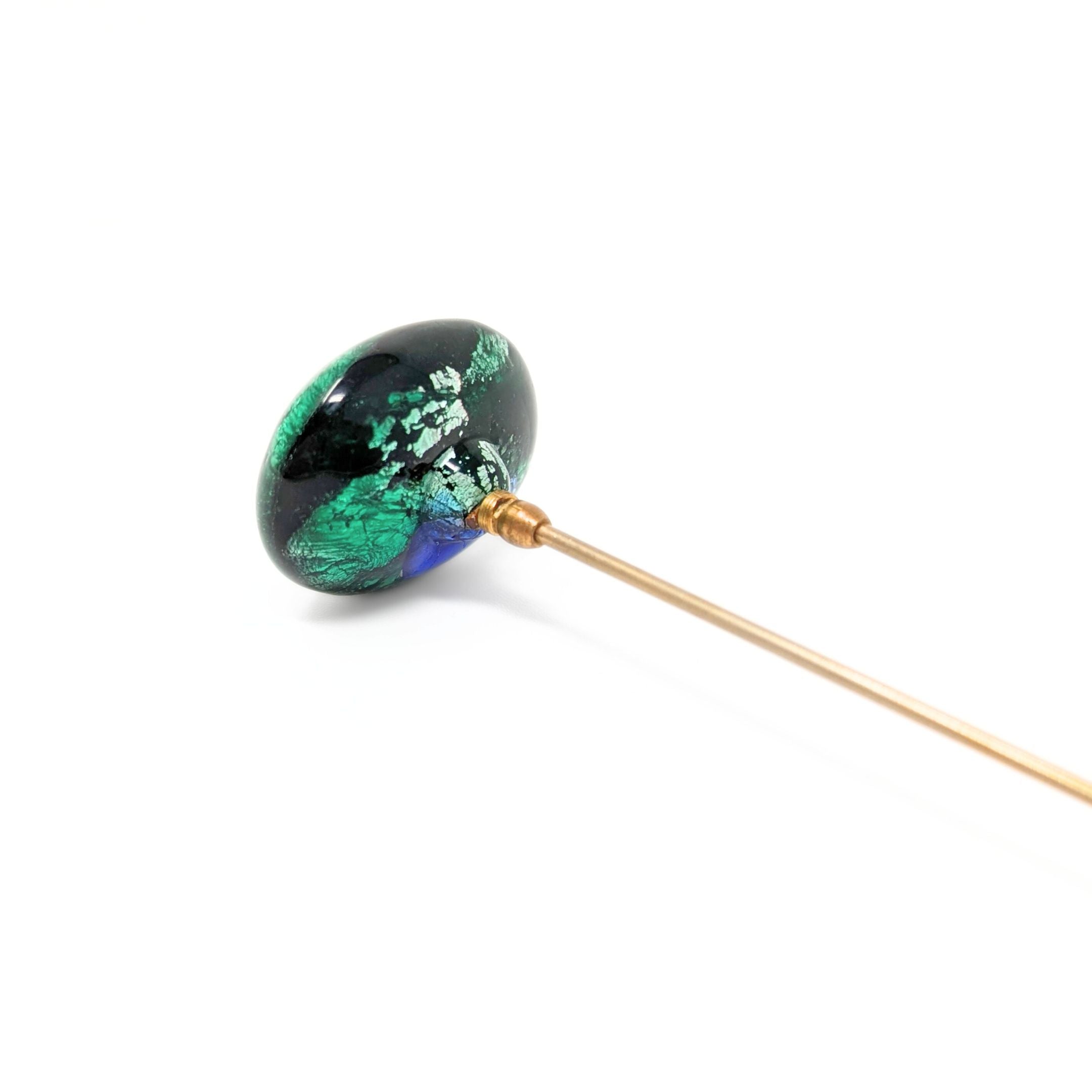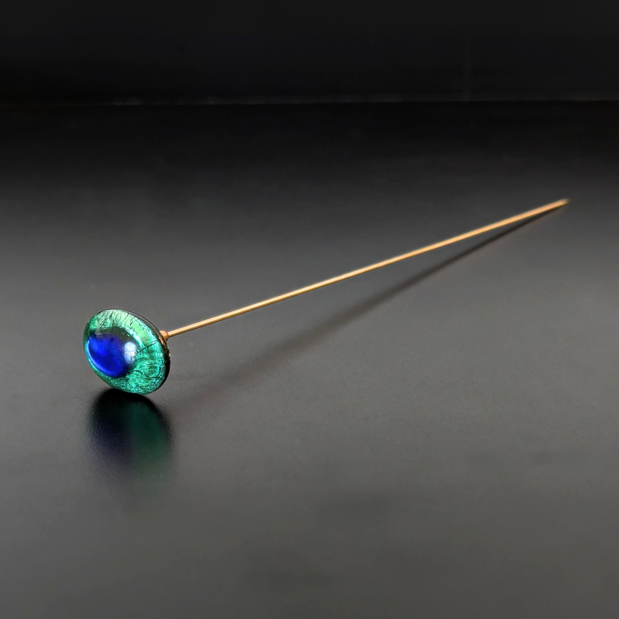 Details: This green and blue “peacock eye” glass hat pin is mesmerizing and in exceptional condition. There are no markings or identifiers on the pin or glass head, but likely dates to the early 20th century.