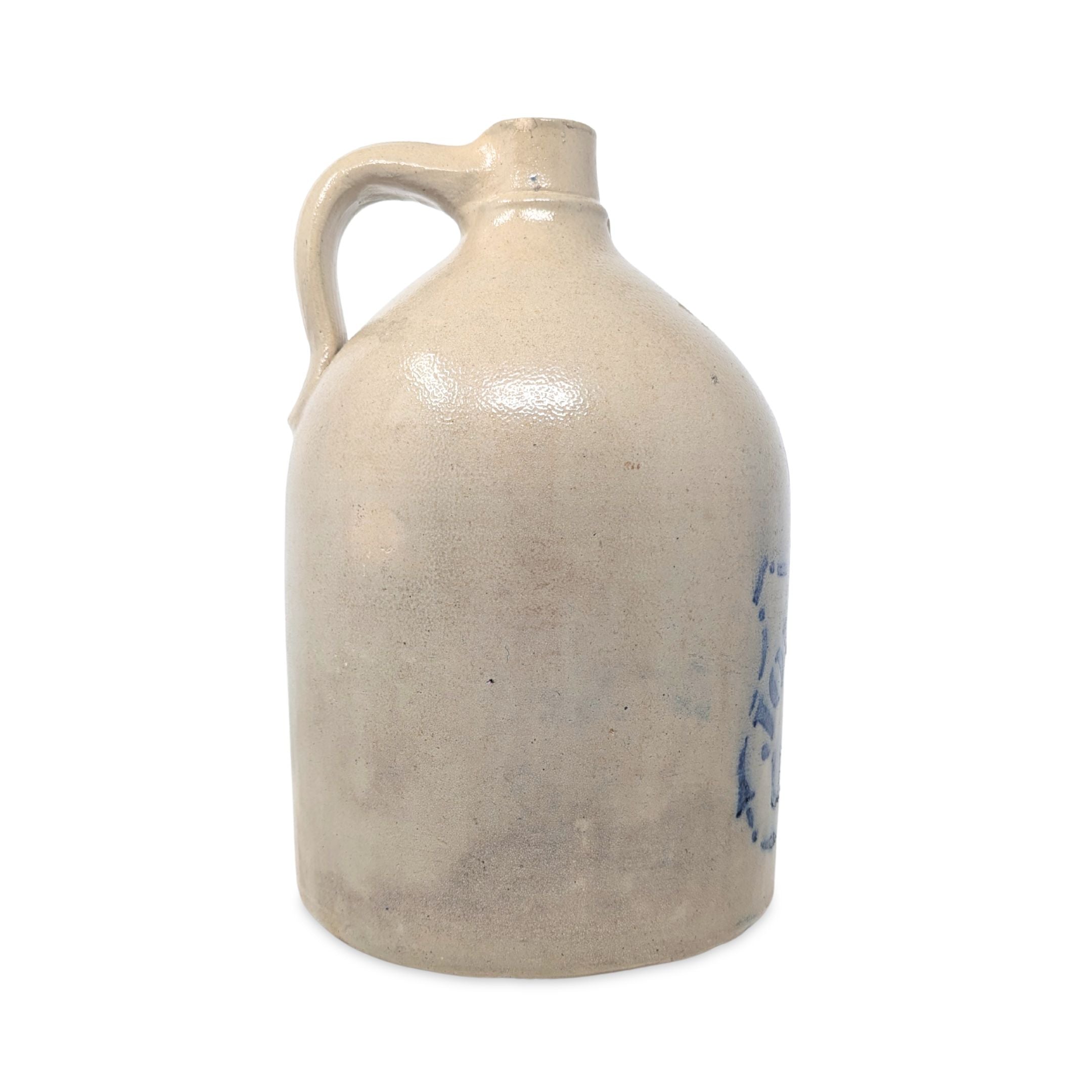 Details: A rare find. This is a work of Nicholas White and his sons, William and Charles, who ran the family pottery from 1865-1886. This nice 2 gallon jug features the pottery stamp on the shoulder, and bold graphics with the merchant name in a patriotic shield topped with a star in a wreath! Strong Bold cobalt art.
