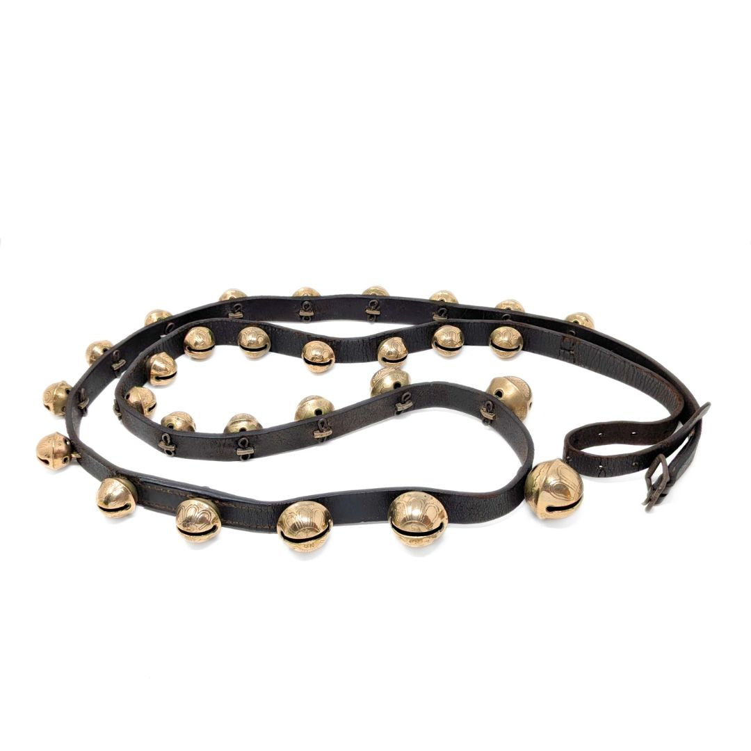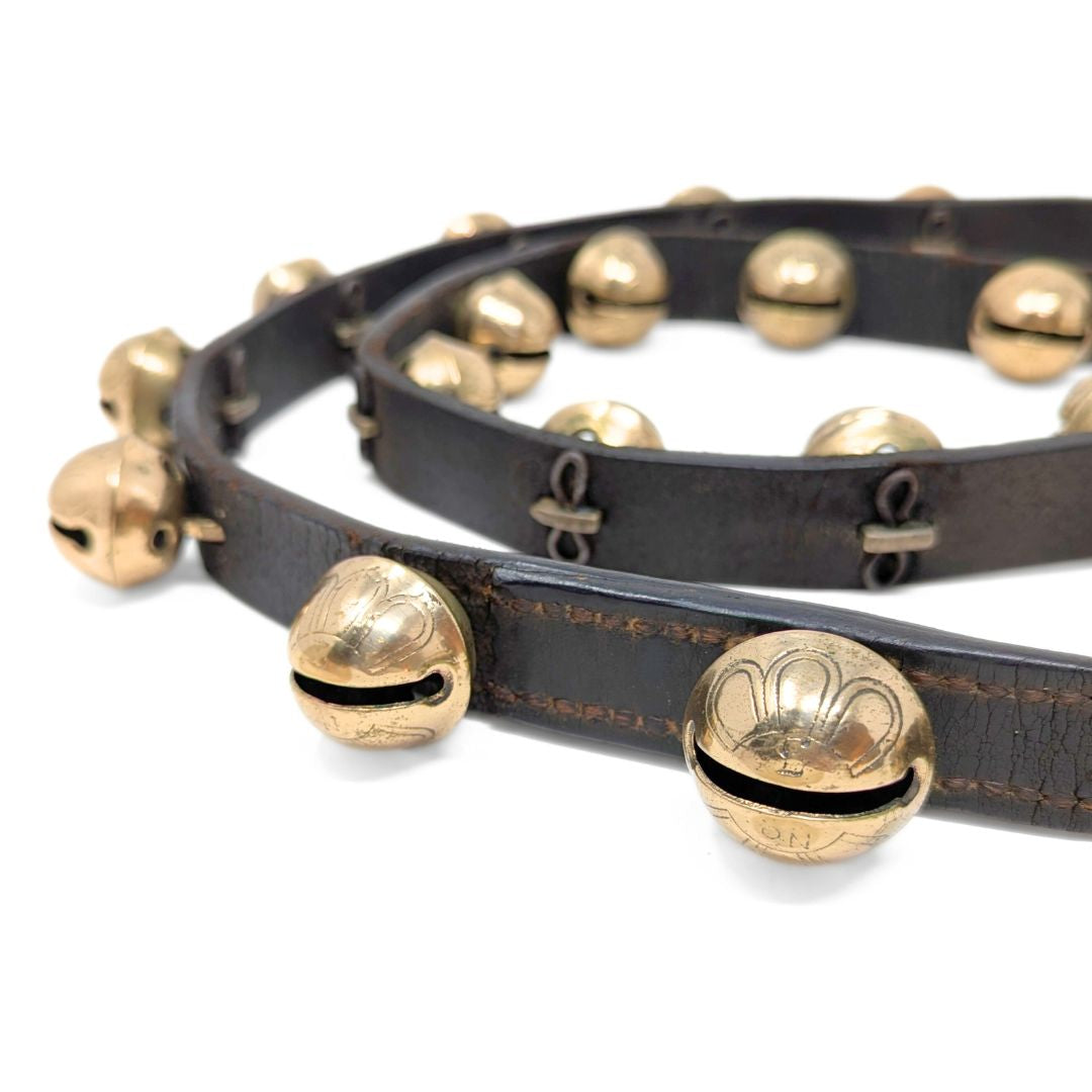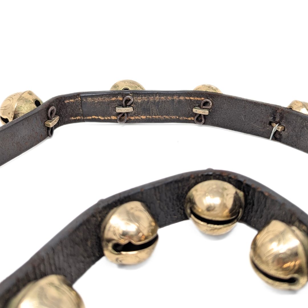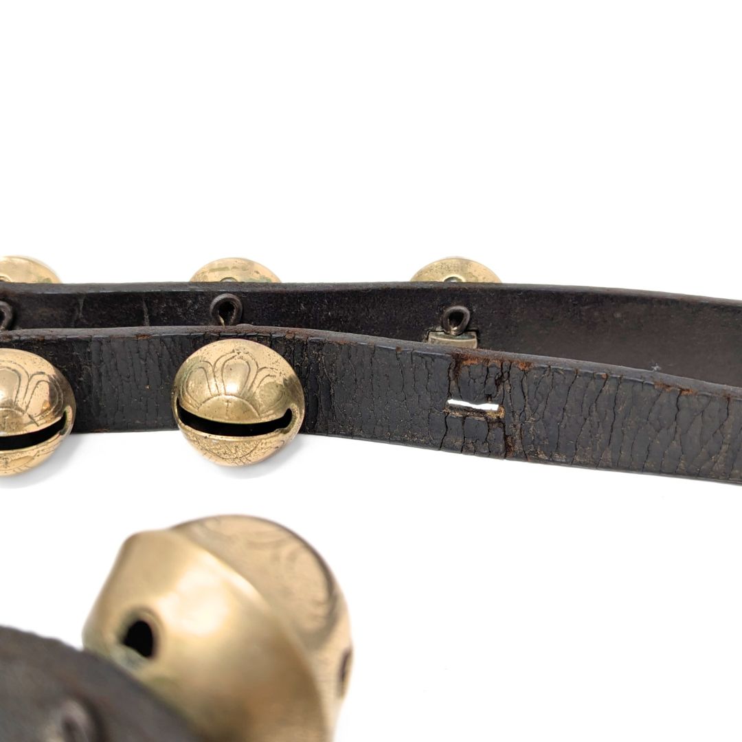 Condition: Very good vintage condition. Leather has been conditioned, but still has surface cracks. Bells have been gently cleaned but still have varied patina. Metal buckle still functional. One bell is missing. Surface crack on underside of largest bell. Please see photos.