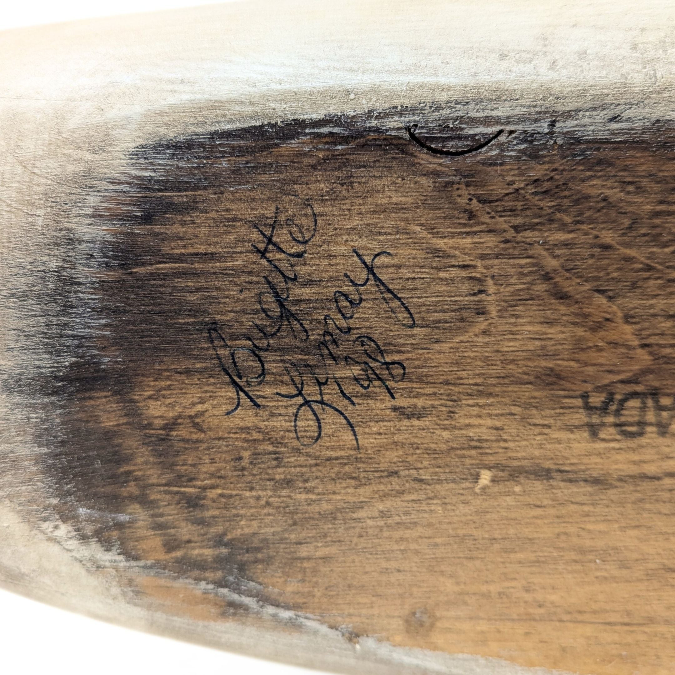 Details: Beautiful hand carved and painted swan with a wonderful aged finish. Signed and dated by Canadian artist Brigitte LeMay.