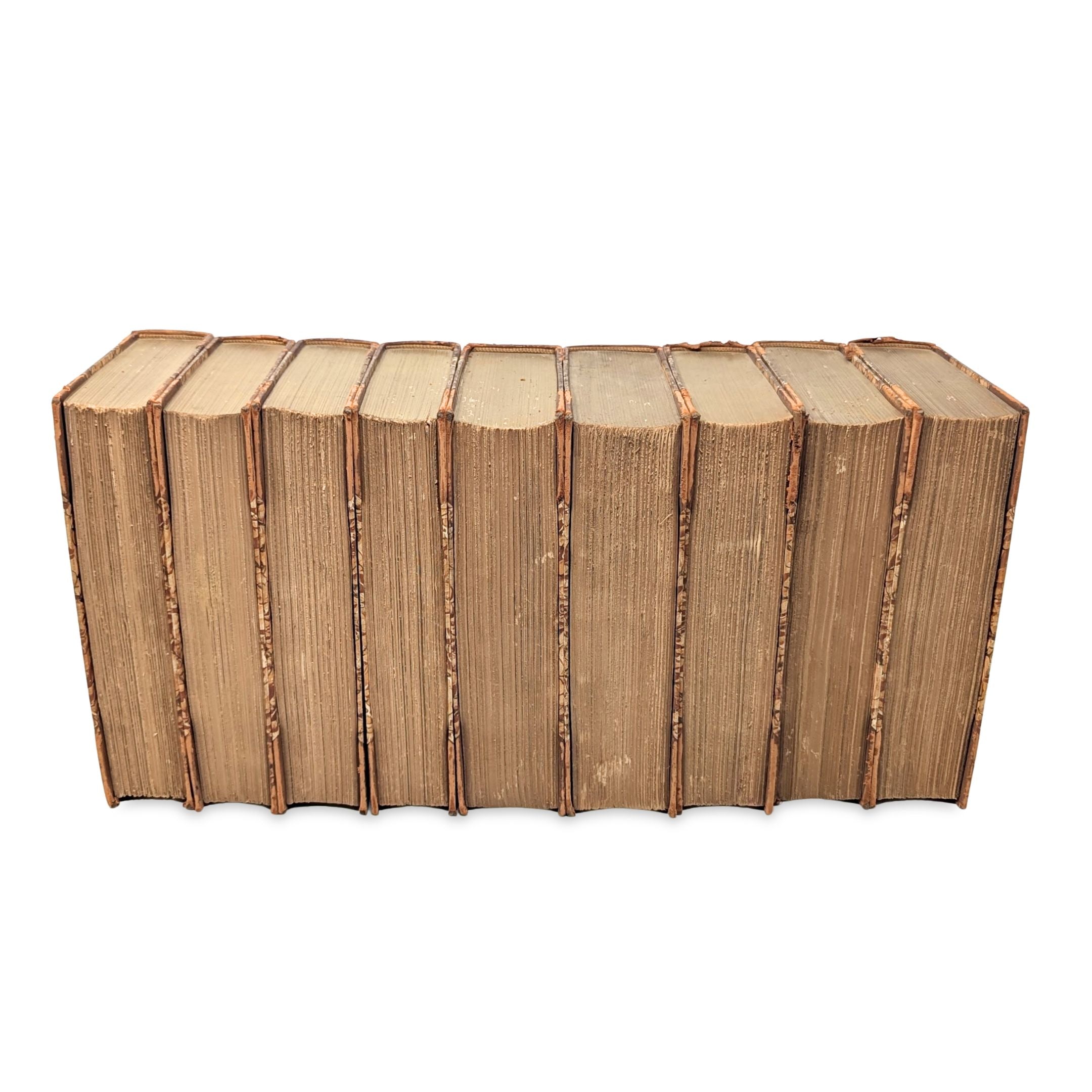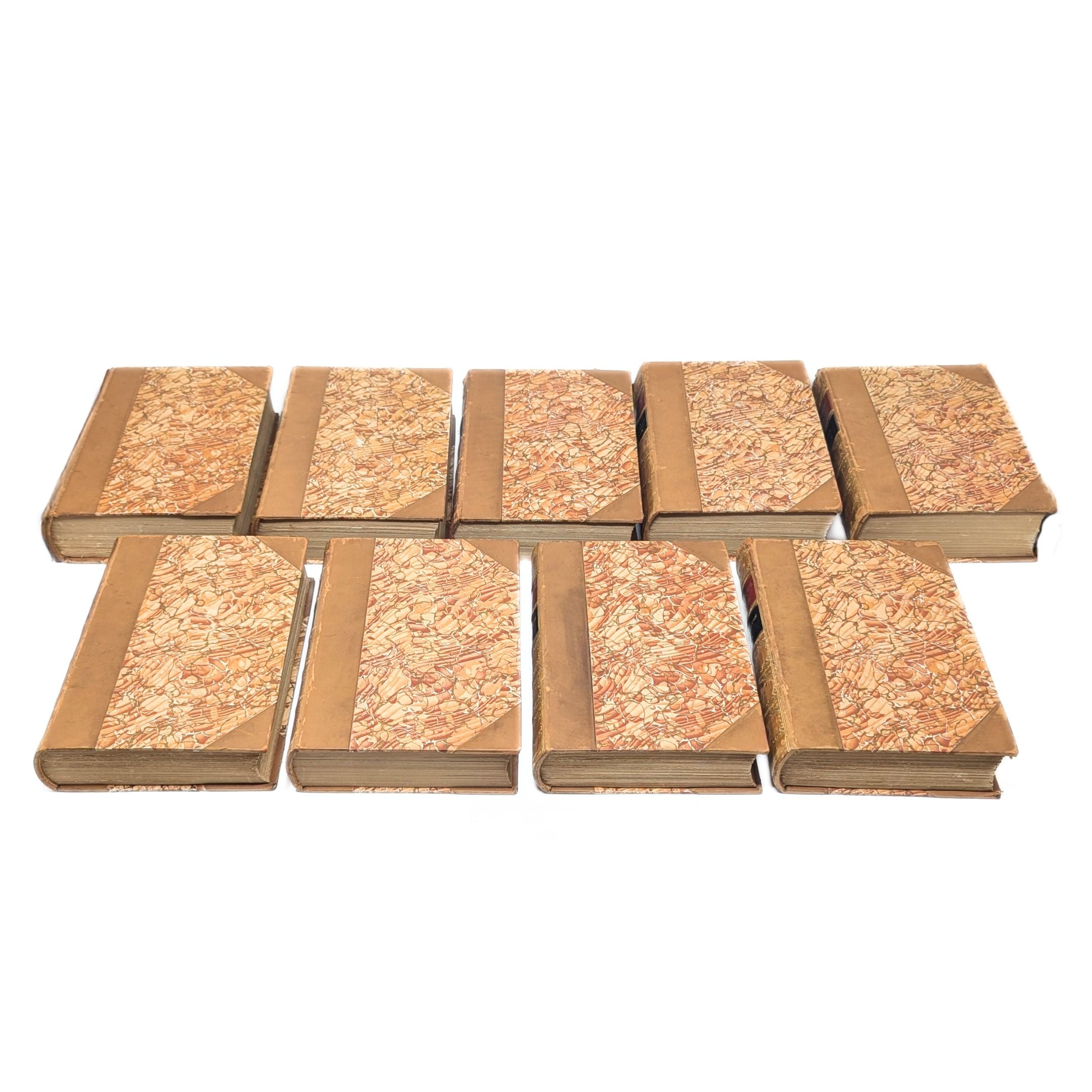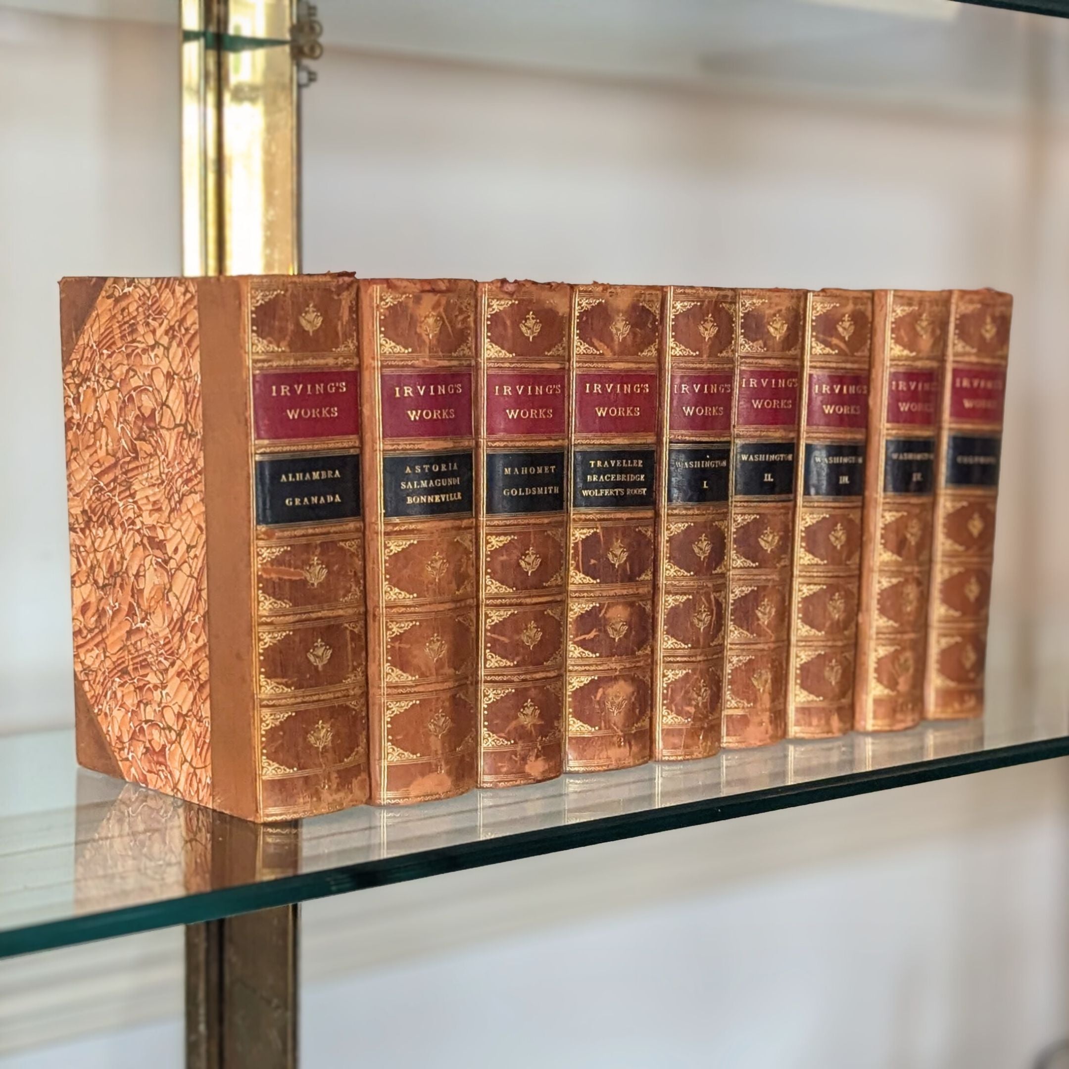 Details: Nine volumes of a ten-volume set of the works of Washington Irving. Volume 3 is missing. Half-bound in tan leather with terracotta marbled paper boards and endpapers, and red and black leather title blocks on spines. Gold lettering and decoration on spines. Gold Top edges on pages. Each volume has a previous owner's bookplate affixed to the inside of the cover. Published by Dana Estes & Company, Boston.