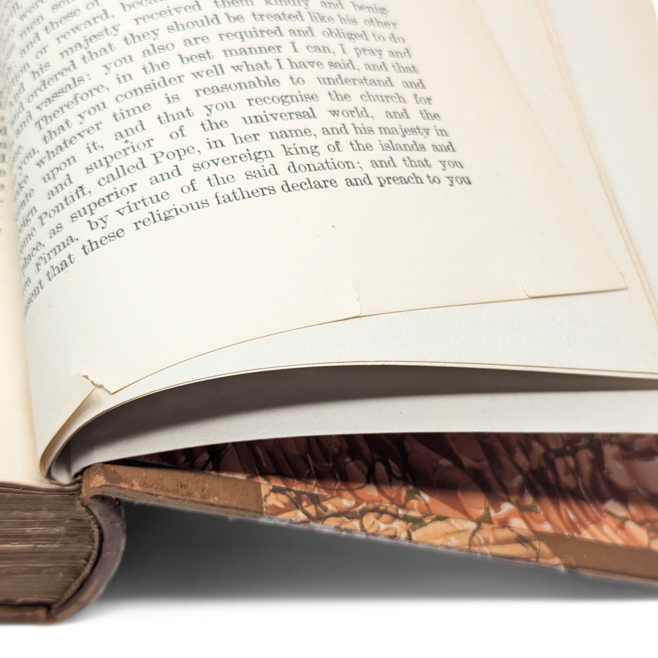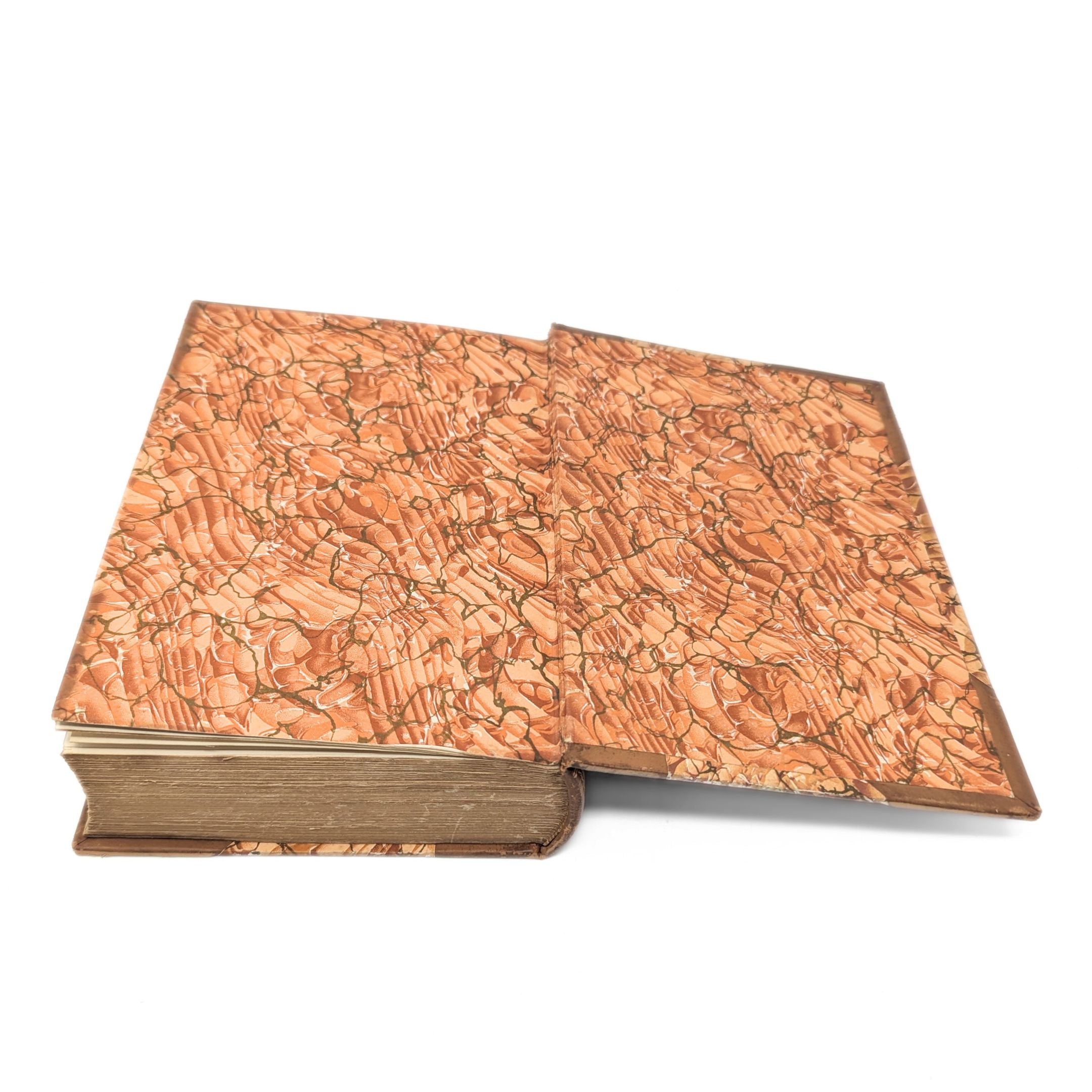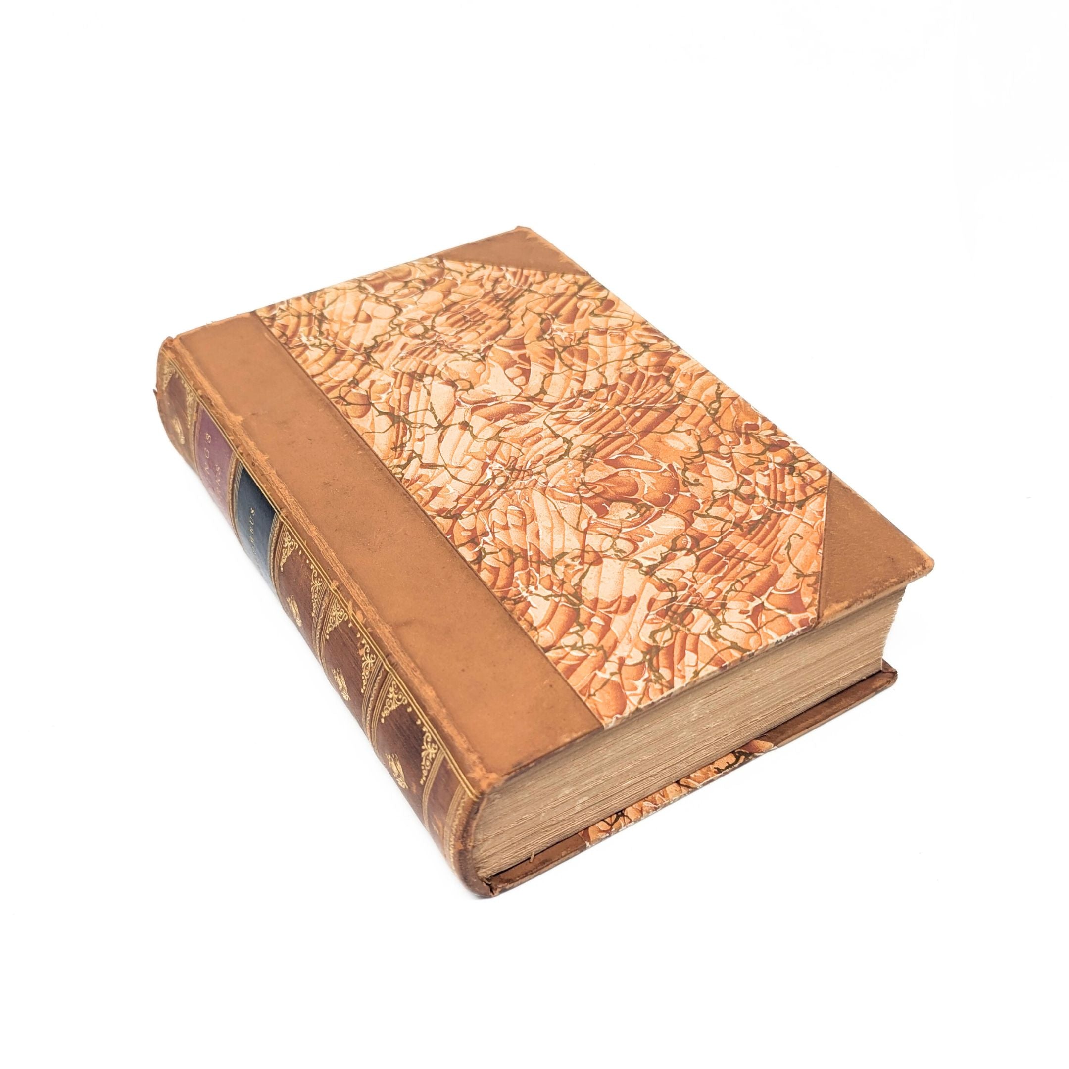 Details: Nine volumes of a ten-volume set of the works of Washington Irving. Volume 3 is missing. Half-bound in tan leather with terracotta marbled paper boards and endpapers, and red and black leather title blocks on spines. Gold lettering and decoration on spines. Gold Top edges on pages. Each volume has a previous owner's bookplate affixed to the inside of the cover. Published by Dana Estes & Company, Boston.