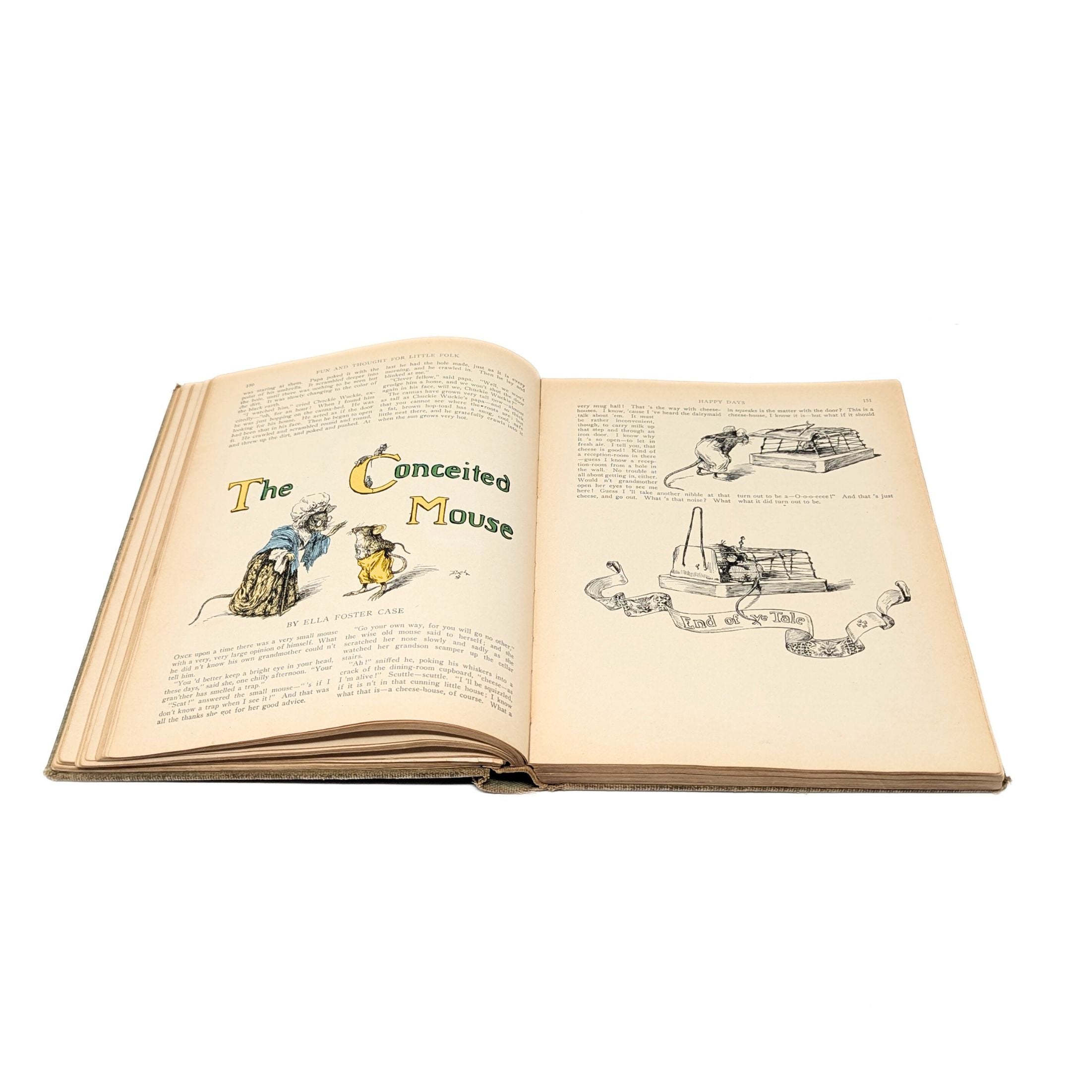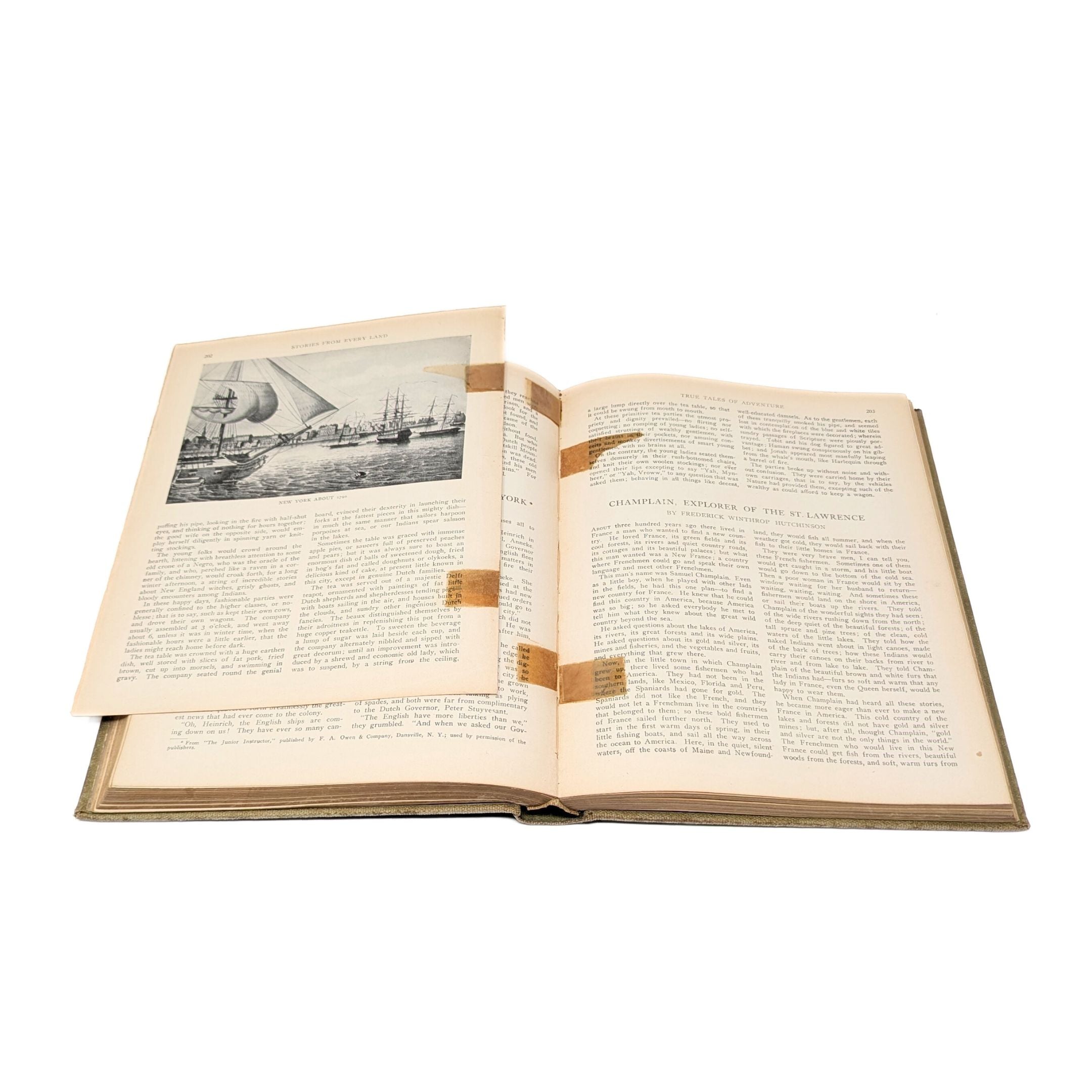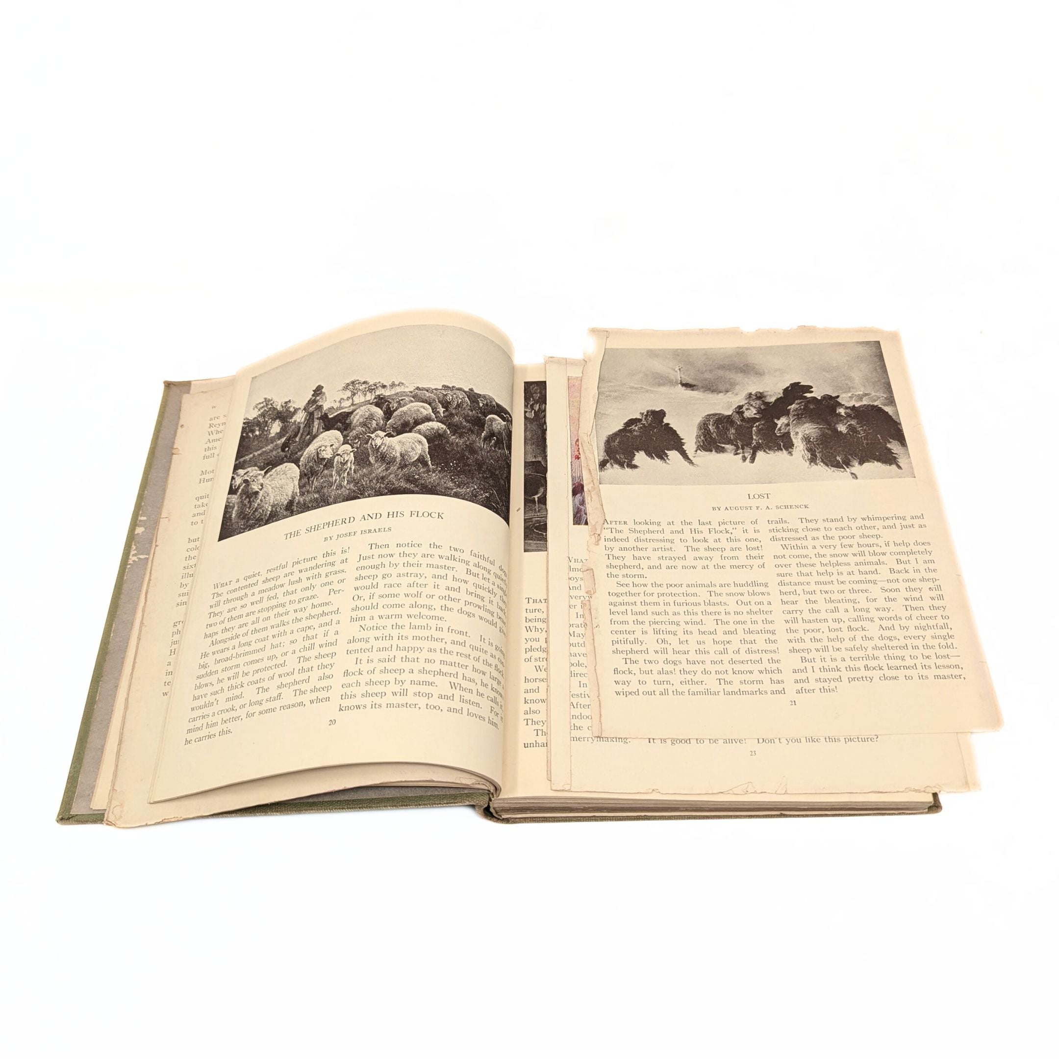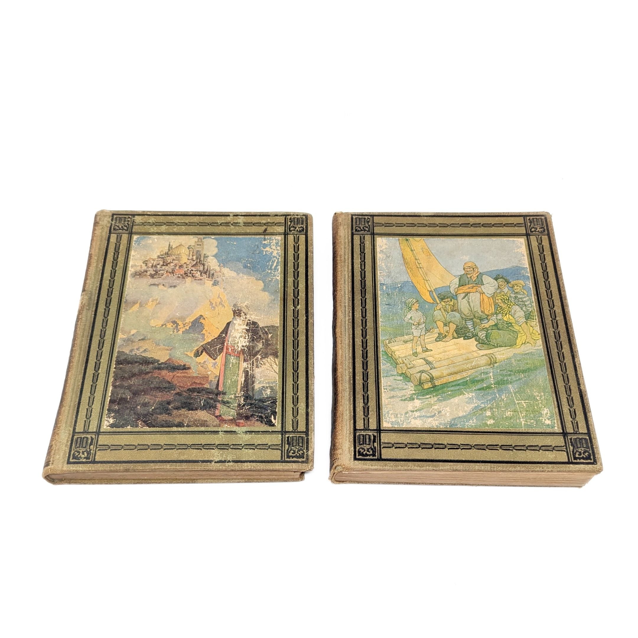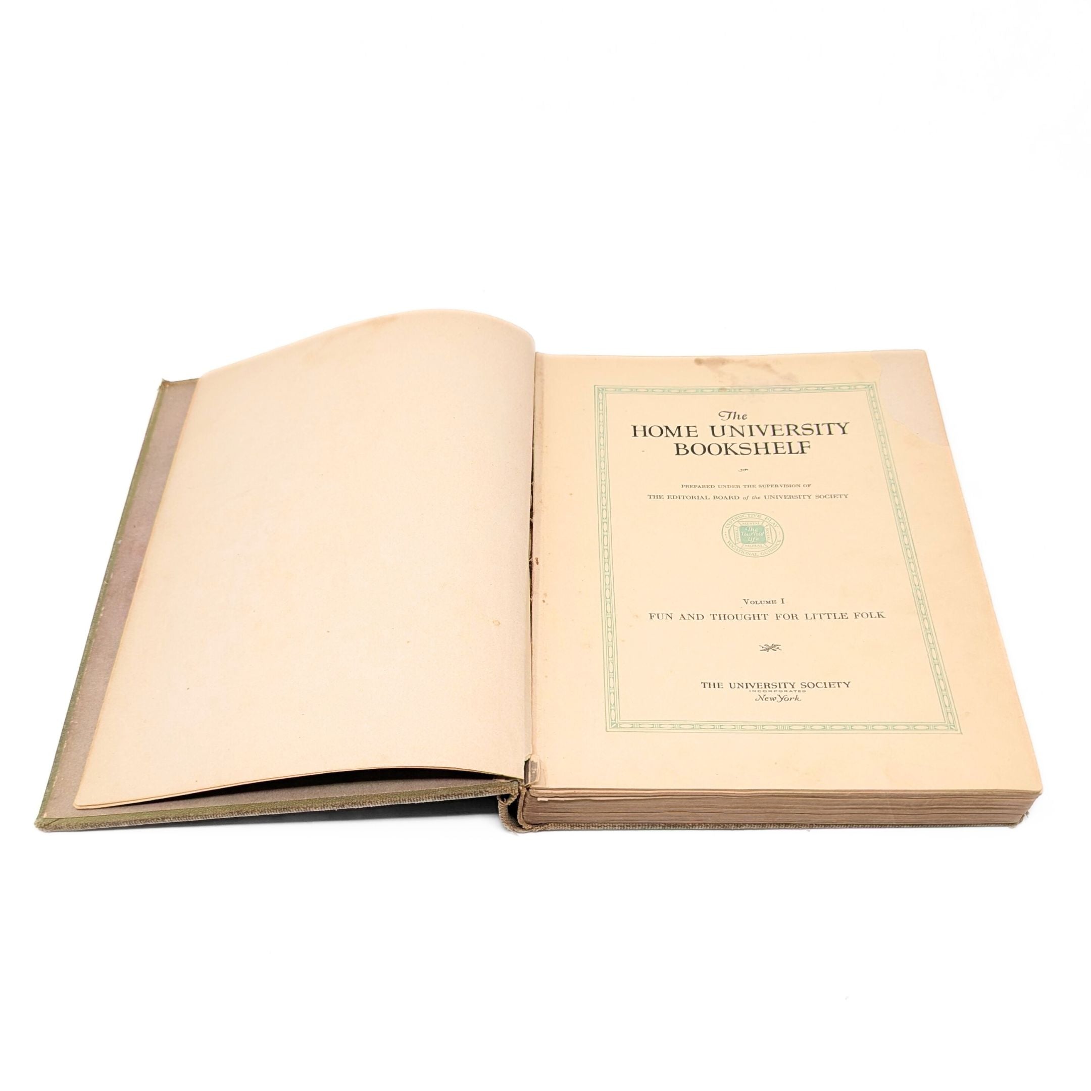 Details: Light green cloth covered hard back books with colorful and beautifully illustrated endpapers. Pages show very minor darkening near edges. Spines on all volumes faded to mid-brown, with titles largely legible. All spines decorated with a silhouette of a child reading under a tree, with a castle in the background clouds. Beautifully illustrated with photographs, color plates, and black and white illustrations by well-known illustrators and artists. Each volume covers a specific topic with appropriate illustrations.