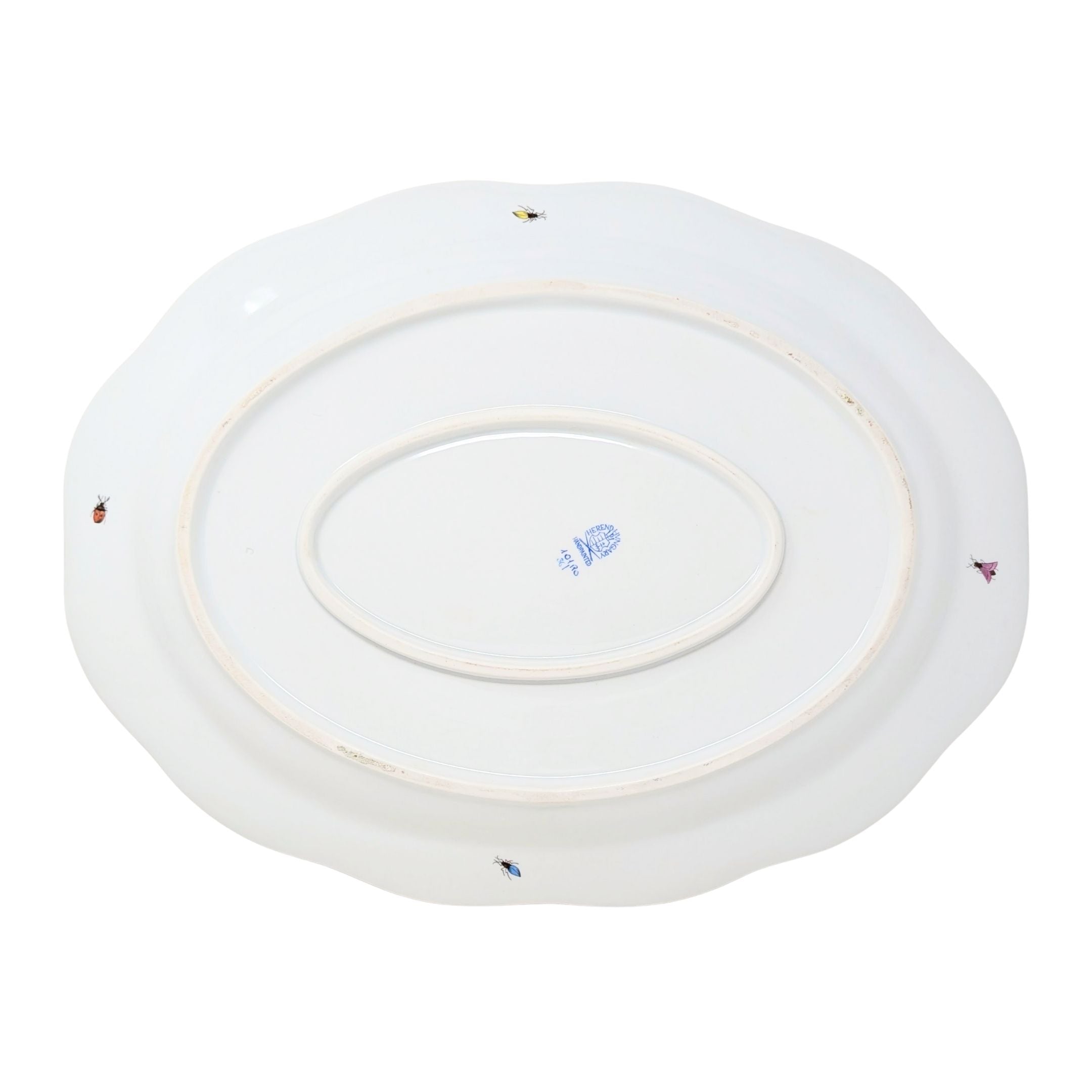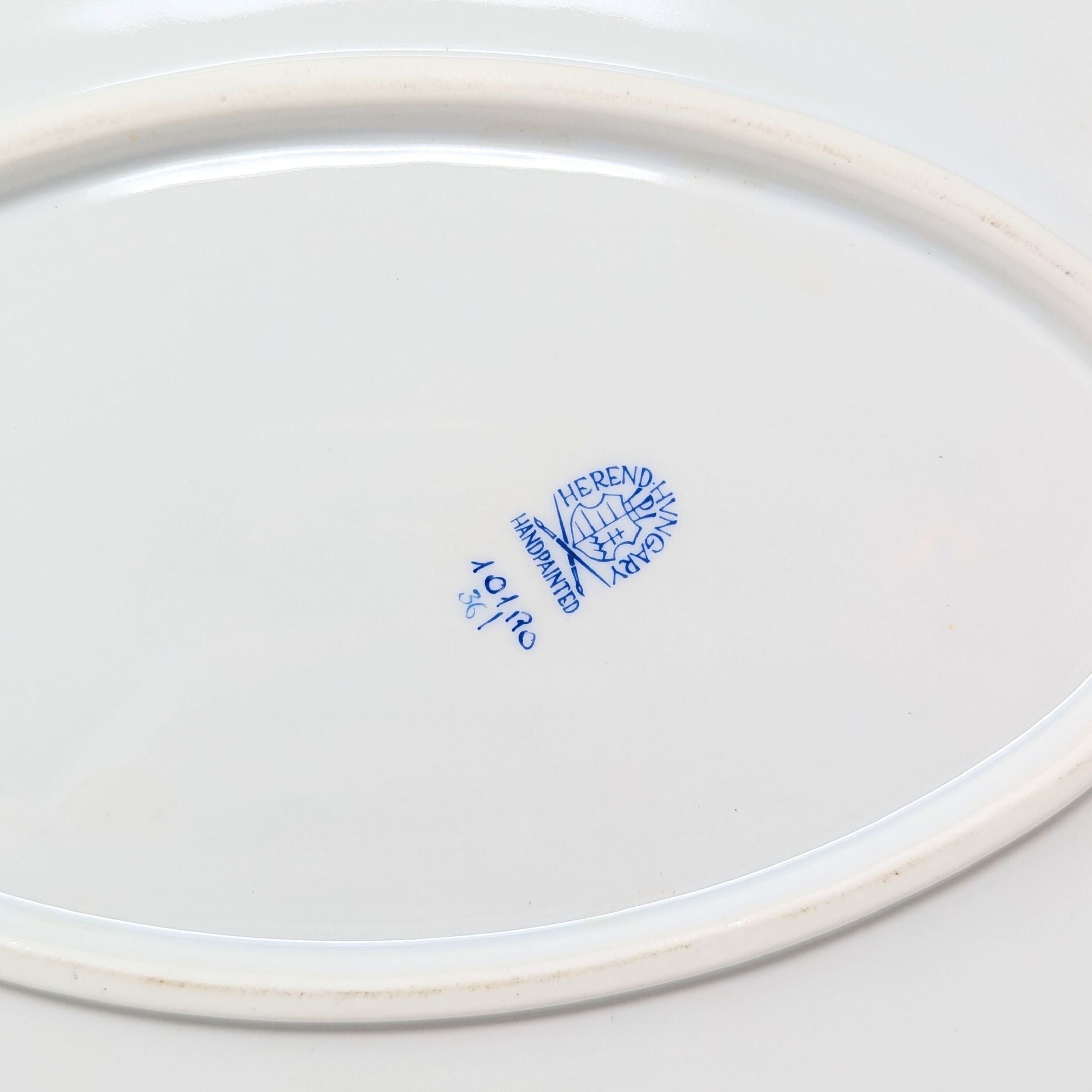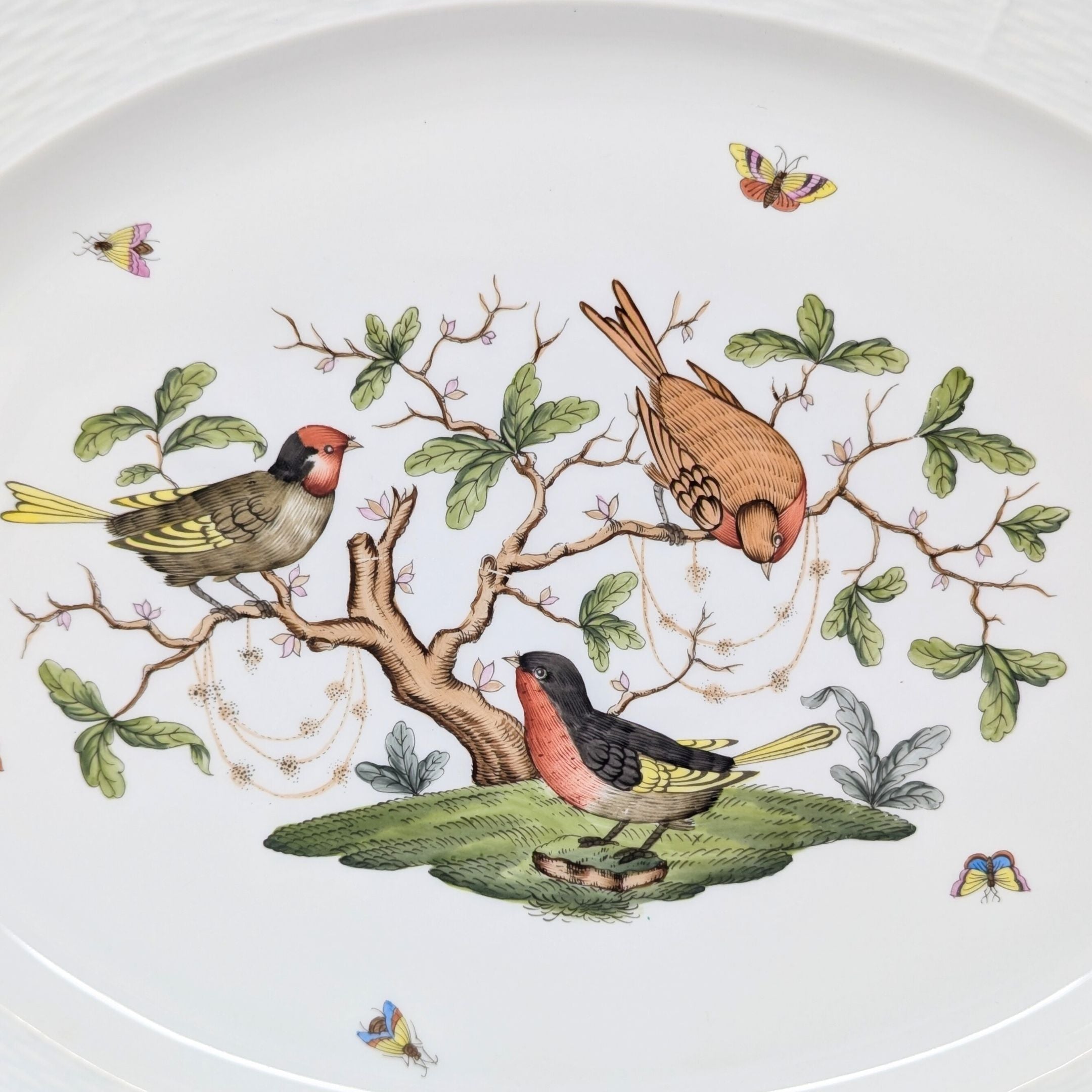 Details: Large oval platter with scalloped basketweave edge. Edge is decorated at intervals with small butterflies. Center features a vignette with three birds among tree branches, golden chains dangling from the branches. More insects surround the central motif. A fine gold band adorns the outer edge of the platter. The underside of the edge hides additional small insects. Back is marked with the Herend blue mark, the number 101 beneath.