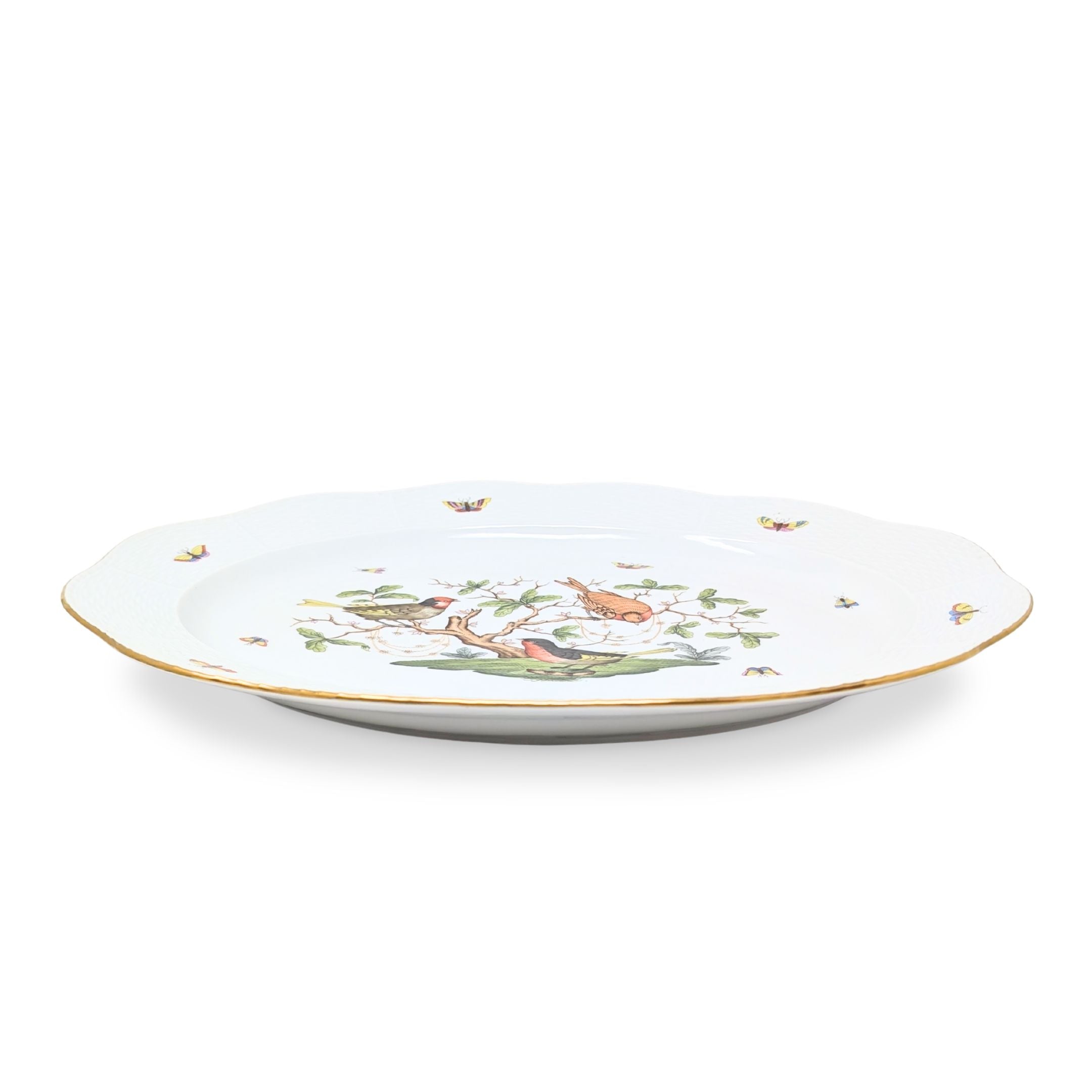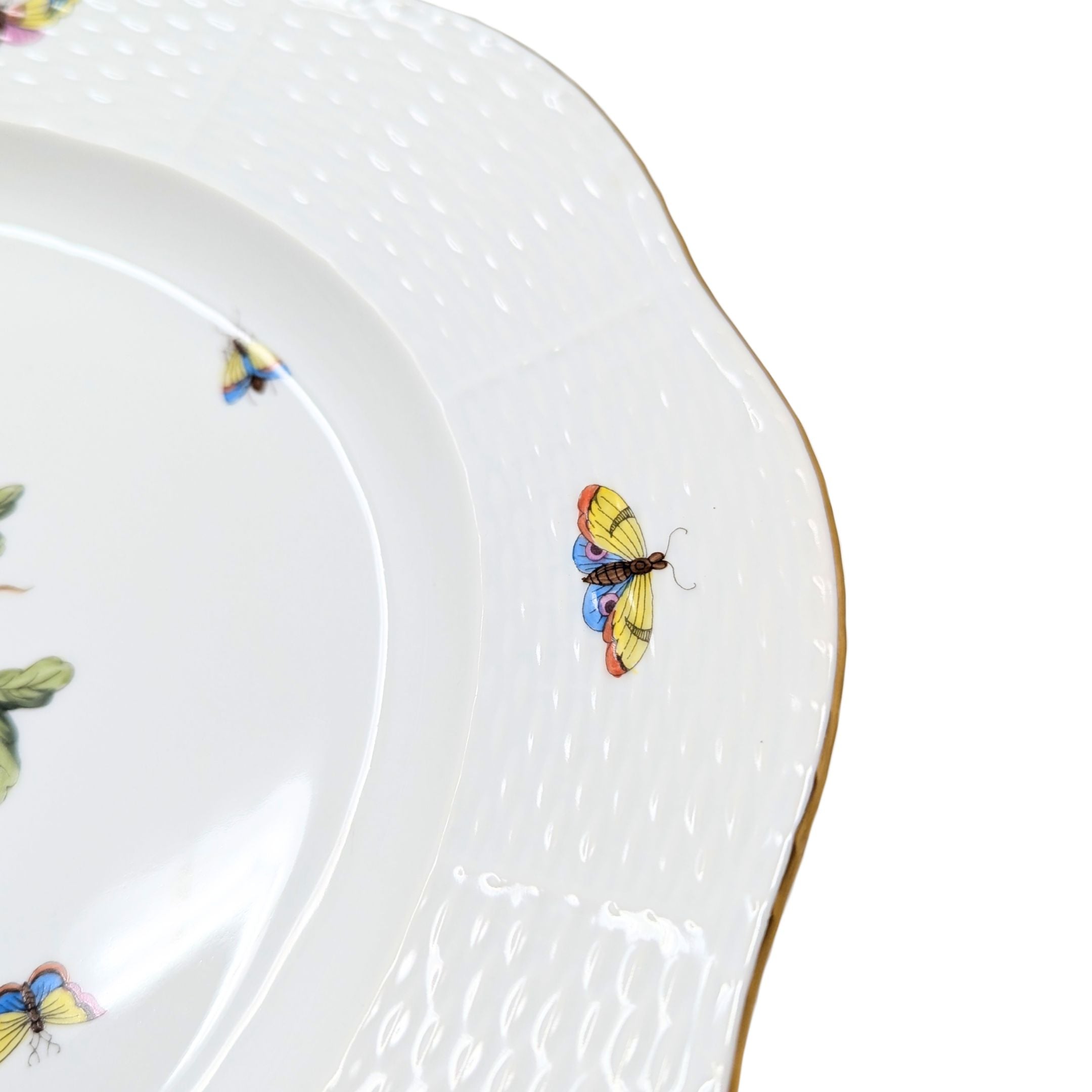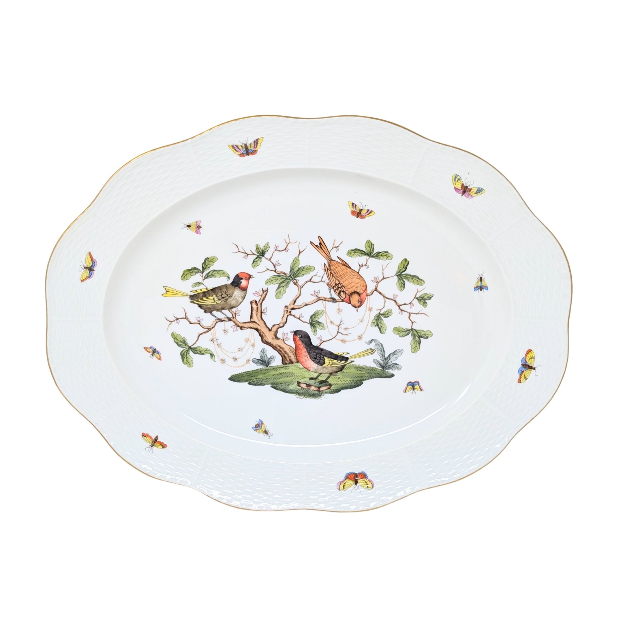 Details: Large oval platter with scalloped basketweave edge. Edge is decorated at intervals with small butterflies. Center features a vignette with three birds among tree branches, golden chains dangling from the branches. More insects surround the central motif. A fine gold band adorns the outer edge of the platter. The underside of the edge hides additional small insects. Back is marked with the Herend blue mark, the number 101 beneath.