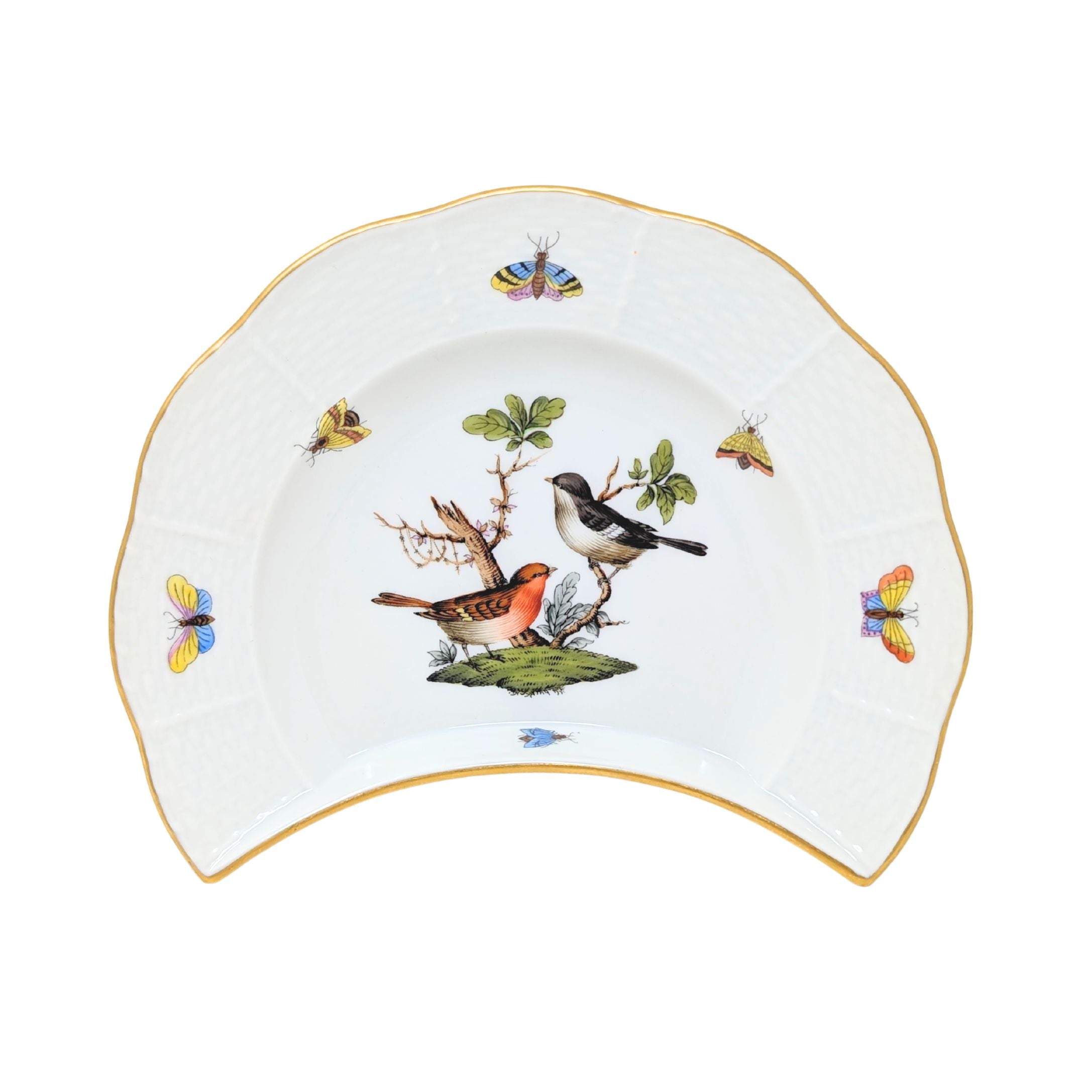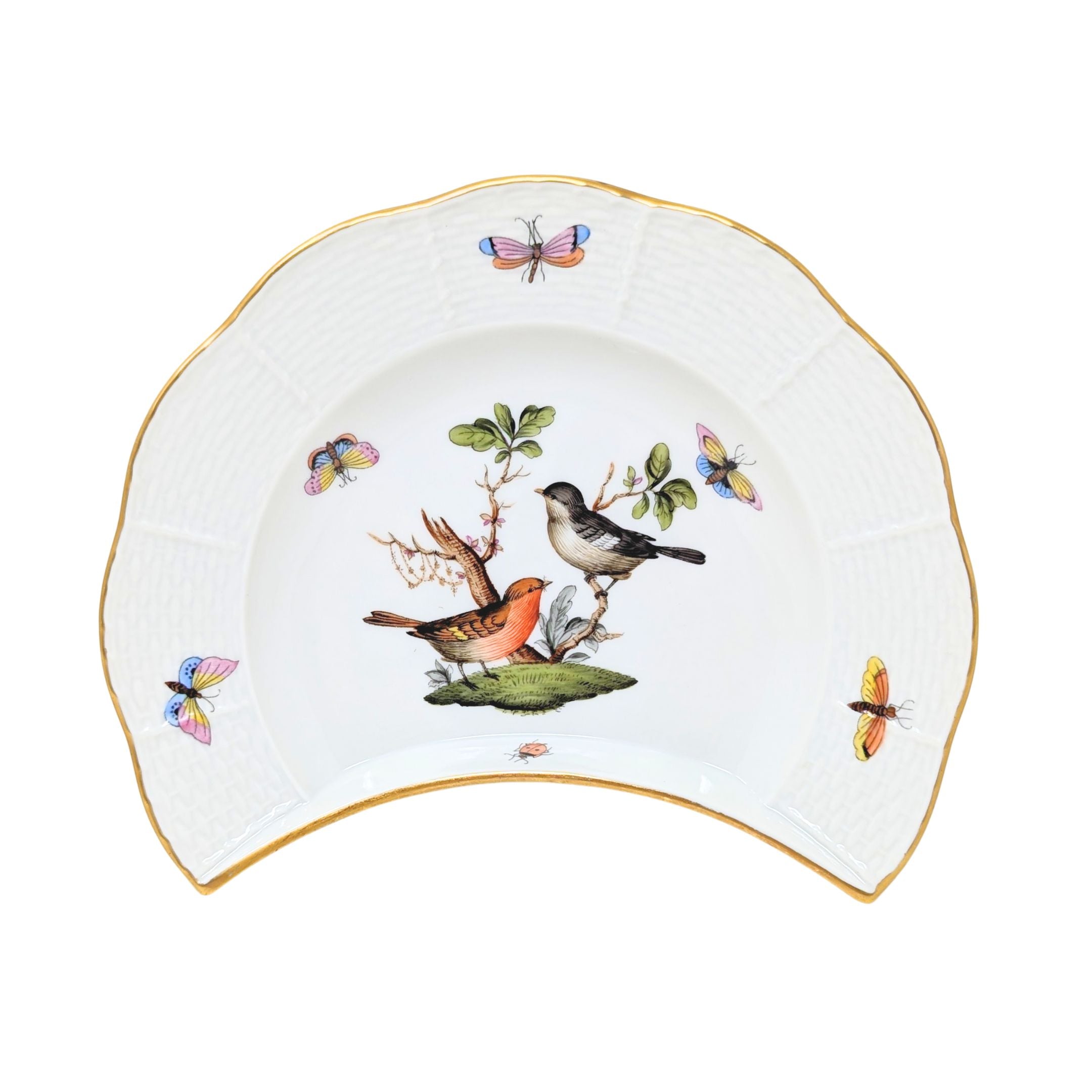 Details: A unique addition to a holiday dinner setting, the crescent salad plates are made of white porcelain. The set comprises four salad plates, crescent-shaped with the classic Herend basketweave around the rim. All four plates are painted with an identical central design of a pair of birds perched on twigs, a pearl necklace draped among the branches. The scattered butterflies and other insects are slightly different on each plate. A narrow gold band adorns the rim of each piece. Each piece is marked on bottom with Herend's blue mark, and hand-numbered.