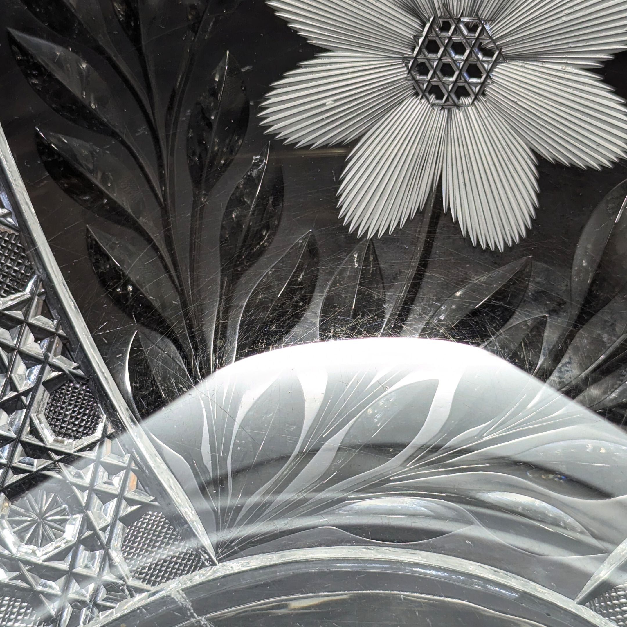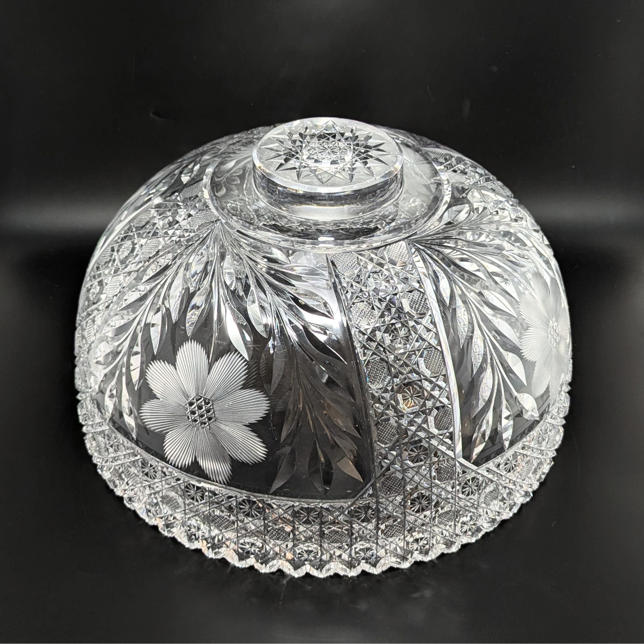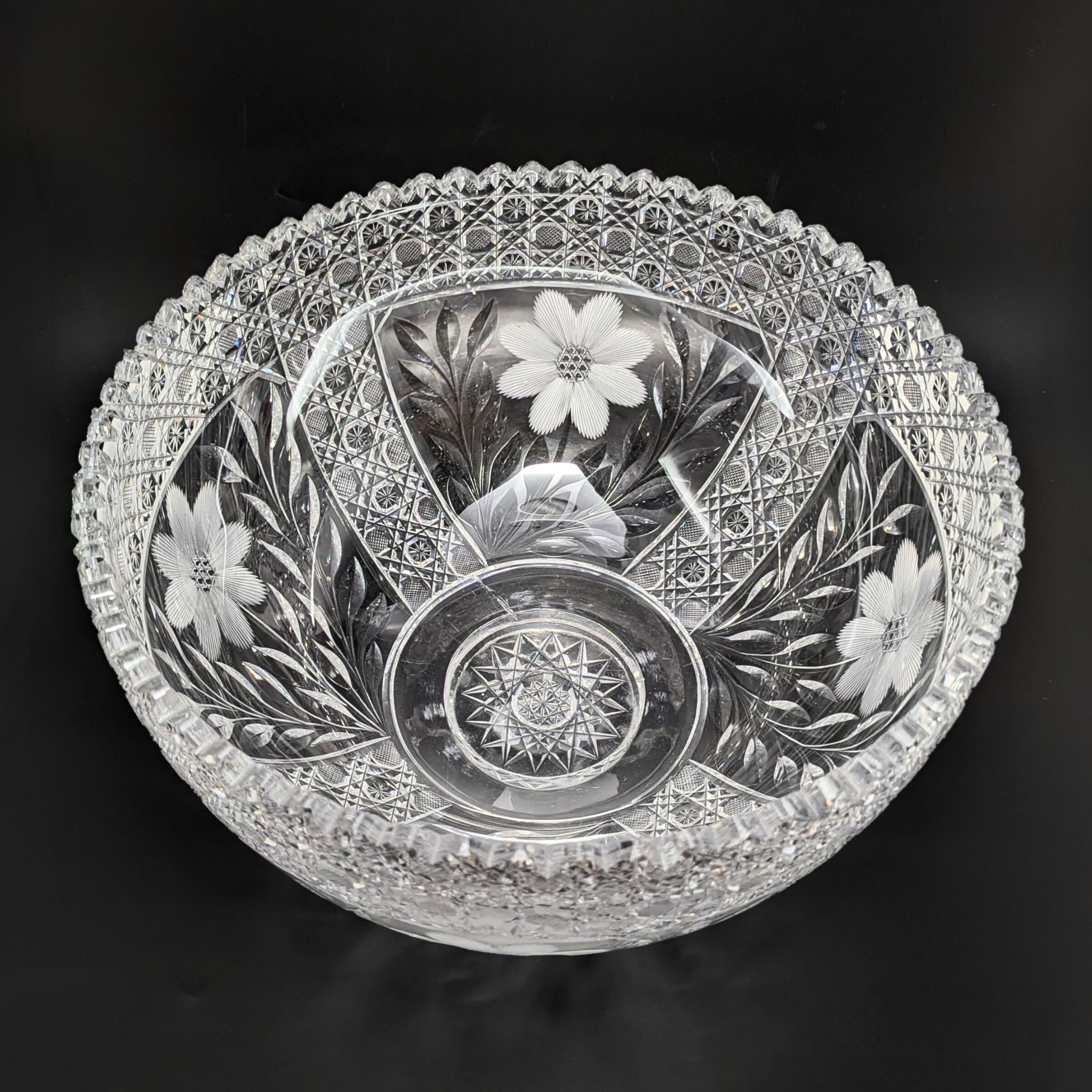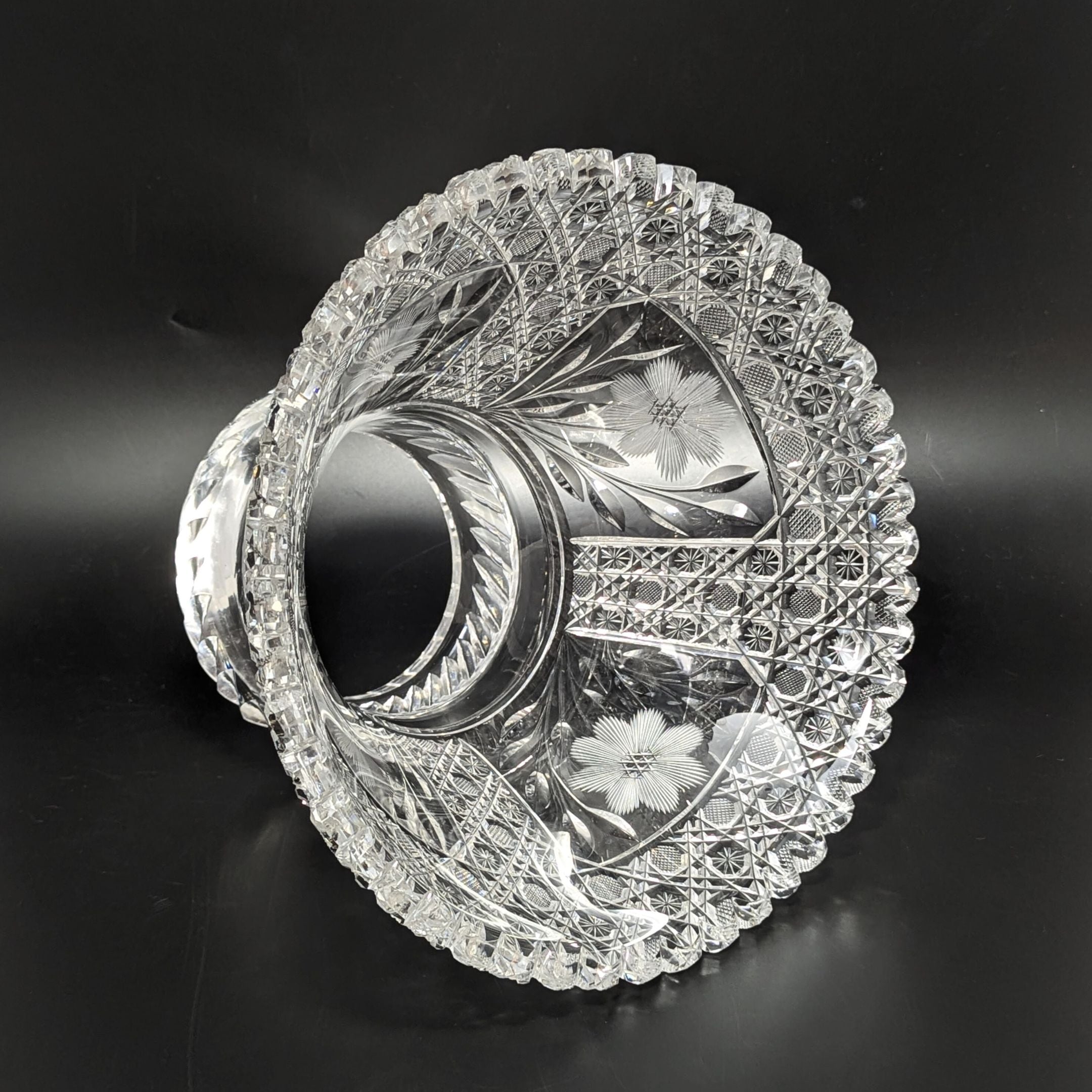 Details: Very large stunning American Brilliant Period punchbowl on separate stand. Bowl has crosshatch or cane design cuts around rim and in four straps joining at center on bottom. Quadrants are decorated with a cut and engraved floral design. Central 3/4" foot on bowl is cut on a pinwheel design. Inverted conical base has a thick diagonally cut collar above a flaring foot cut and engraved to match the bowl.