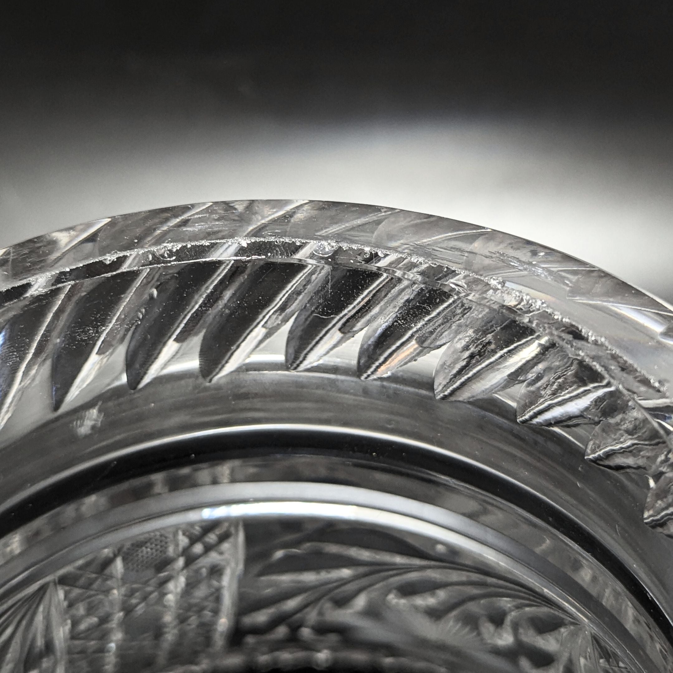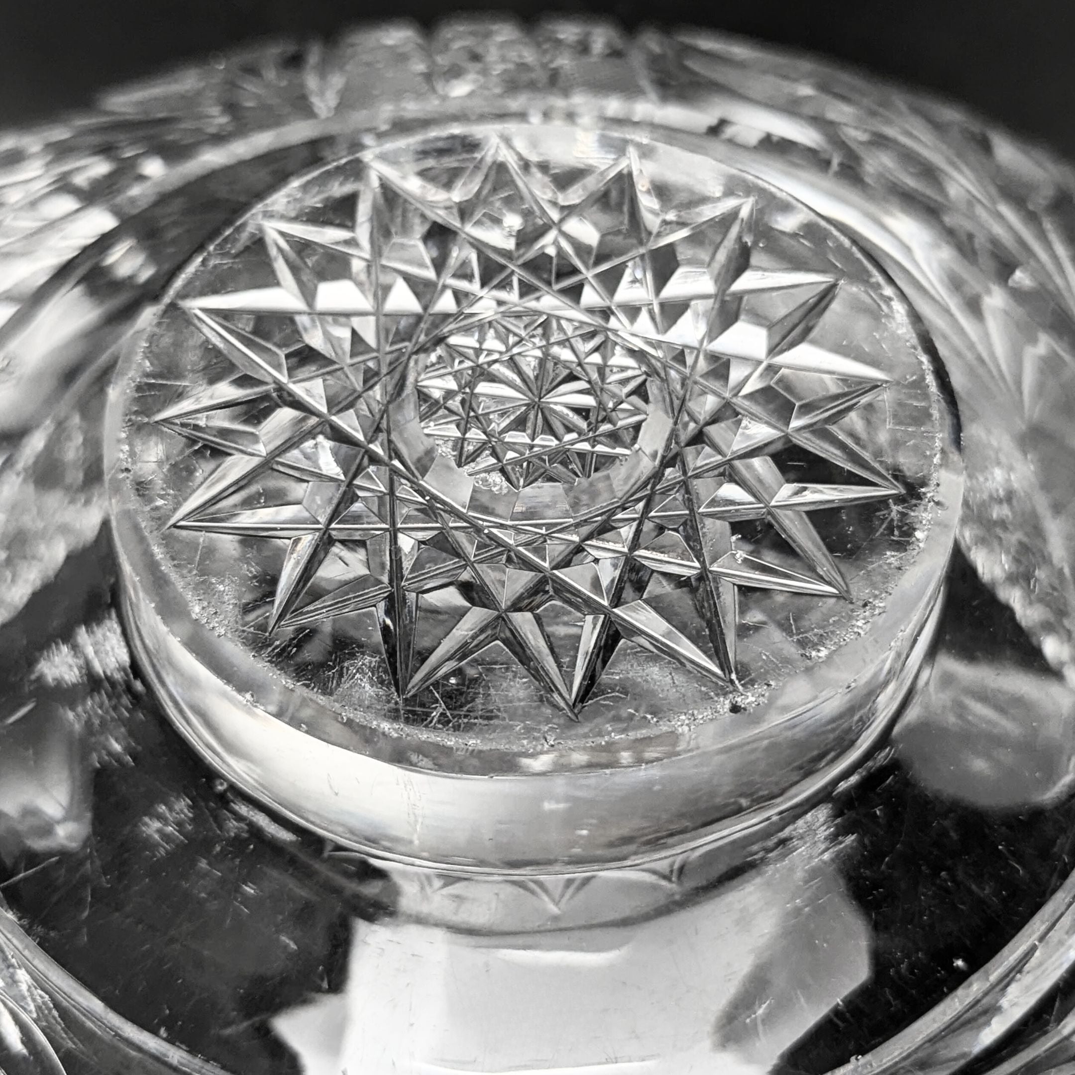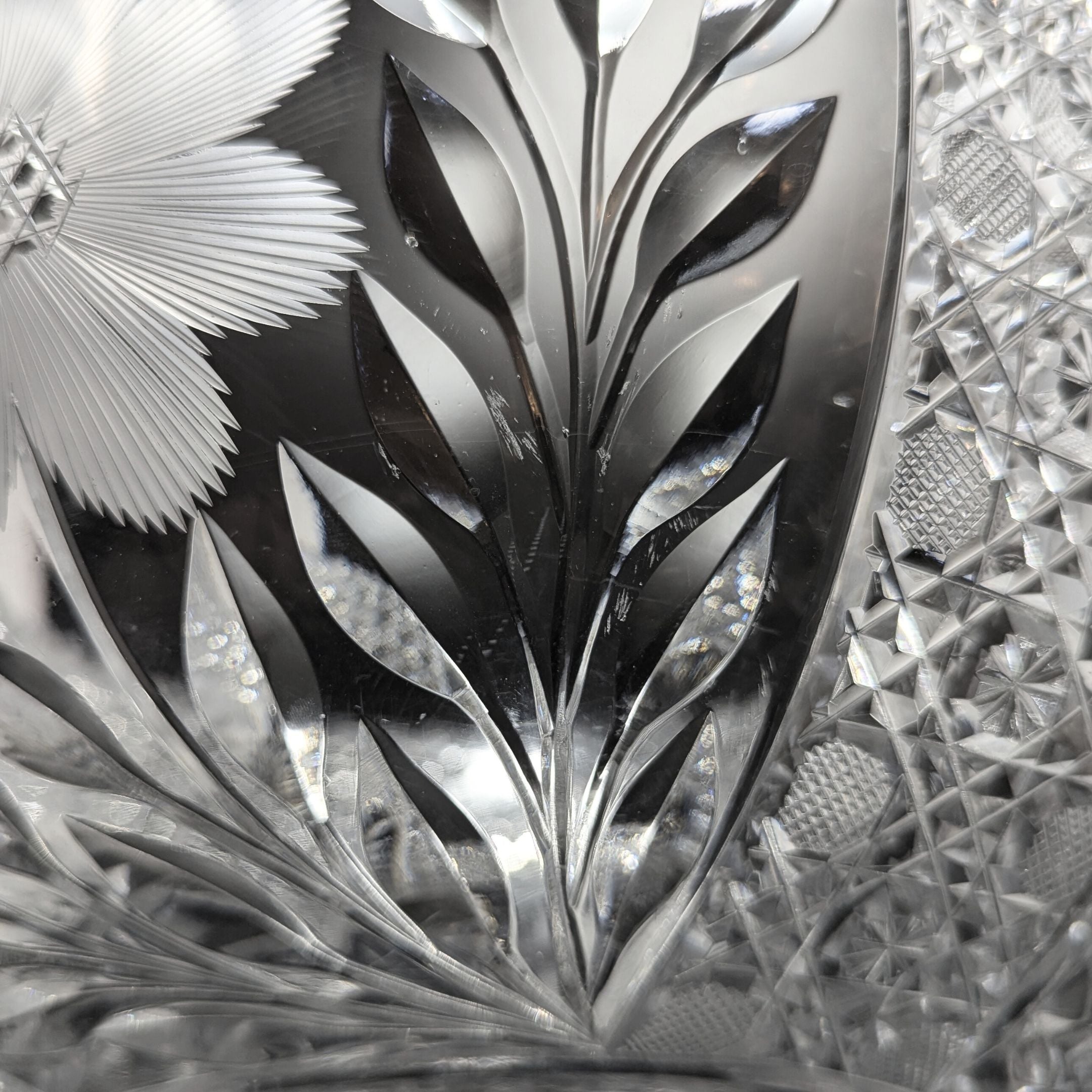 Details: Very large stunning American Brilliant Period punchbowl on separate stand. Bowl has crosshatch or cane design cuts around rim and in four straps joining at center on bottom. Quadrants are decorated with a cut and engraved floral design. Central 3/4" foot on bowl is cut on a pinwheel design. Inverted conical base has a thick diagonally cut collar above a flaring foot cut and engraved to match the bowl.