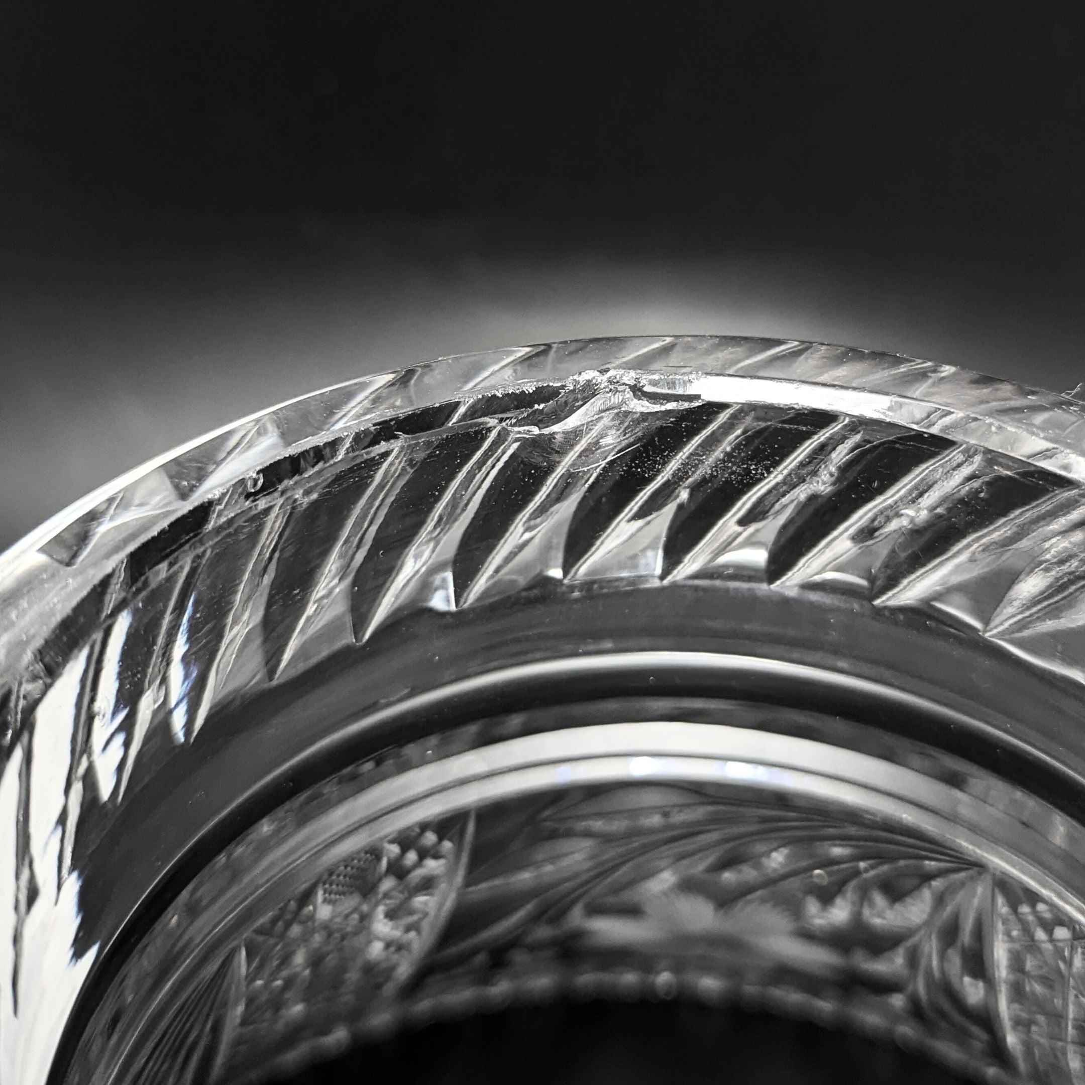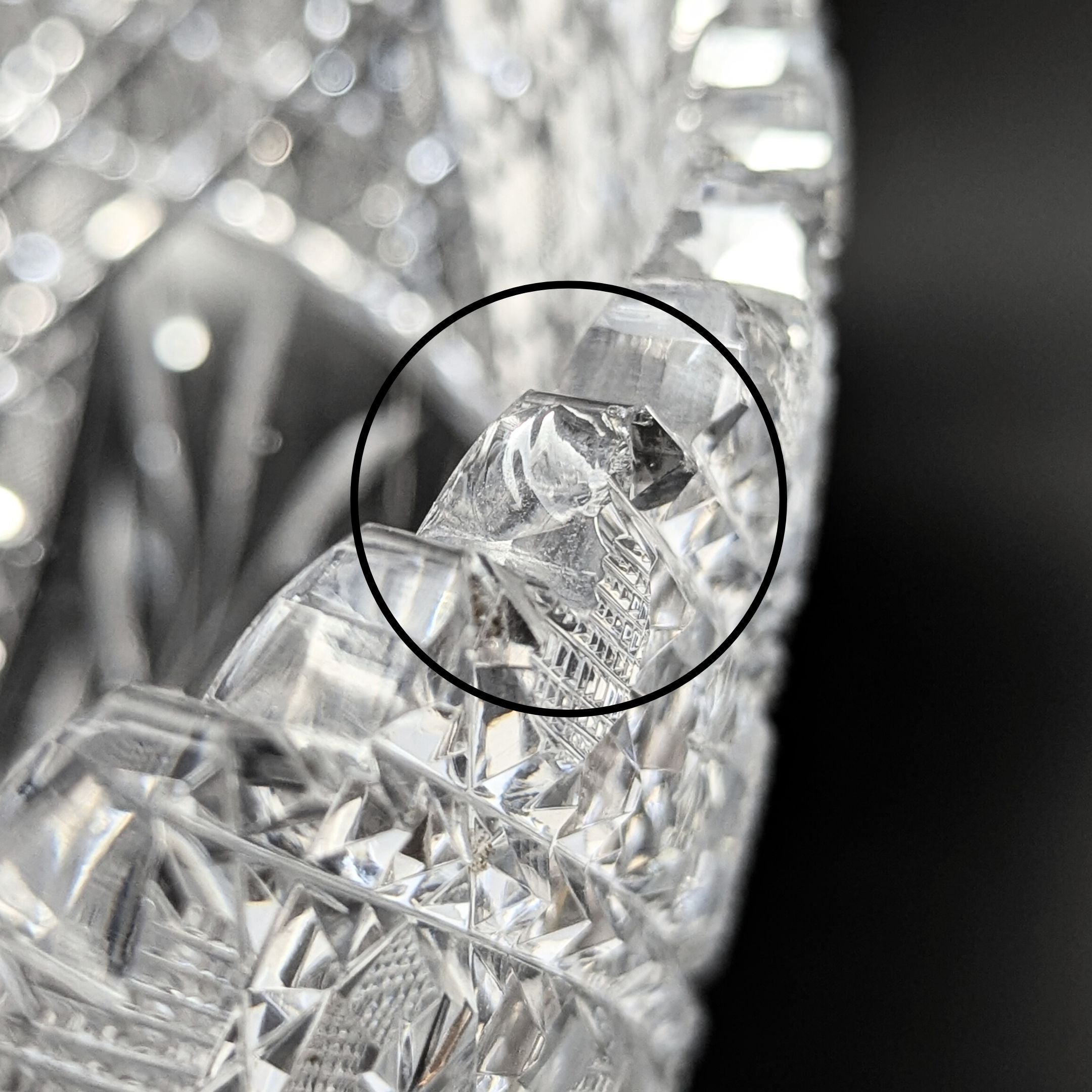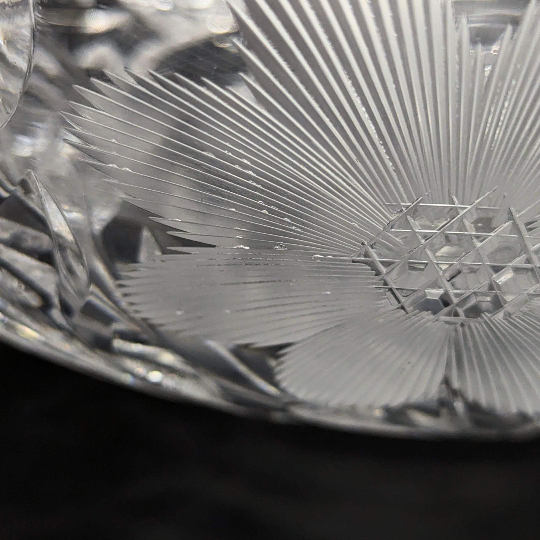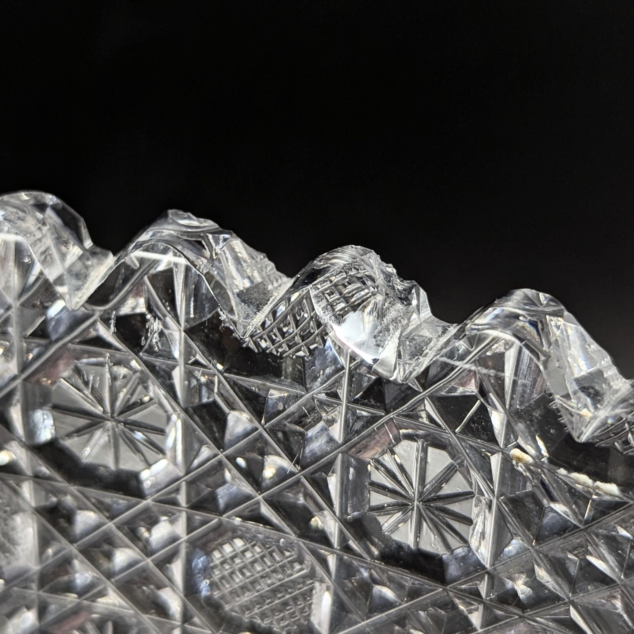 Details: Very large stunning American Brilliant Period punchbowl on separate stand. Bowl has crosshatch or cane design cuts around rim and in four straps joining at center on bottom. Quadrants are decorated with a cut and engraved floral design. Central 3/4" foot on bowl is cut on a pinwheel design. Inverted conical base has a thick diagonally cut collar above a flaring foot cut and engraved to match the bowl.