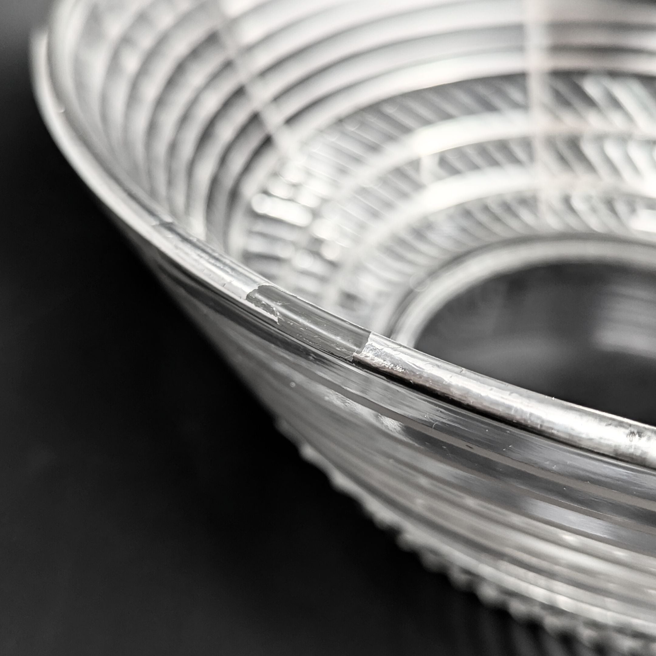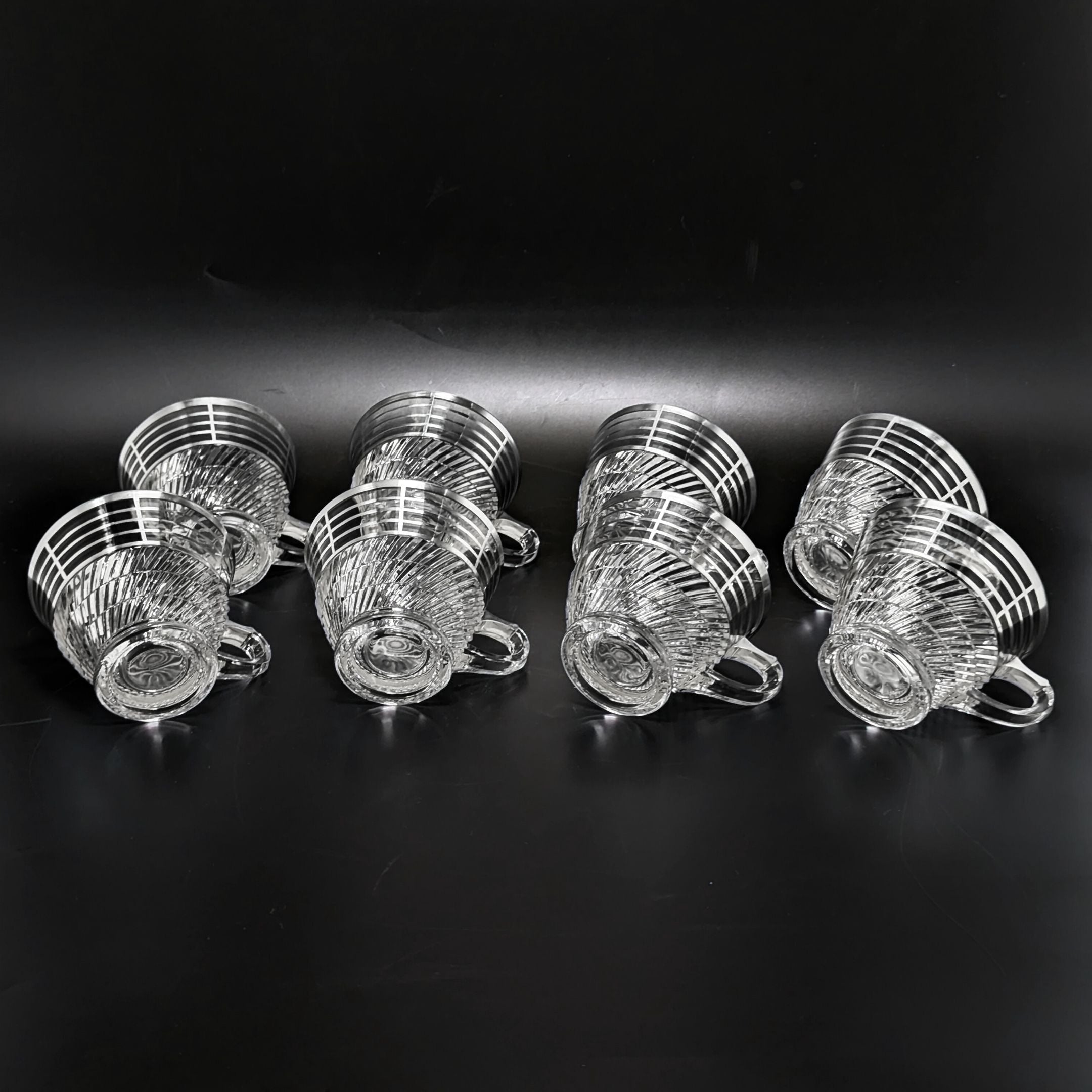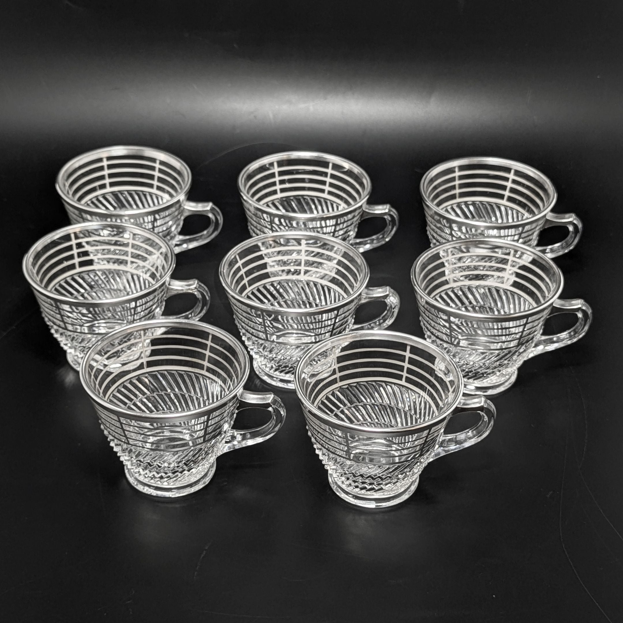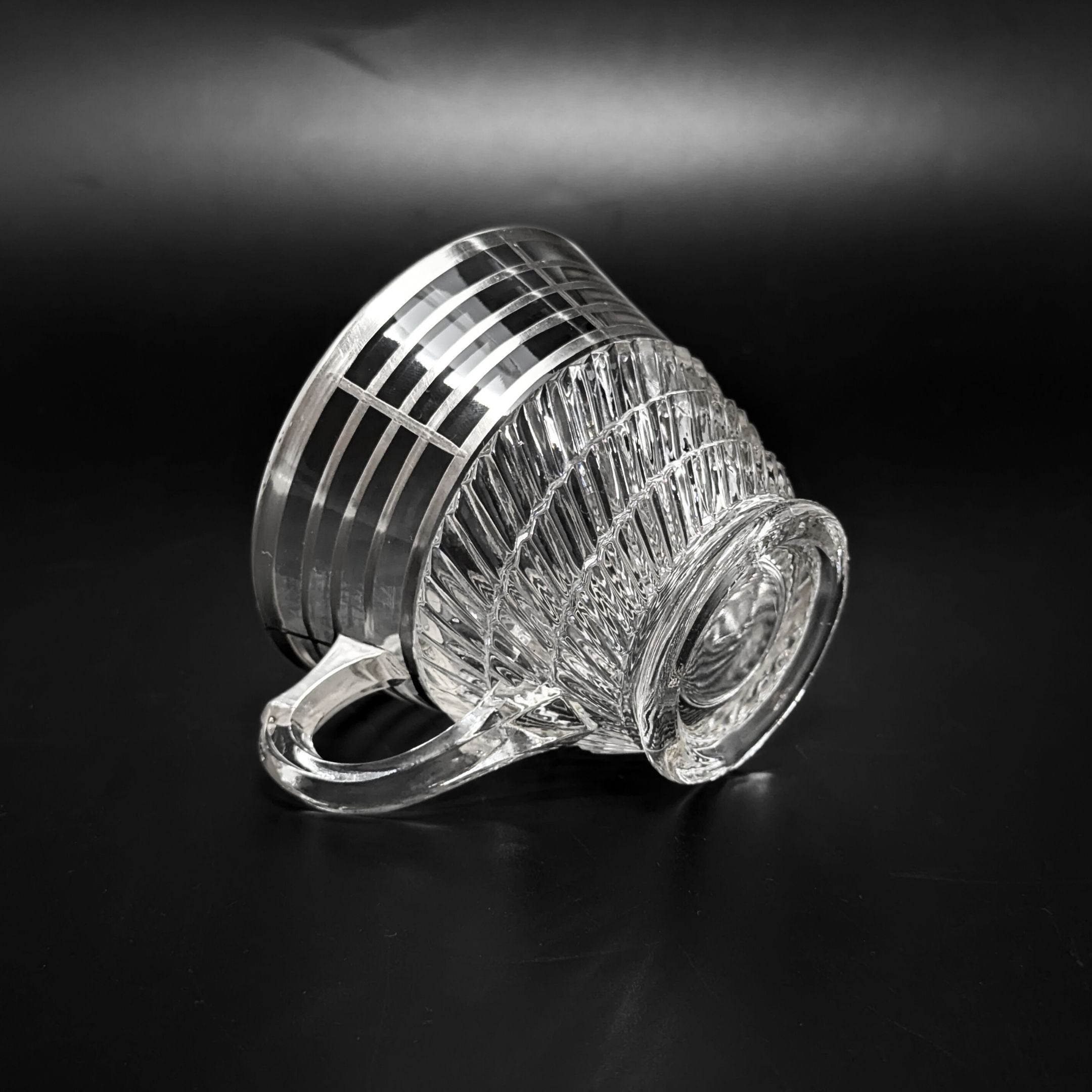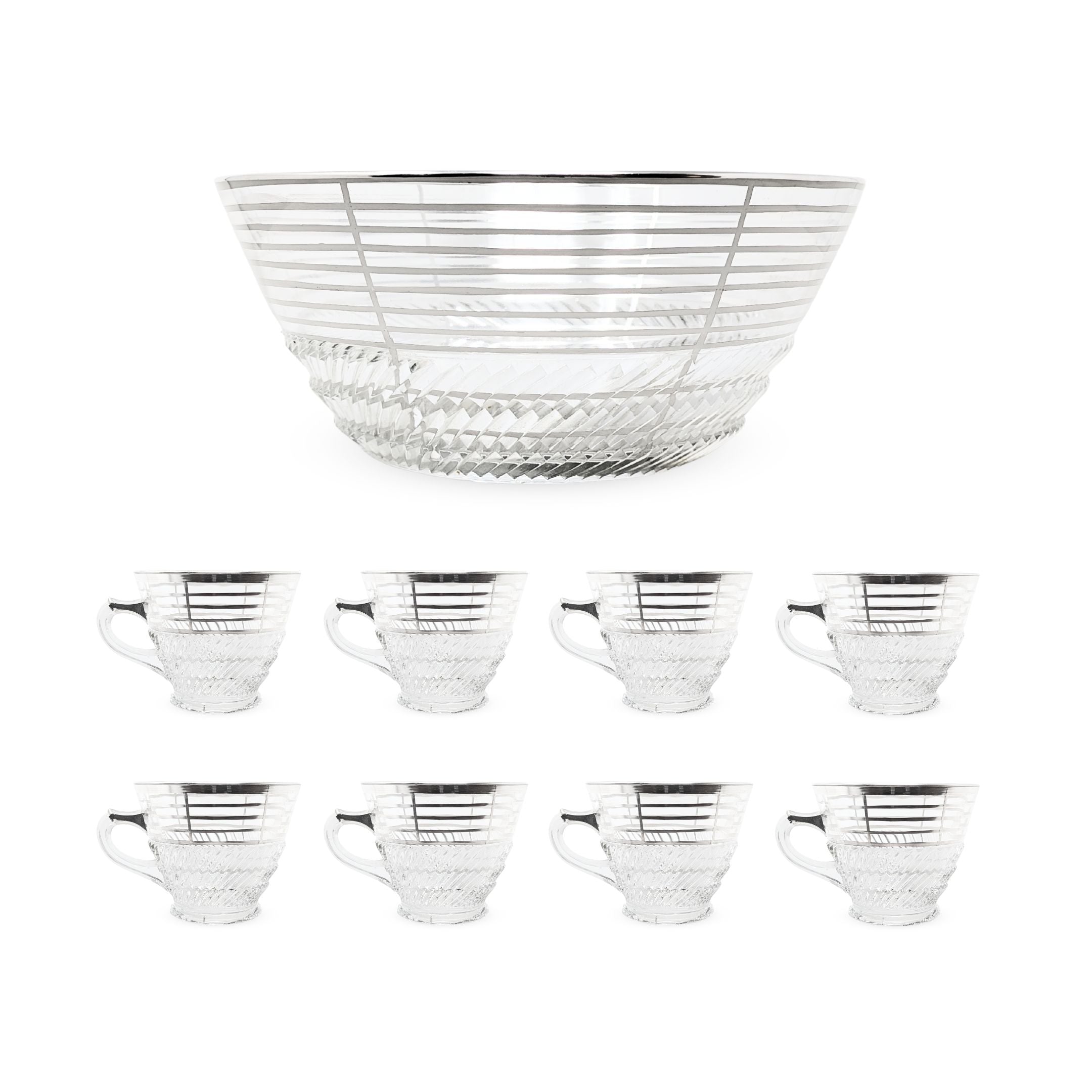 Details: Set a jazzy tone for your next cocktail party or family get-together! Wide, nearly conical clear glass bowl with three rows of a broken diagonal rib design on the bottom half, smooth glass up to edge. Cups feature the same pressed design, with notched handles. Bowl and cups are decorated with sterling silver overlay in a clean, modified grid design.  The overlay is on the outside of the upper half of the cups, it is applied to the rim and the inside of the bowl. There are no discernible maker's marks on any of the pieces.