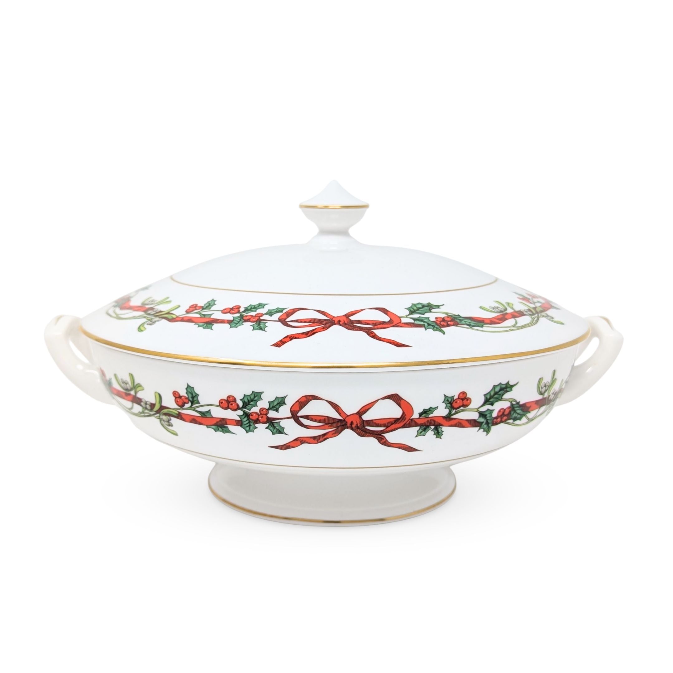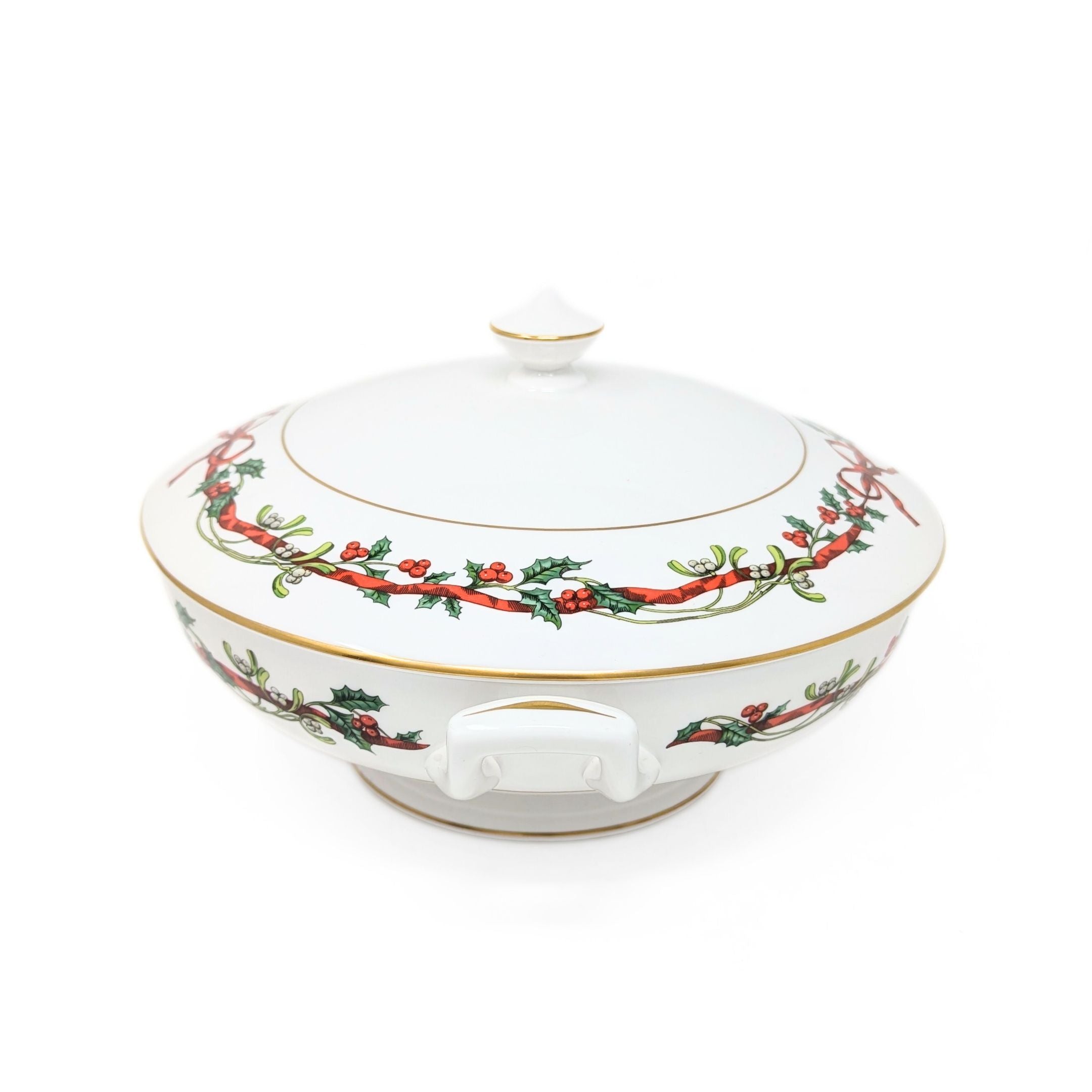 Details: Round, footed white porcelain serving bowl with upturned side handles and domed lid. Decoration at top rim of bowl and at rim of lid comprises delicate bright red ribbons intertwined with holly sprigs and mistletoe, terminating in a soft bow. Lid is surmounted by a pointed top-shaped knob. Fine gold trim. Marked on bottom with Royal Worcester's stamp.