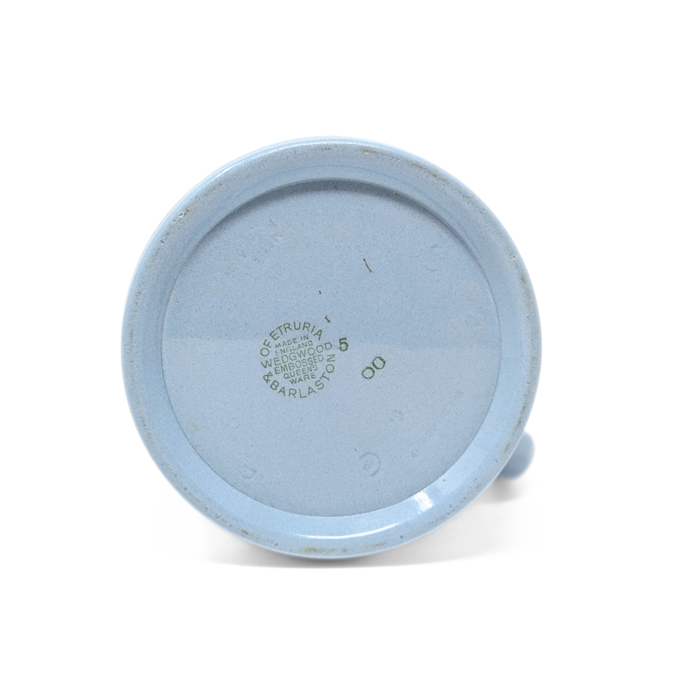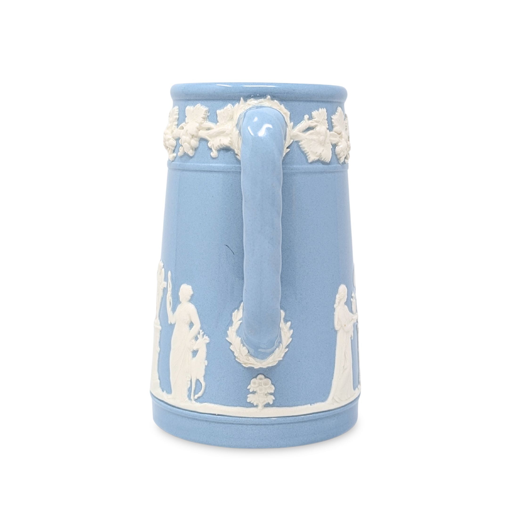 Details:  Pale blue (lavender) tankard-shaped pitcher with rope-twist handle. Applied cream-color grapevine border around top edge.  Applied bas-relief design of classical figures with floral elements and a tree centered under the spout.  "WEDGWOOD" and "MADE IN ENGLAND" stamped into the clay on the bottom, just discernible under layers of glaze.  Green circular mark "WEDGWOOD OF ETRURIA & BARLASTON MADE IN ENGLAND EMBOSSED QUEENS WARE".