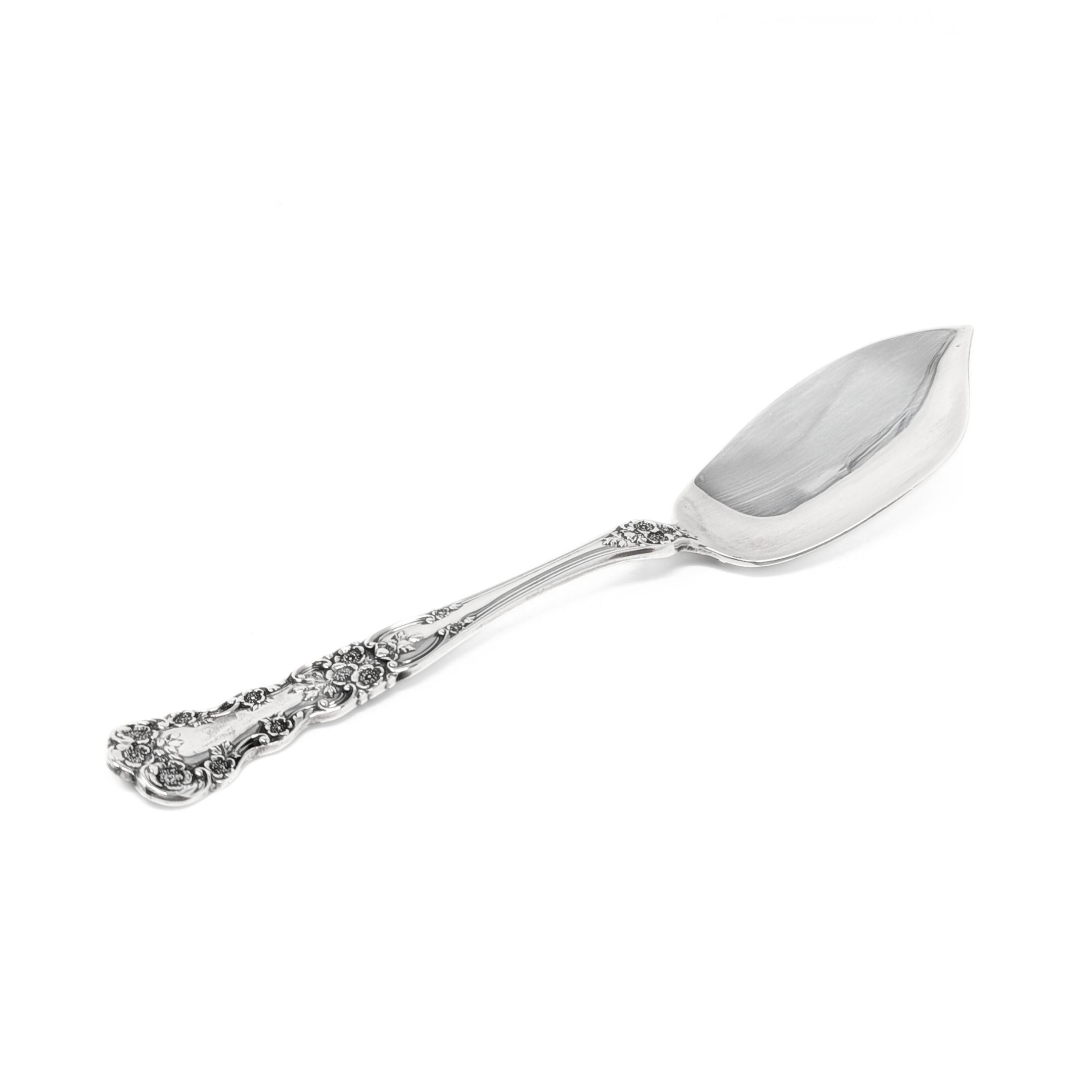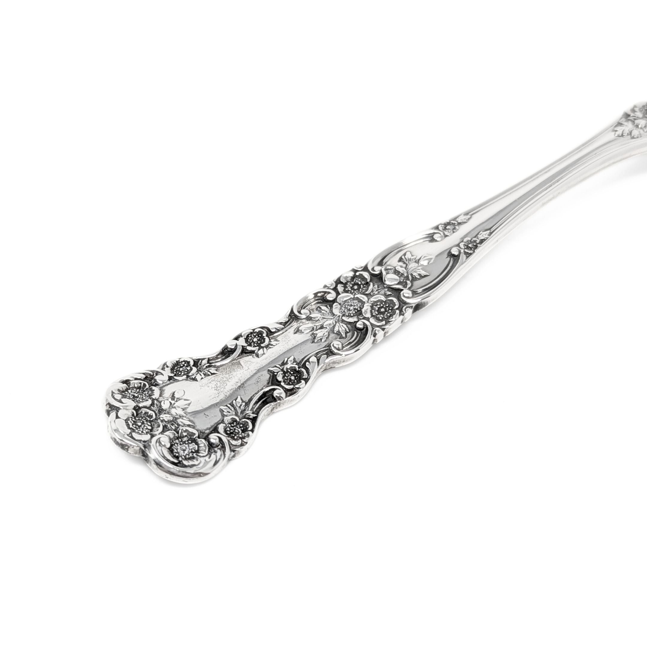 Details: The Gorham Buttercup pattern was introduced in 1899 and features a delicate floral design with buttercup blossoms, scrolls, and leaves. It was produced during a period of popular Greco-Roman applied art and has remained a popular, timeless design for over a century due to its intricate and elegant craftsmanship. It is still produced today and remains a top-seller.