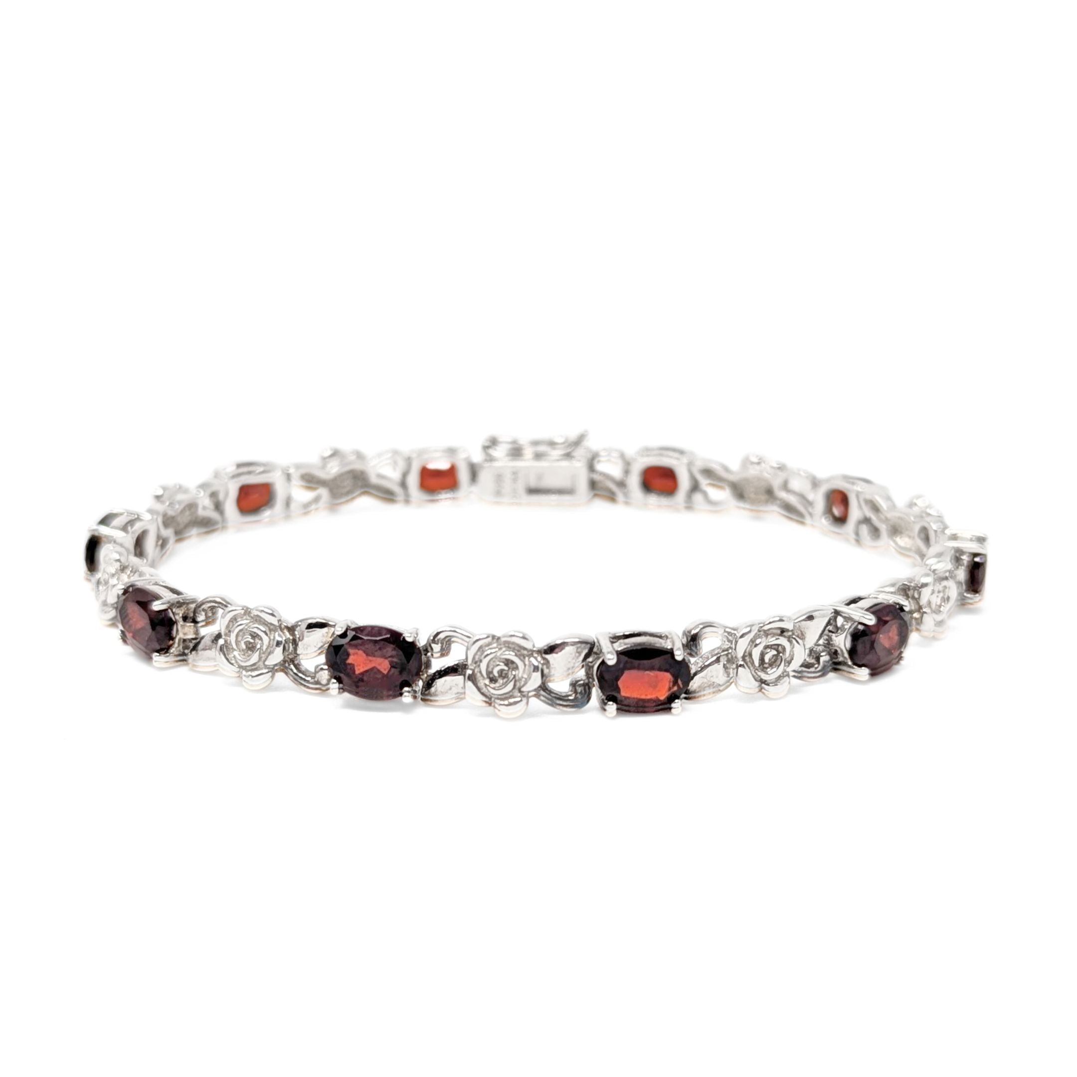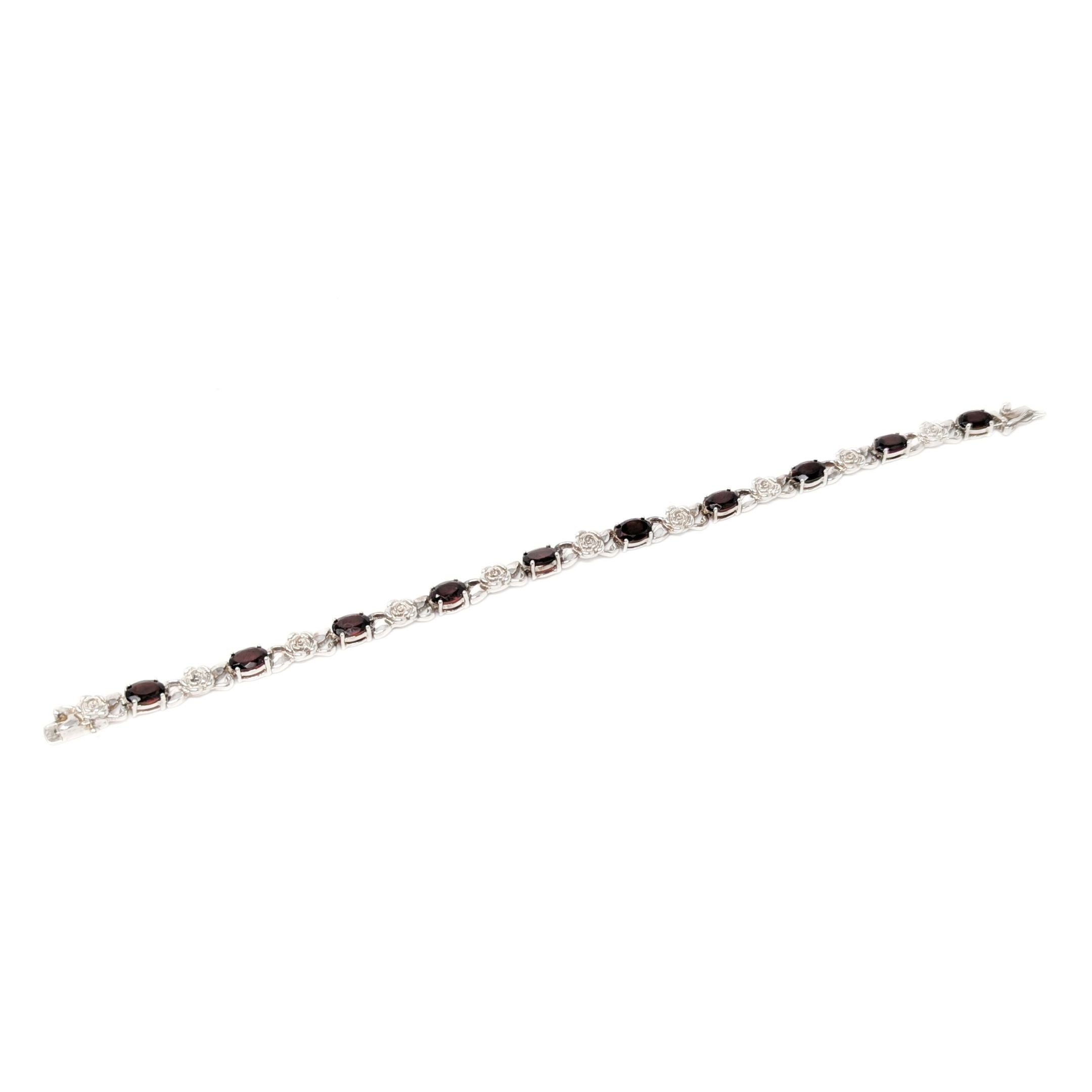 Details: Beautiful sterling silver bracelet featuring a delicate alternating pattern of garnets and rose motif links.