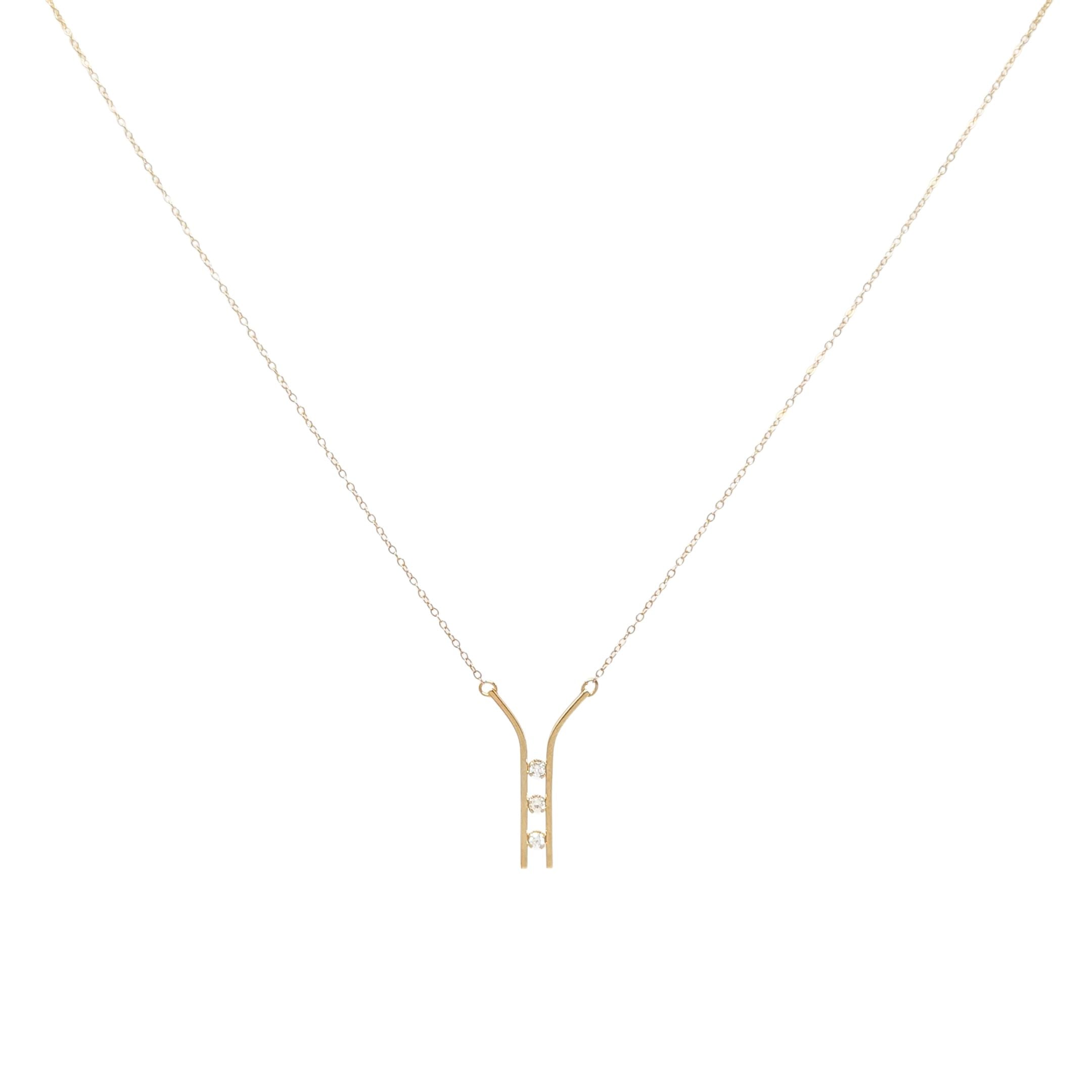 Details: A sleek and minimalist vintage necklace with a unique, fixed Y-Shaped bar pendant showcasing three round brilliant cut natural diamonds.