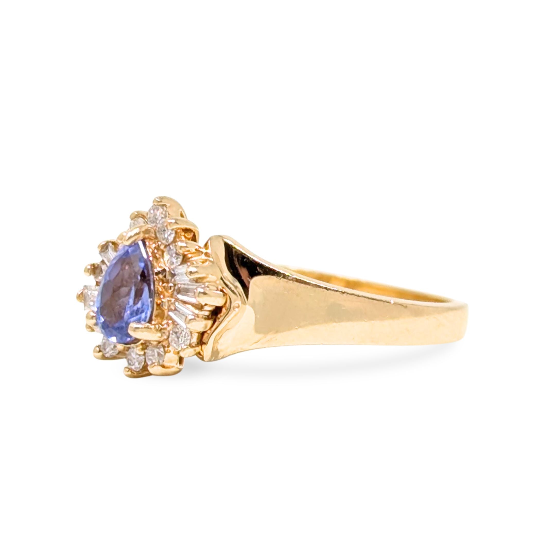 Details: Lovely ring featuring a pear cut Iolite surrounded by baguette and round brilliant cut diamonds.