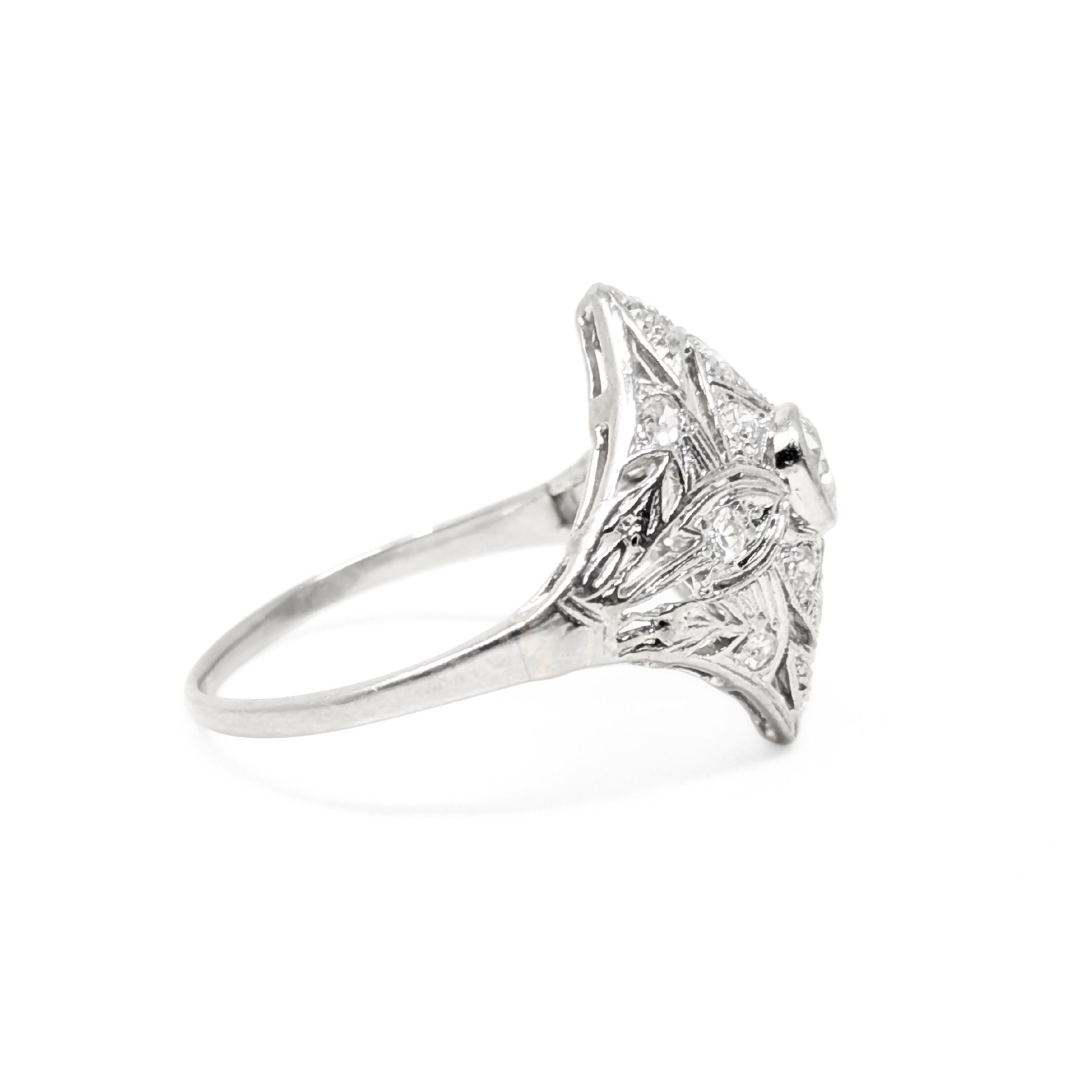 Details: A stunning antique diamond ring. All hand pierced, engraved, and set with milligrain detailing. Papers from 2009 are included appraising the ring at $3200. Absolutely no disappointments!