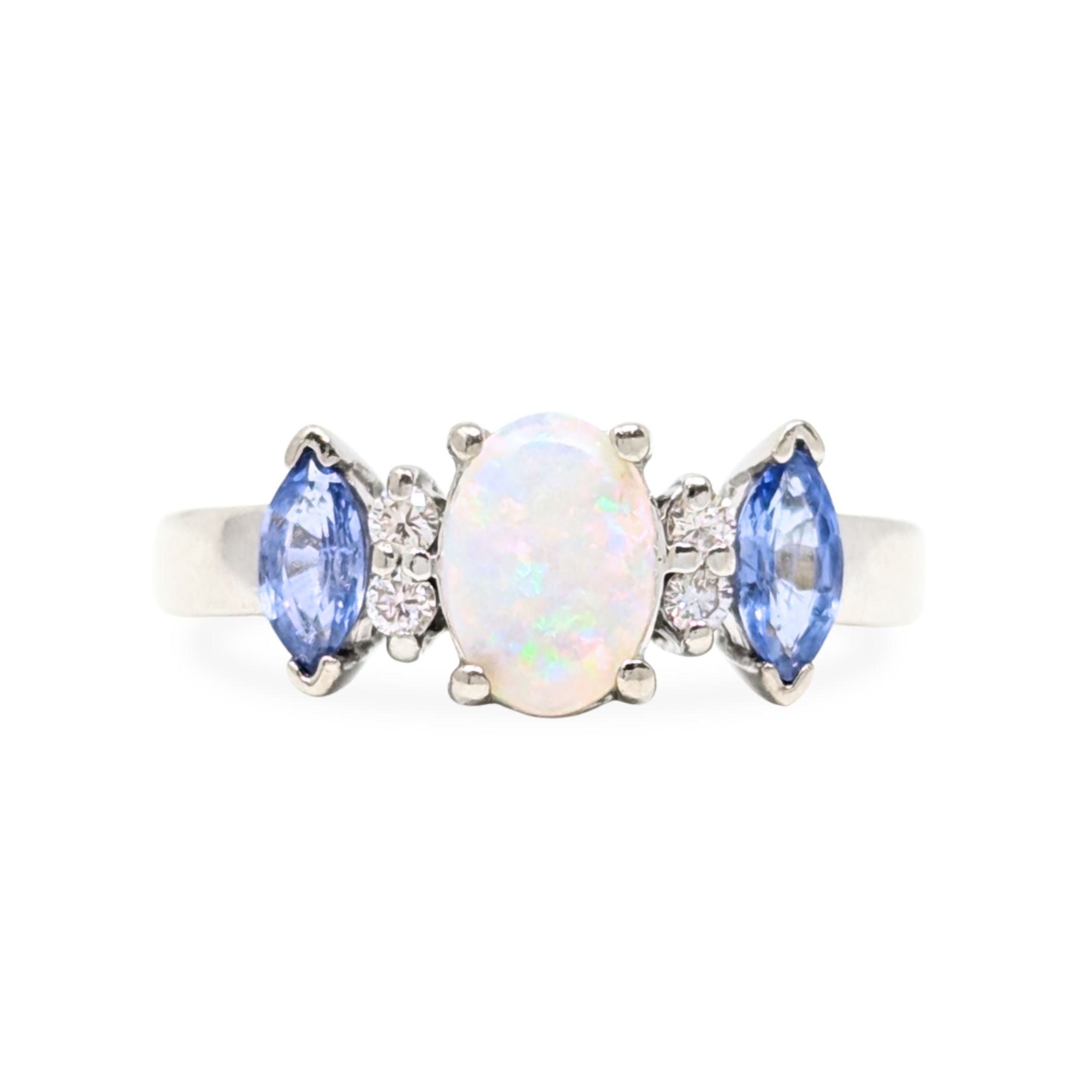 Stone(s): Opal, 4 brilliant cut round diamonds, and 2 marquee cut light blue topaz