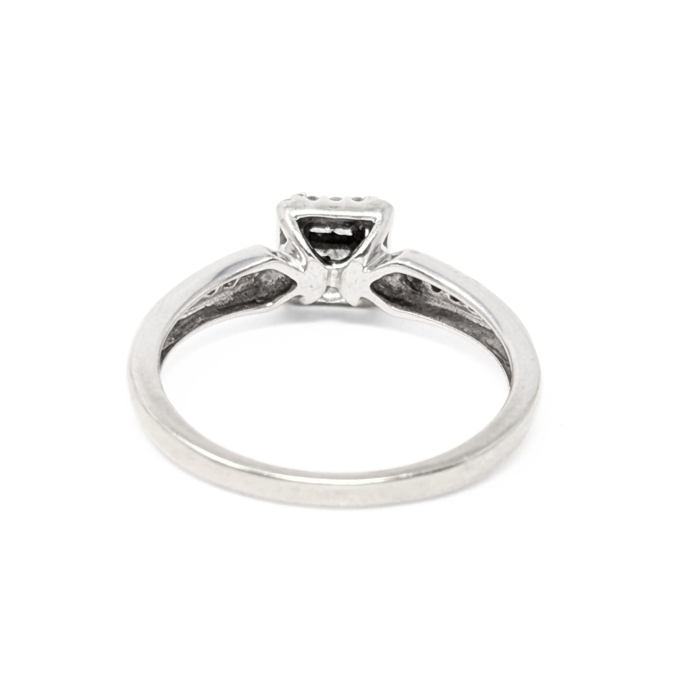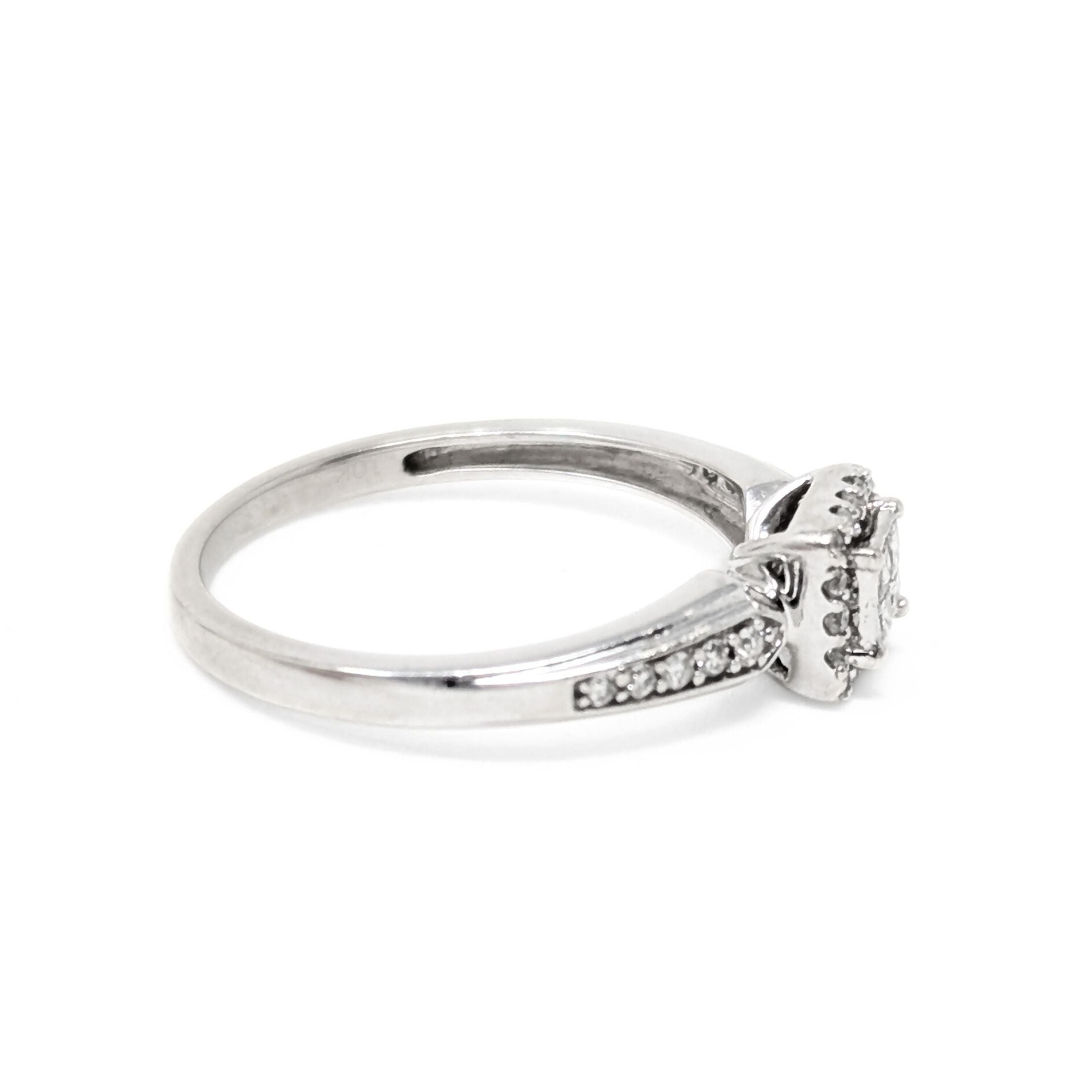 Details: Four princess cut natural diamonds create the center of this gorgeous 10K white gold cluster ring and are framed by a halo of round cut diamonds. Perfect for an engagement ring, promise ring, or a beautiful addition to any collection.