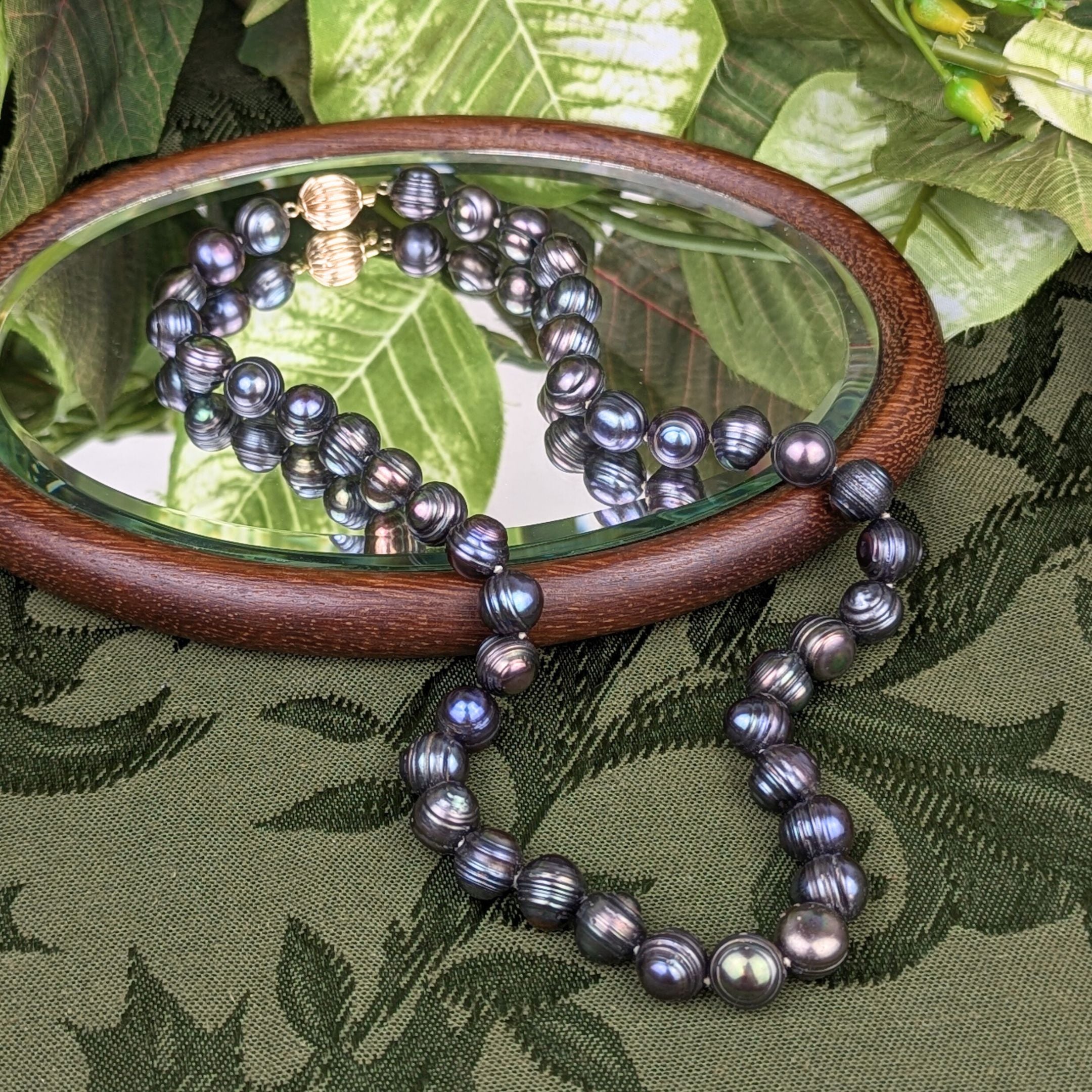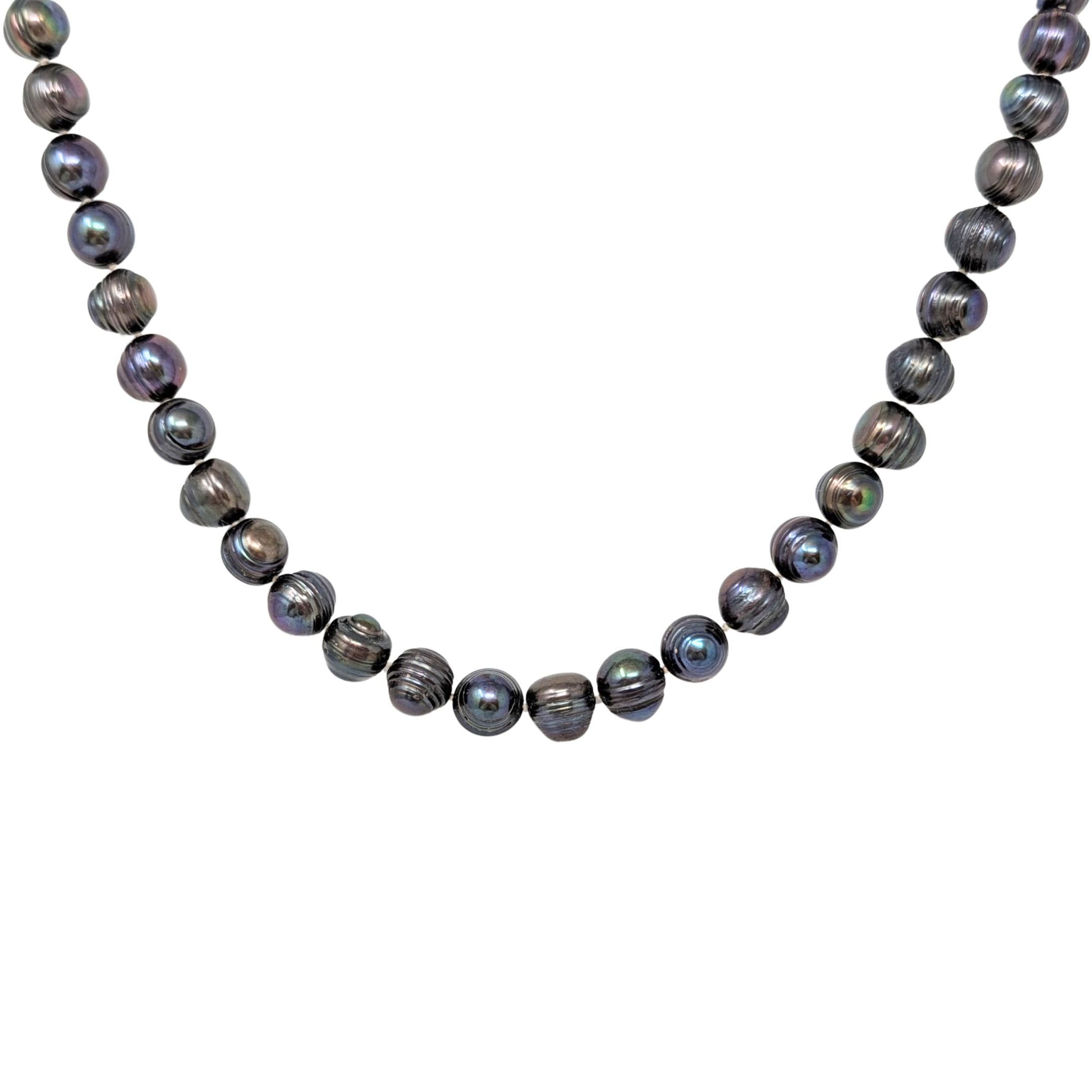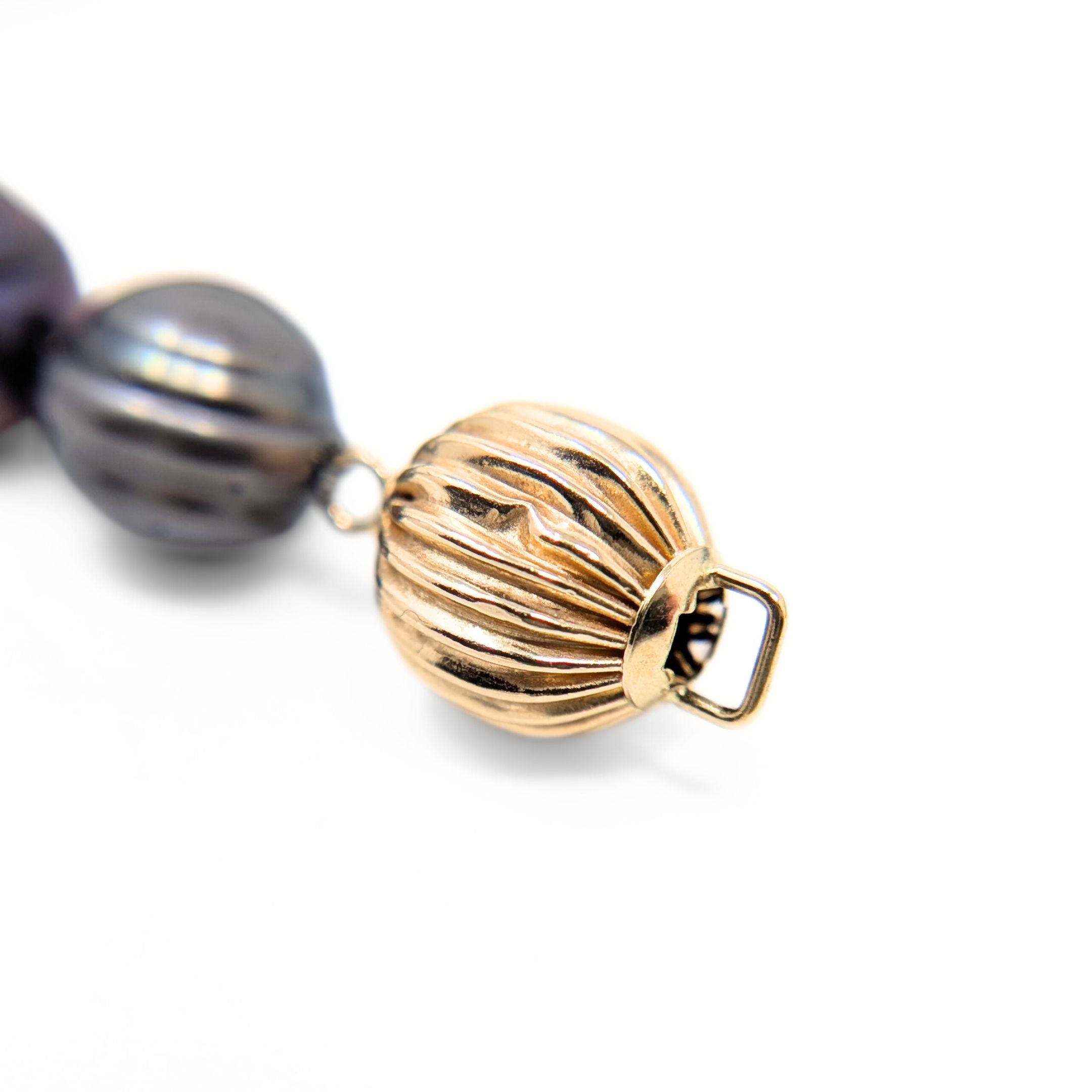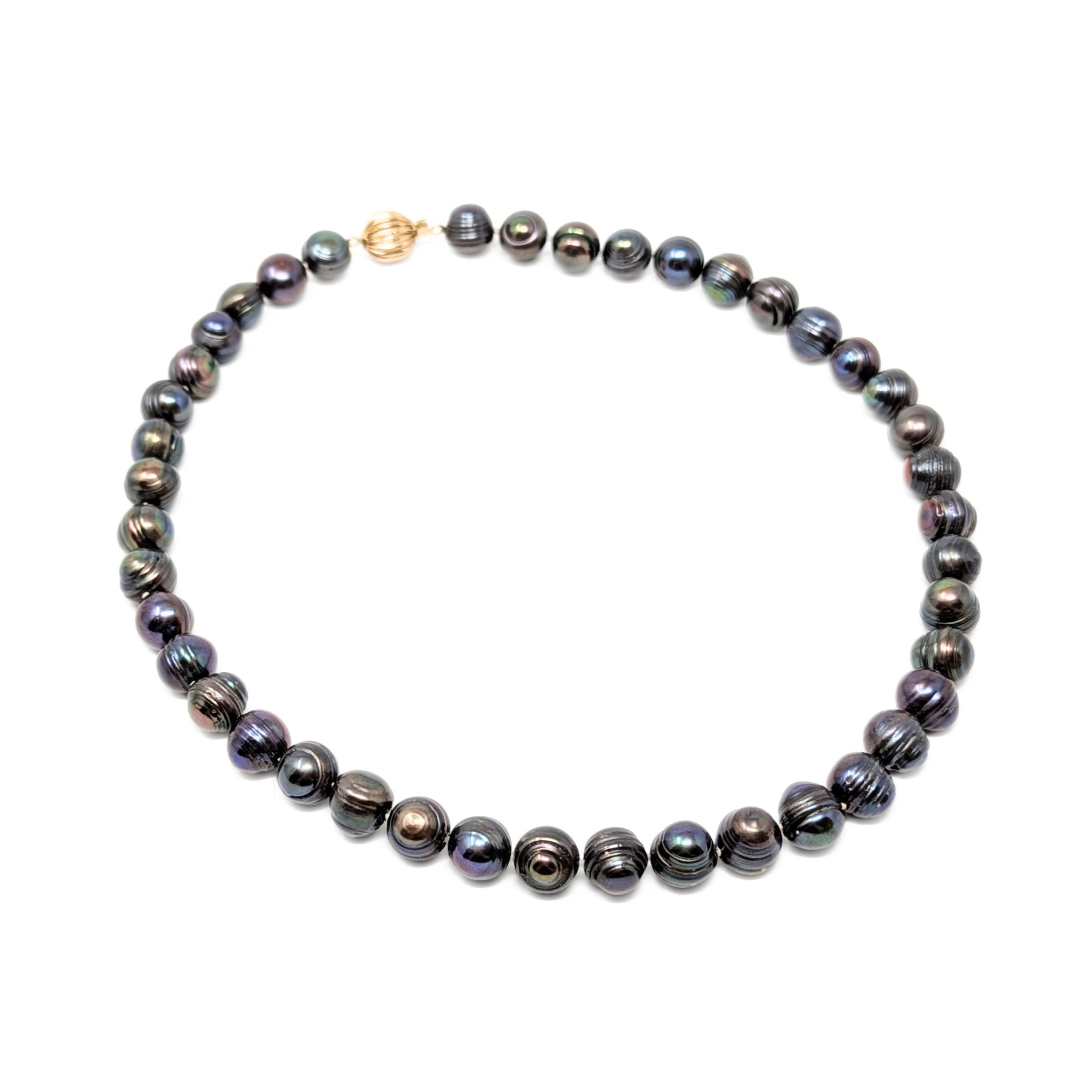 Details: A beautiful strand of baroque south sea pearls with overtones of green, blue, and purple, finished with a 14K gold ball clasp.