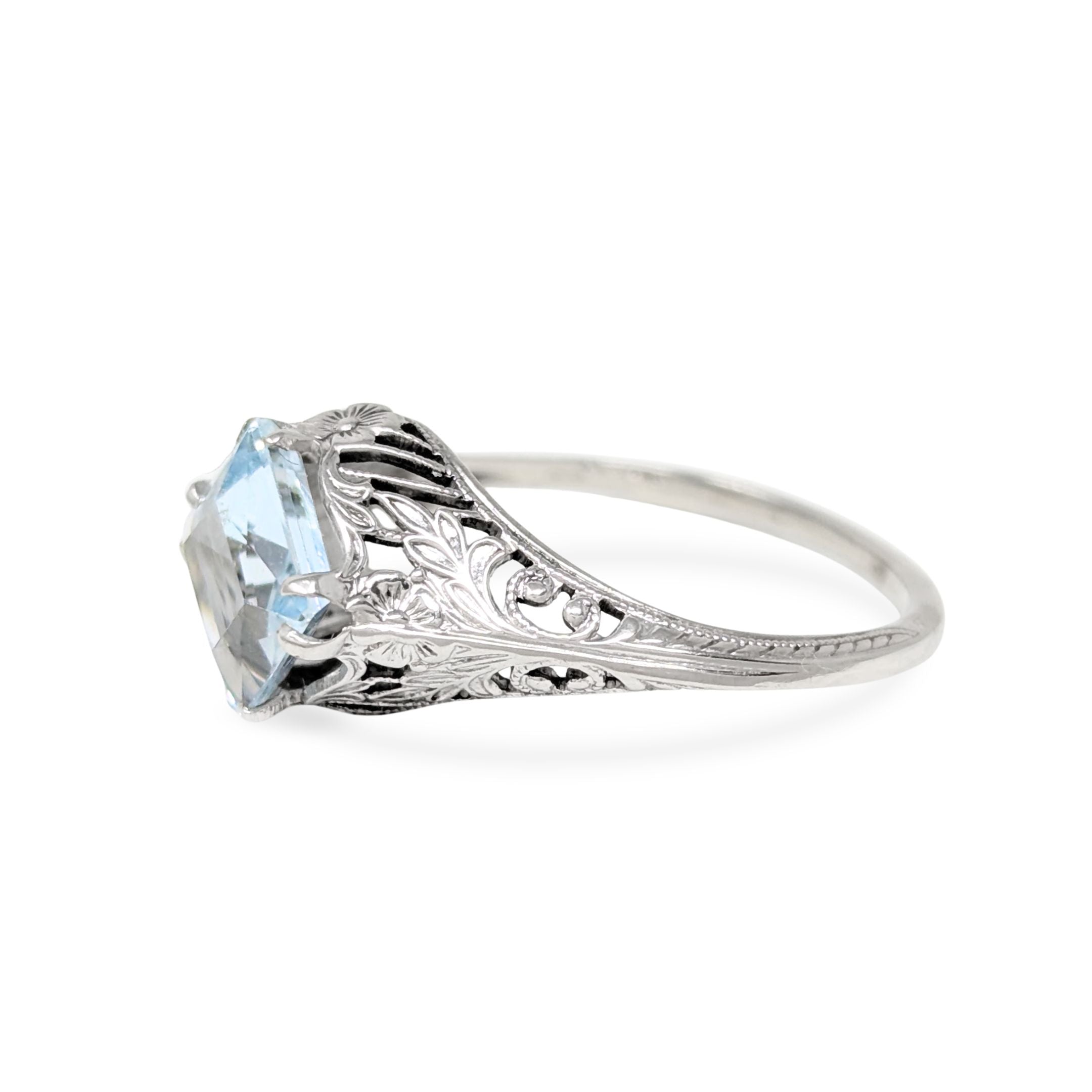 Details: Gorgeous princess cut sky blue aquamarine in a detailed 14K gold filigree mounting. This vintage ring perfectly captures of the timeless elegance of antique design.
