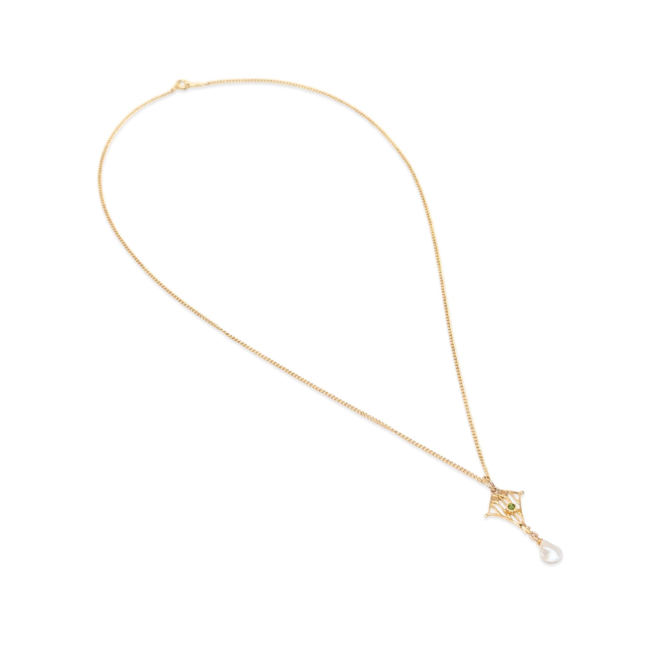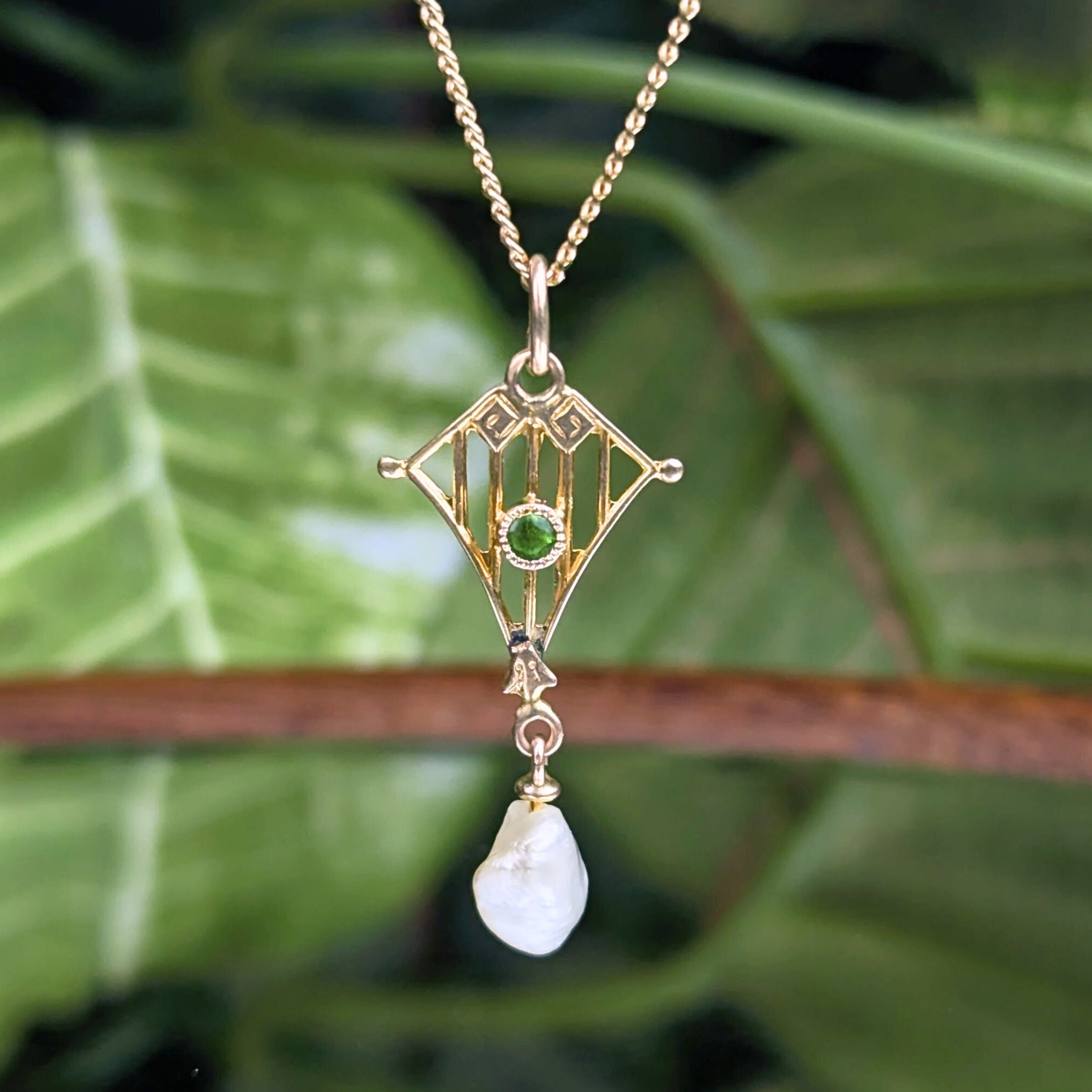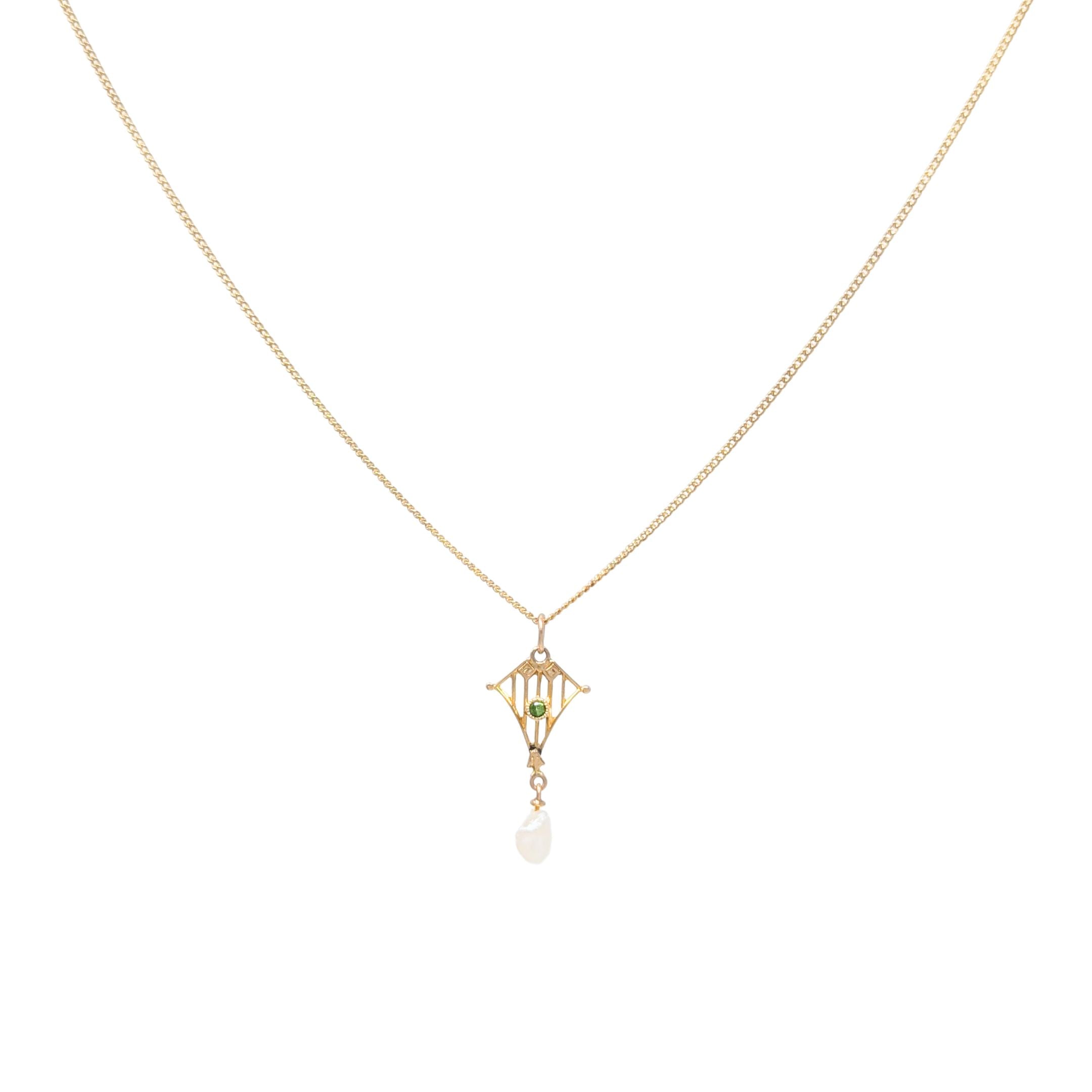 Details: A wonderful example of period jewelry, this 9K gold antique pendant is centered with a small green semi precious stone and showcases a single seed pearl dangling below. The pendant hangs from a delicate 14K gold vintage chain.