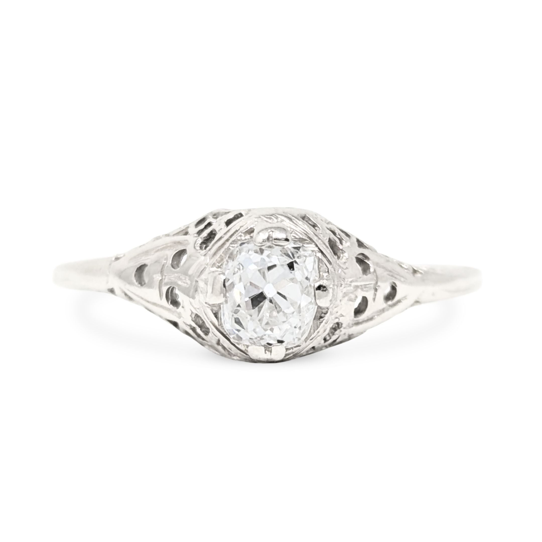 Details: An antique white gold ring showcasing a stunning Old European Cut diamond nestled in a detailed filigree mounting. The perfect engagement ring, anniversary gift, or standout addition to any jewelry collection.