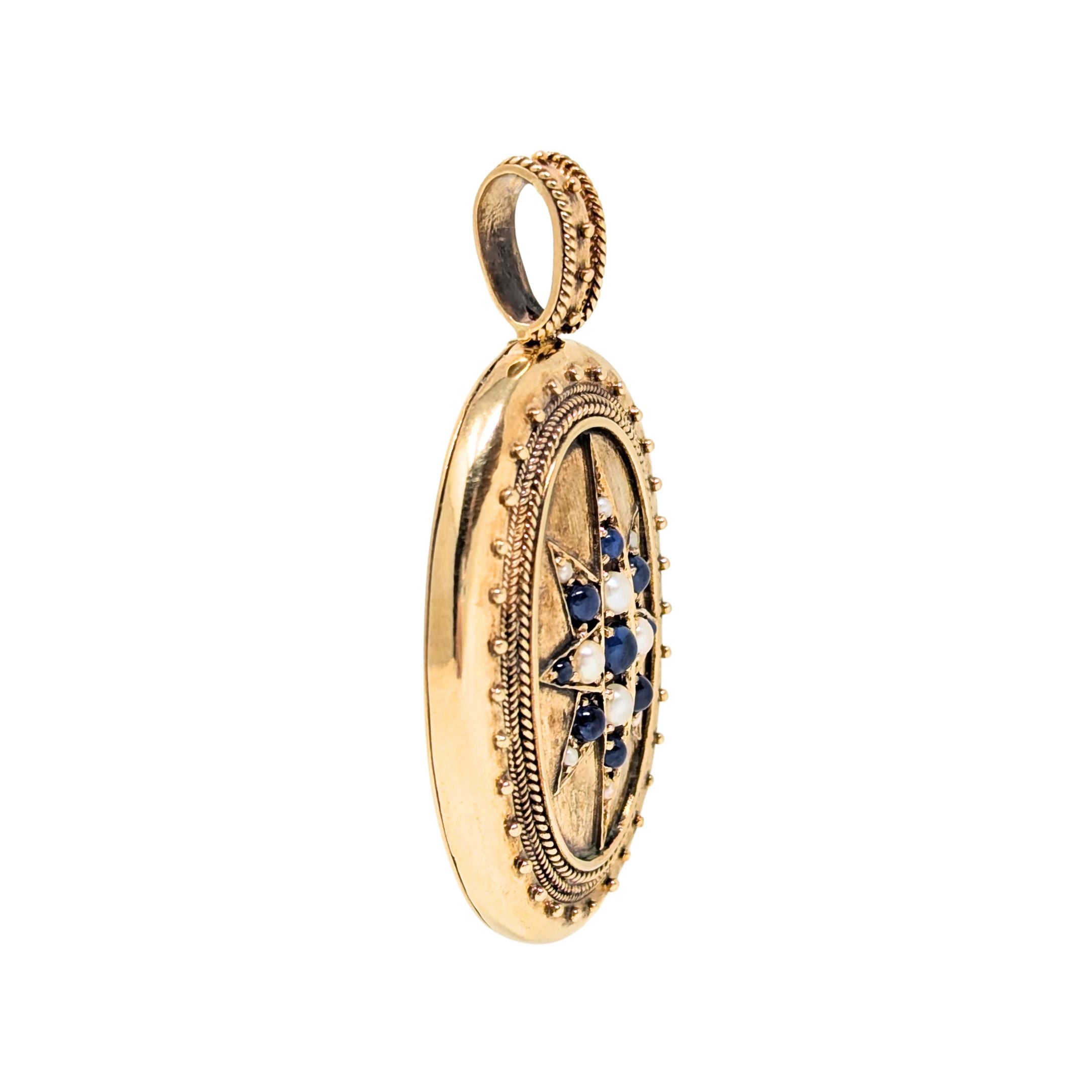 Victorian 14K Gold Blue Sapphire & Pearl Starburst Mourning Locket