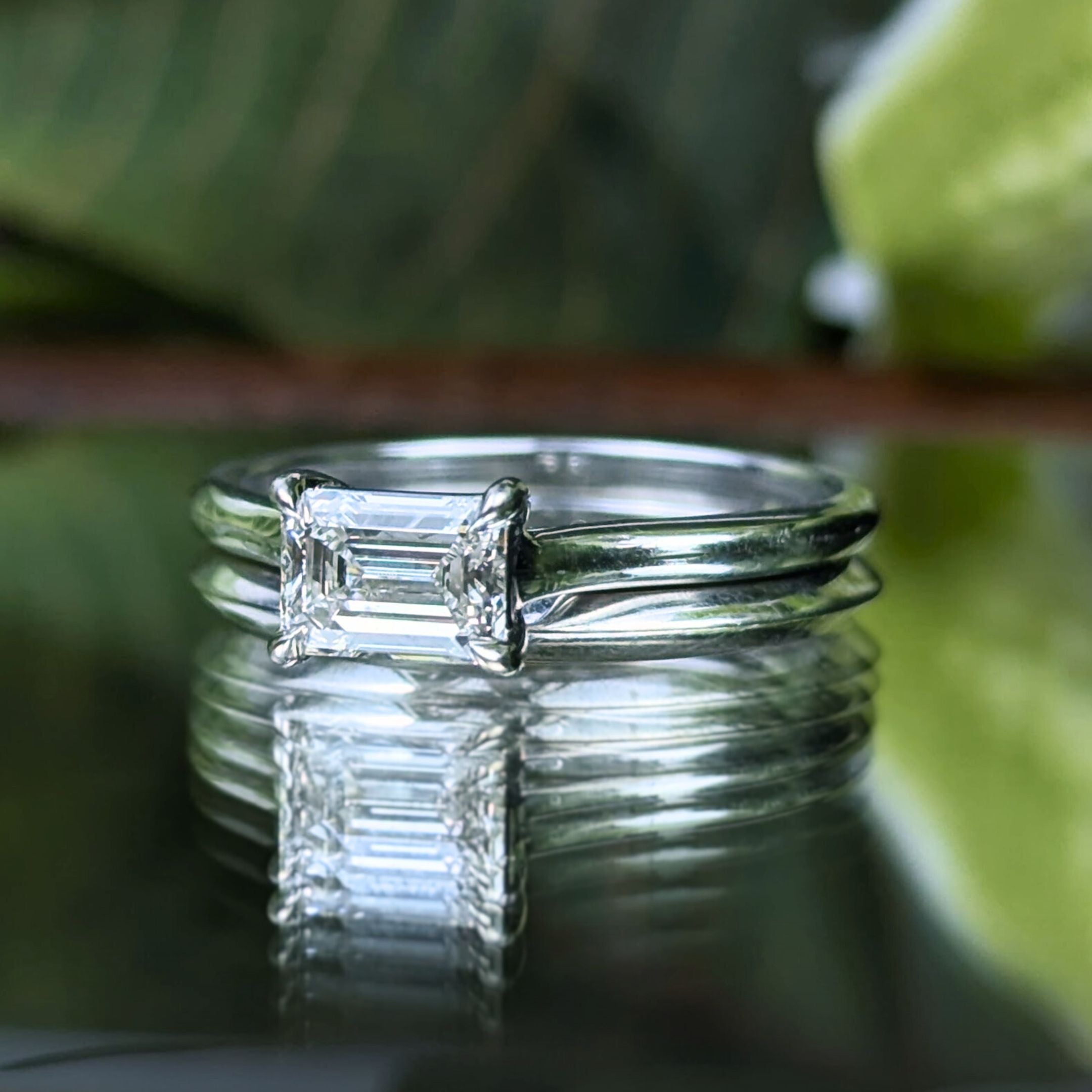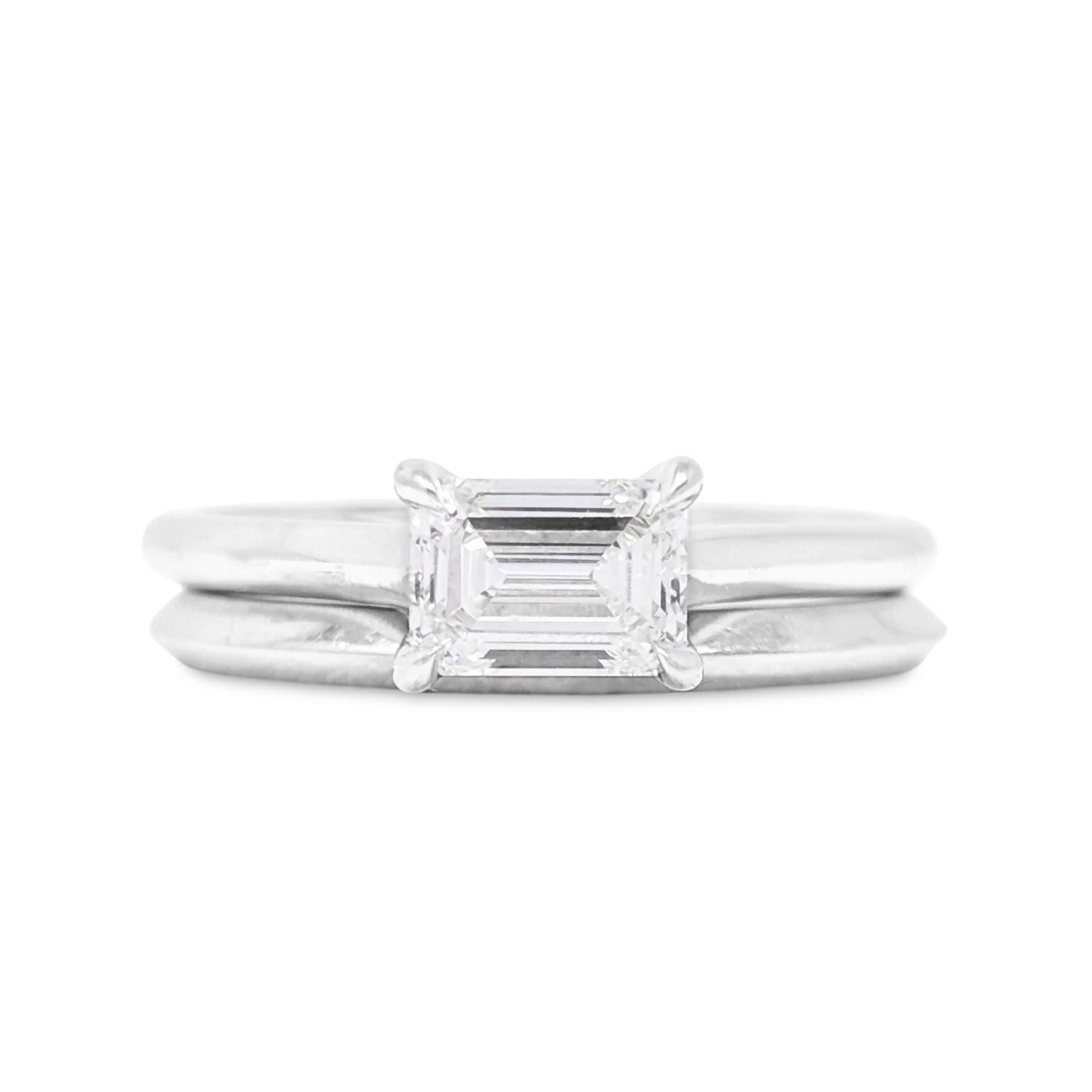 Details: An elegant and minimalistic emerald cut diamond solitaire engagement set. This set could easily be resized by a jeweler.