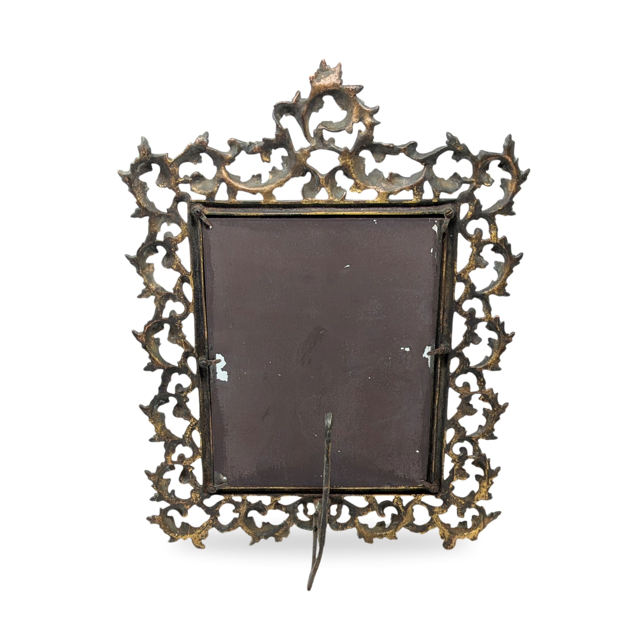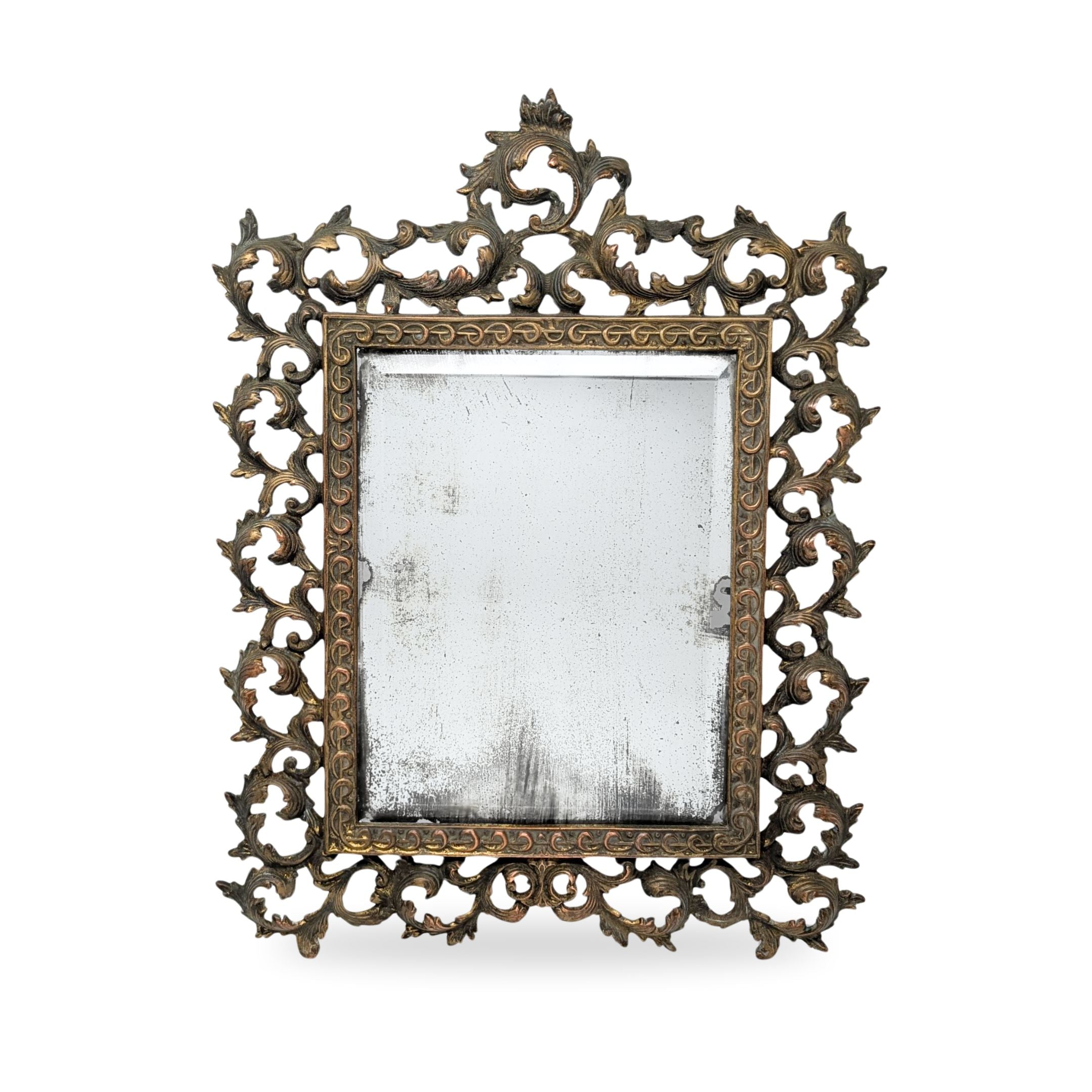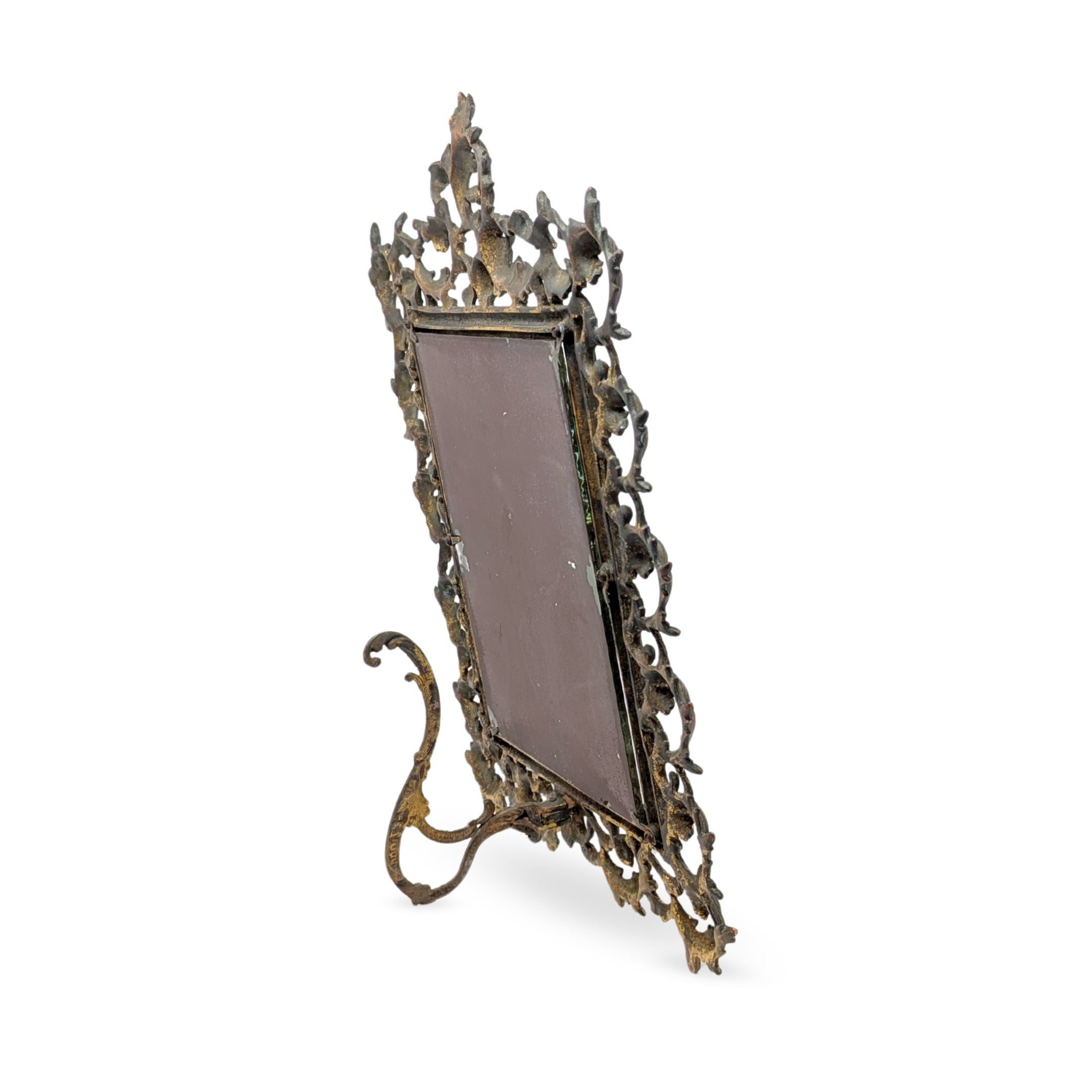 Condition: Very good. Original silver nitrate glass mirror is still securely attached behind tabs with no cracks, or breaks. Has some silver loss throughout consistent with age. Cast metal frame was originally decorated with a gilt finish, most of which has worn away with time, creating a lovely antique patina. Hinged easel stand is still securely attached and functional. Please see photos!