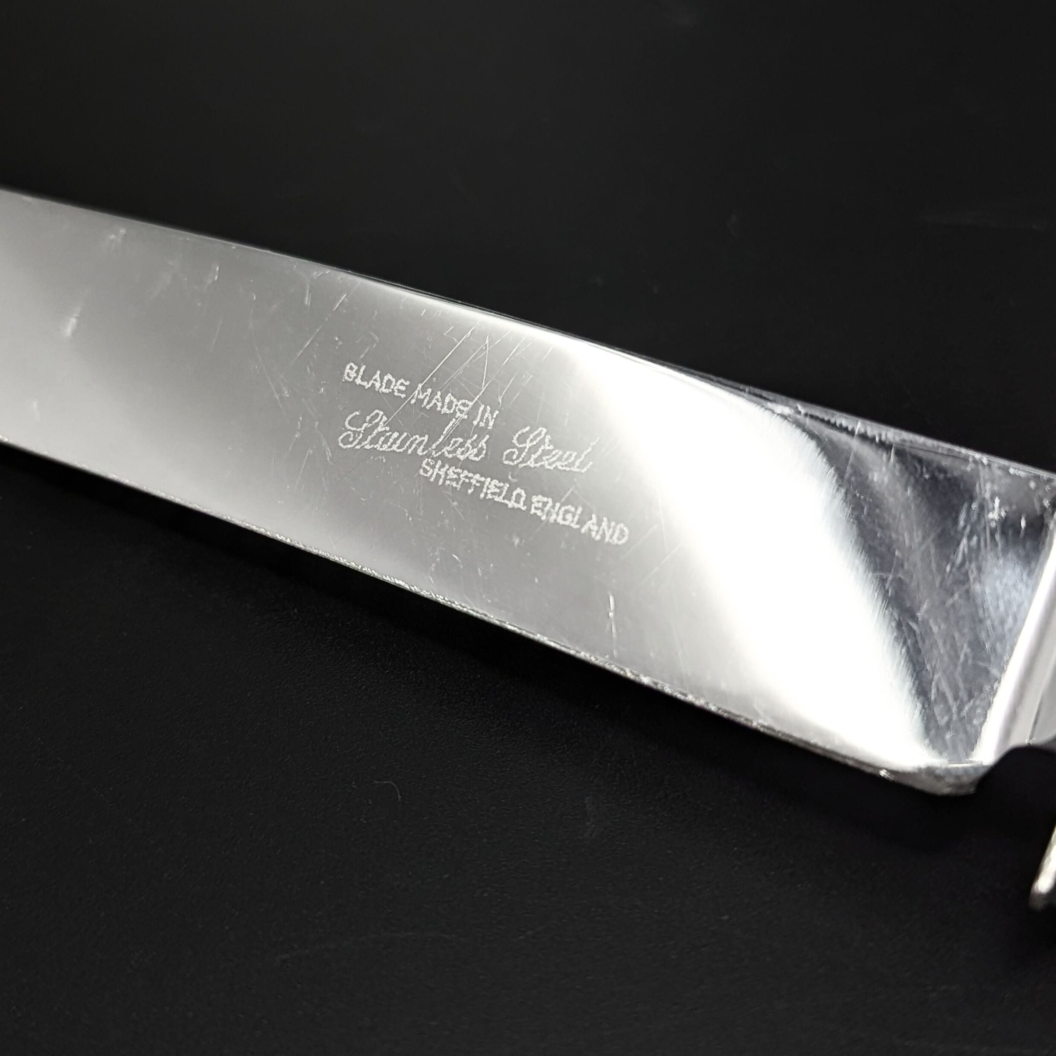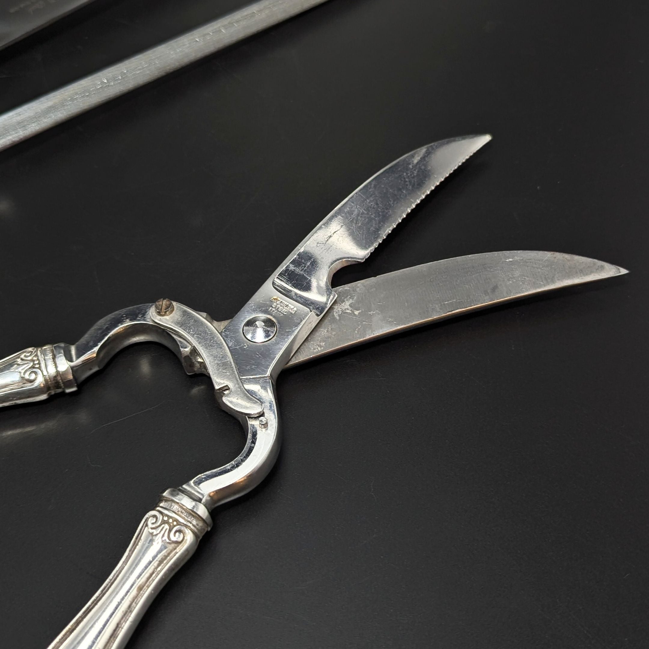 Condition: Excellent vintage condition. Some signs of light wear commensurate with age and use. Please see photos.Details: Everything you need to serve the Thanksgiving turkey or the Christmas goose! A large carving set comprising a large carving knife, a large carving fork, poultry shears and a sharpening steel, all with stainless steel blades and sterling silver handles in Web's "Ancestry" pattern.