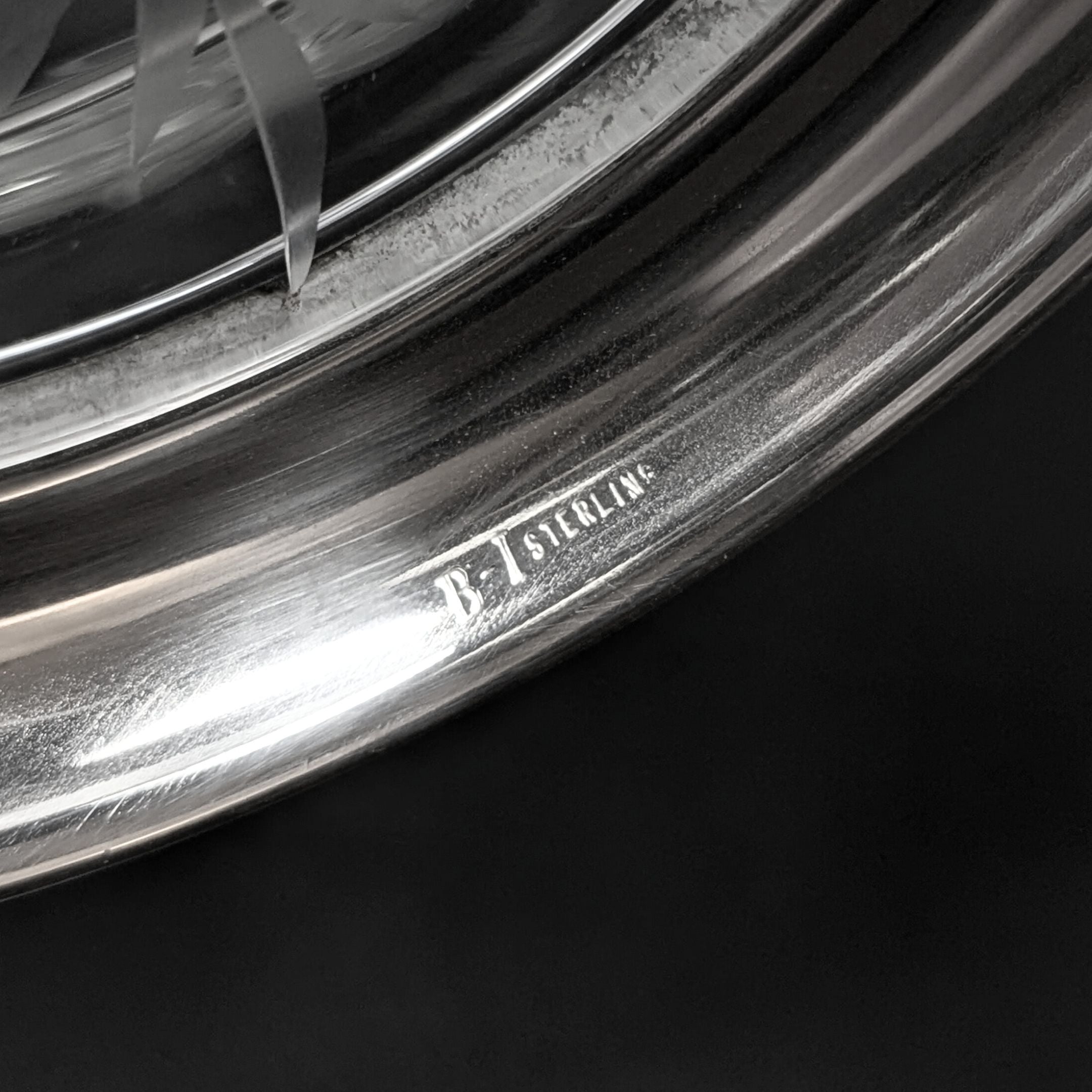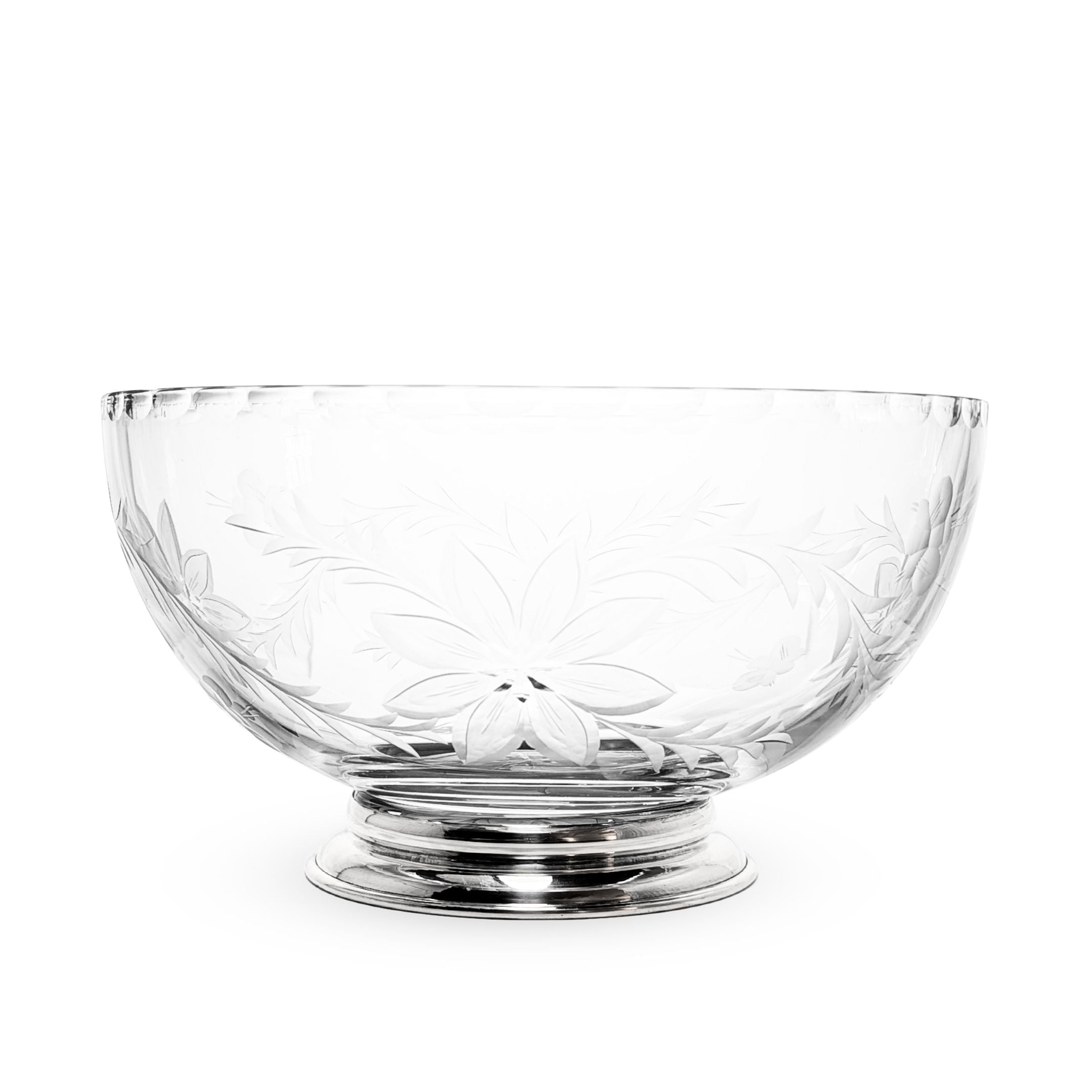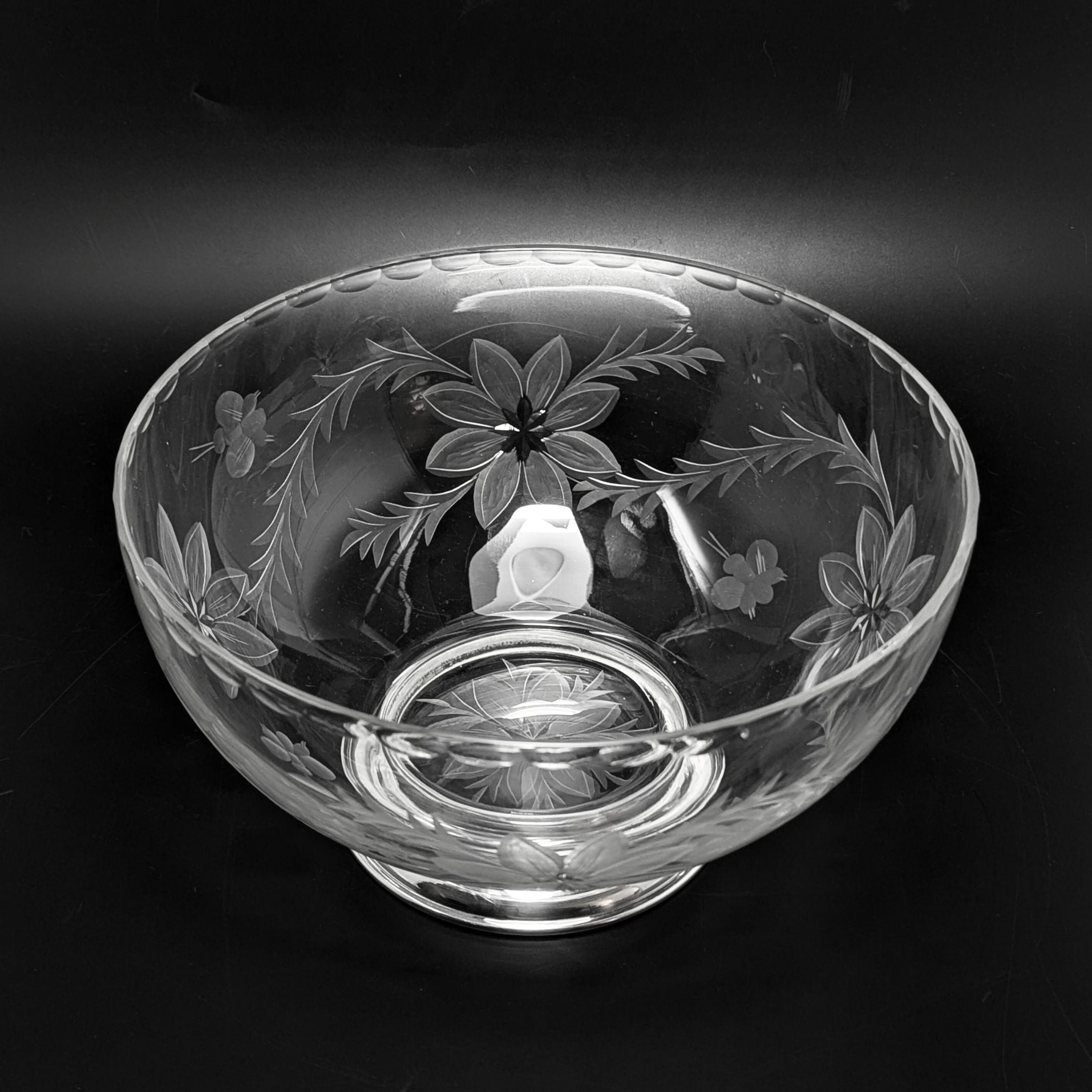 Details: This large crystal bowl has a cut floral pattern that wraps all the way around, as well as a scalloped edge detail. The sterling silver foot is marked “B-I STERLING” on the bottom edge.