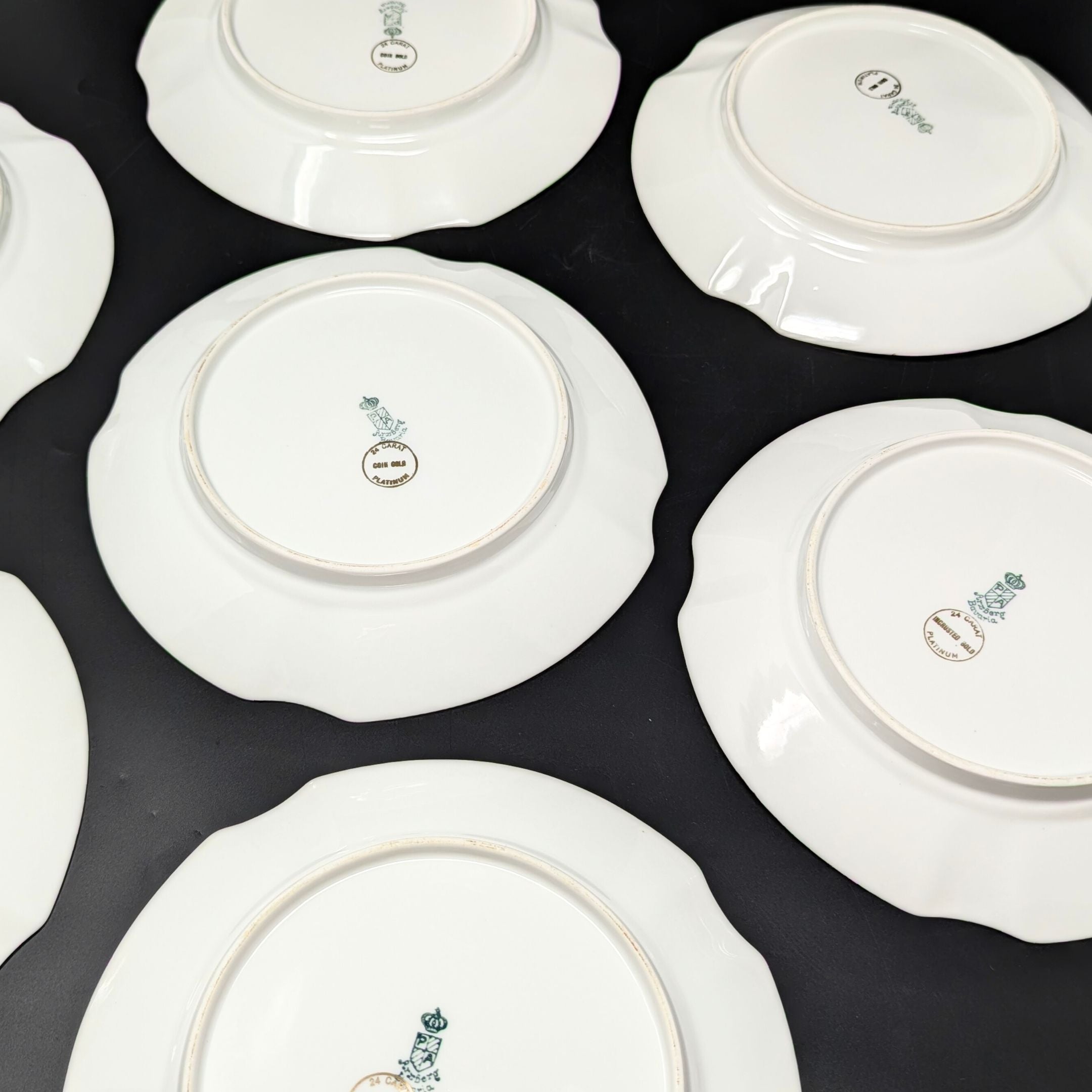 Details: Arzberg porcelain is a brand of German-made porcelain known for its high-quality, functional, and innovative designs, with a history dating back to 1887.  Each piece in this set is marked “Arzberg Bavaria” and has a stamp that reads “24 CARAT / PLATINUM / COIN GOLD” on the bottom. The gold and platinum finish is applied through a process of applying liquid bright gold and platinum, or a liquid suspension of gold/platinum particles that is painted or applied to the surface of the porcelain. After it dries, the piece is fired at a high temperature, which burns off the organic materials and fuses the gold or platinum to the piece, leaving a decorative finish.