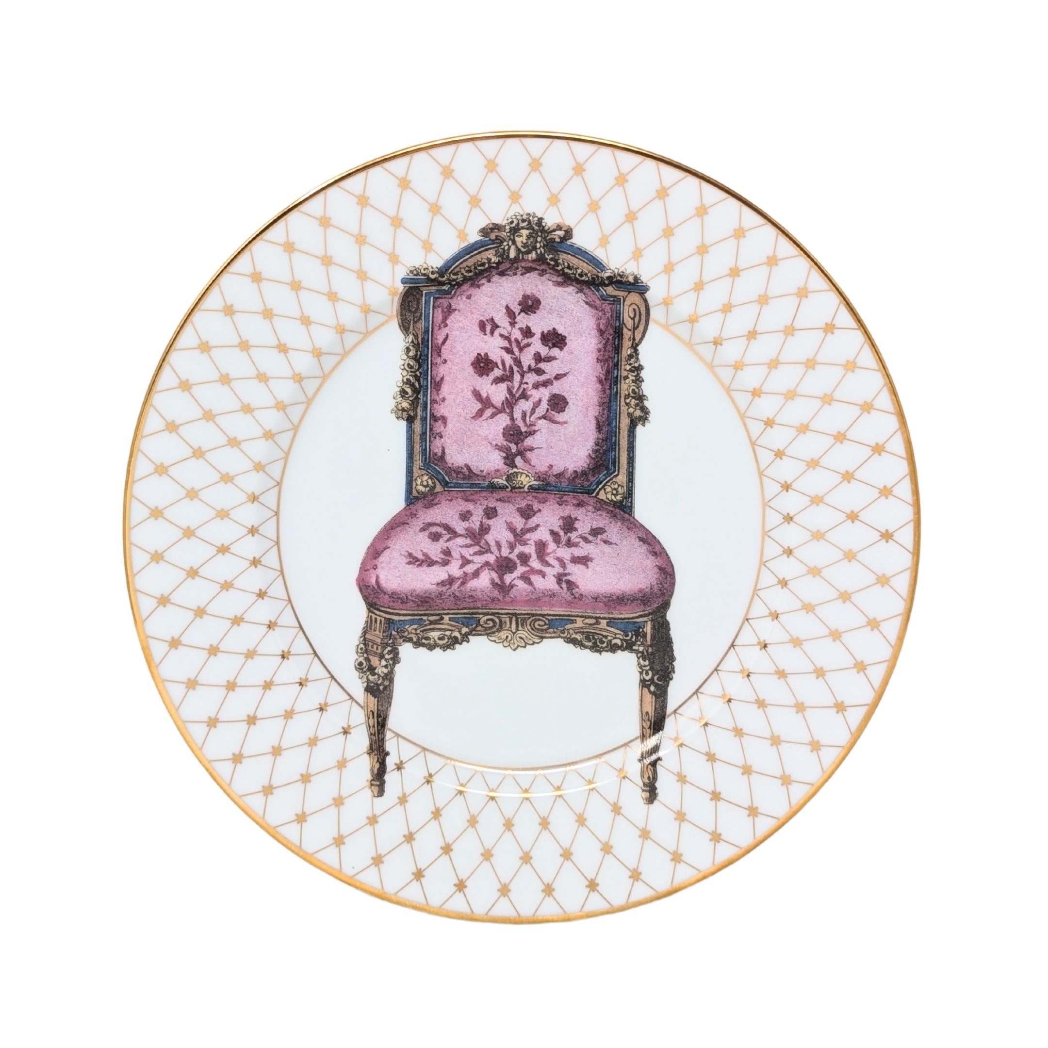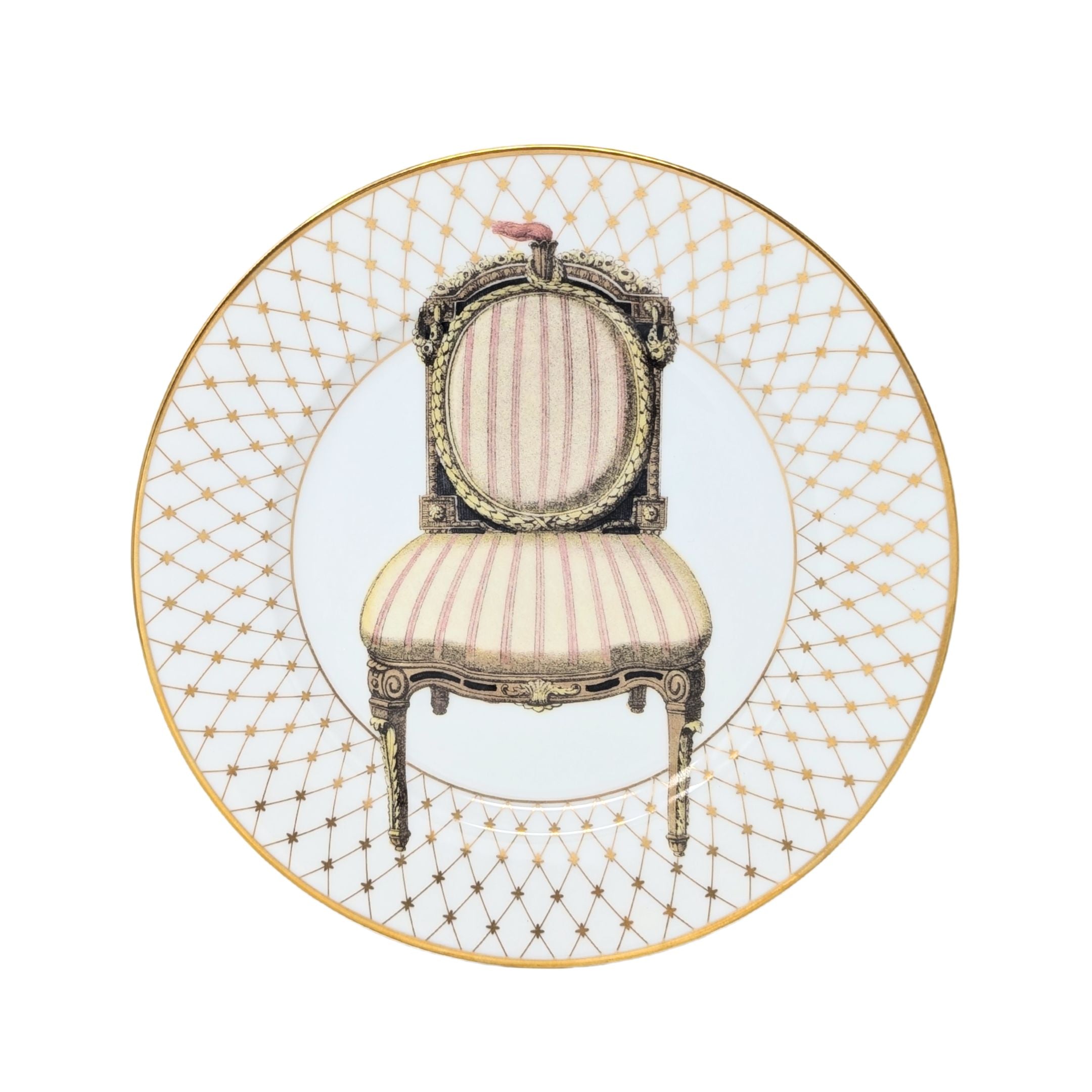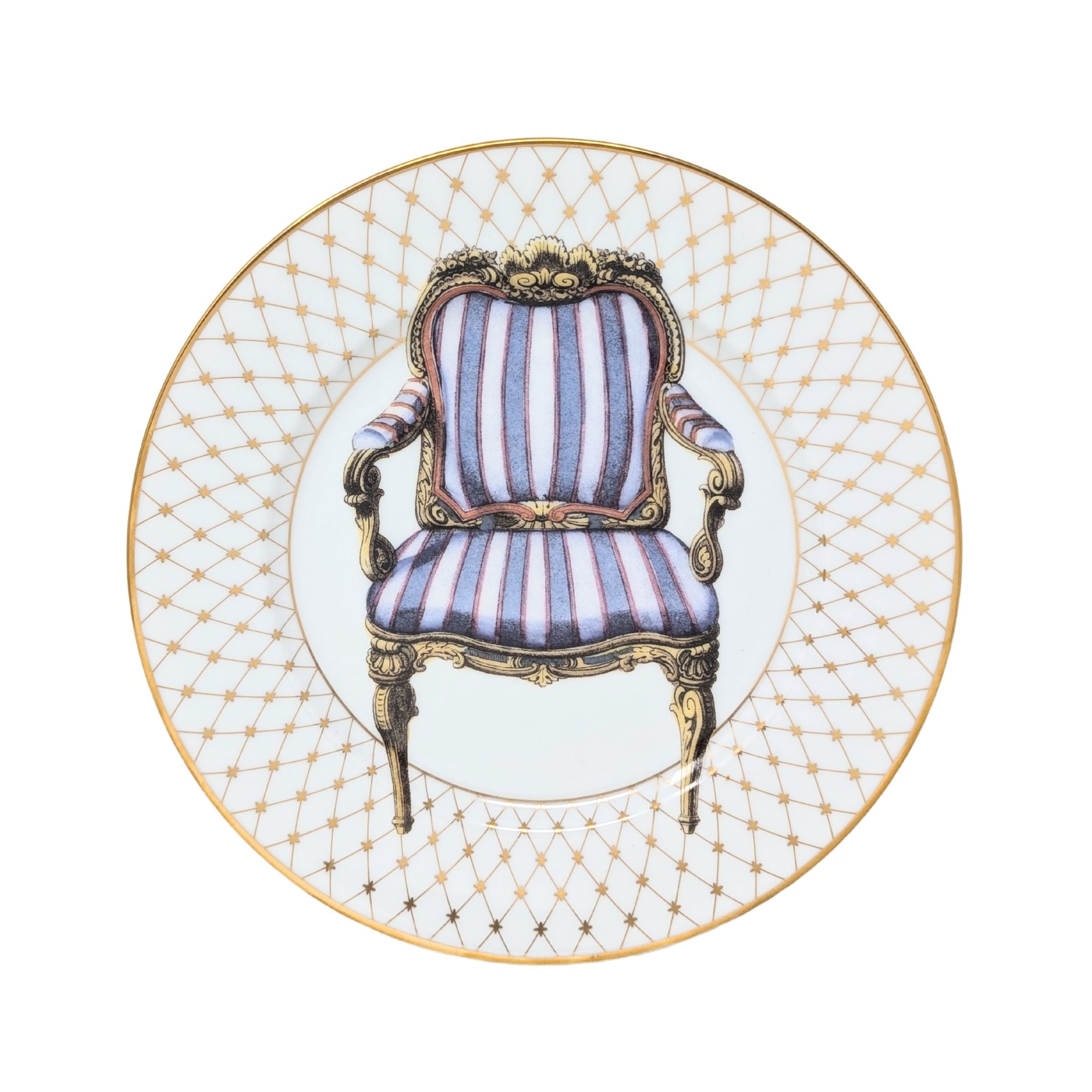 Details: This set includes the full series (I-IV) of the Chaise collection by Fitz & Floyd. Each showcases a unique, hand painted upholstered chair ranging from regal pink roses to classic blue and green stripes. Every plate is finished with a sophisticated gold lattice rim.
