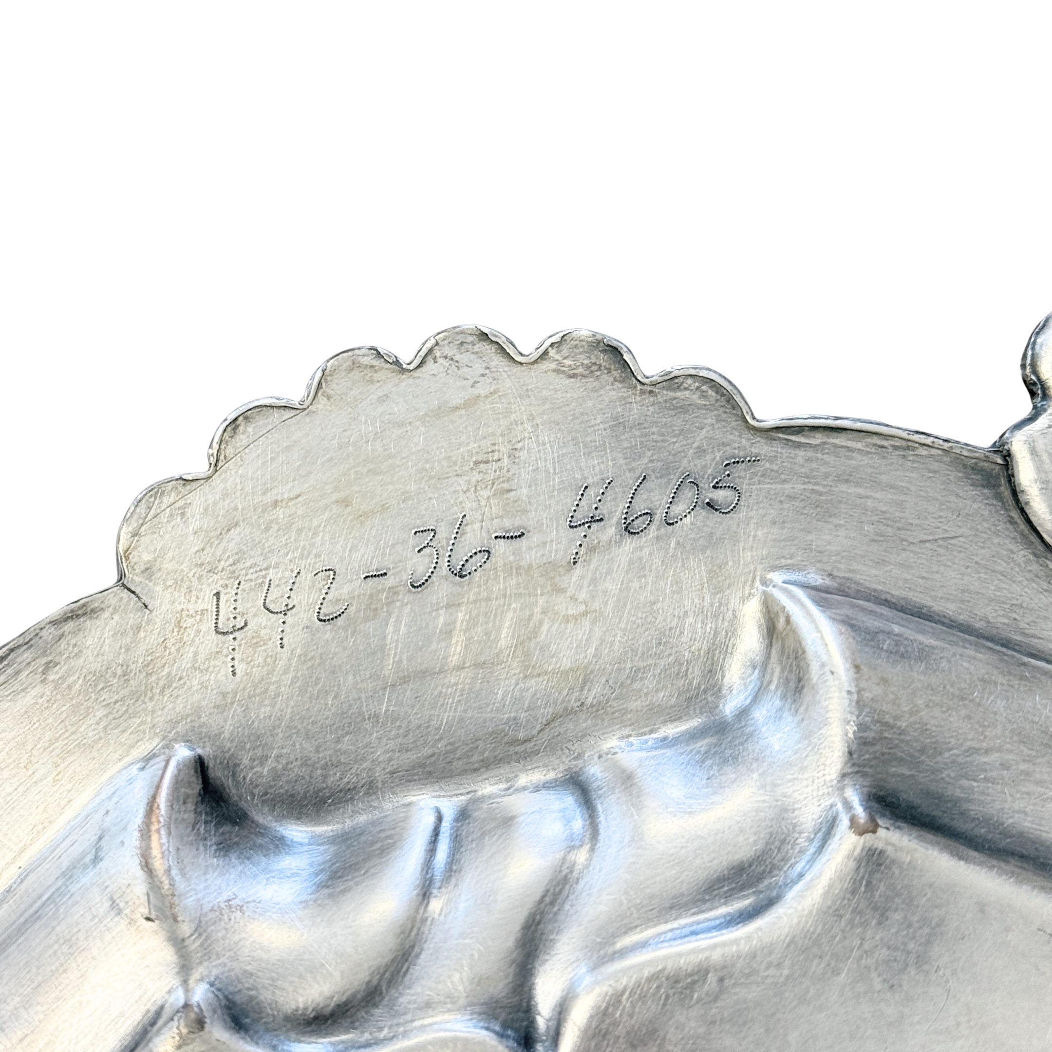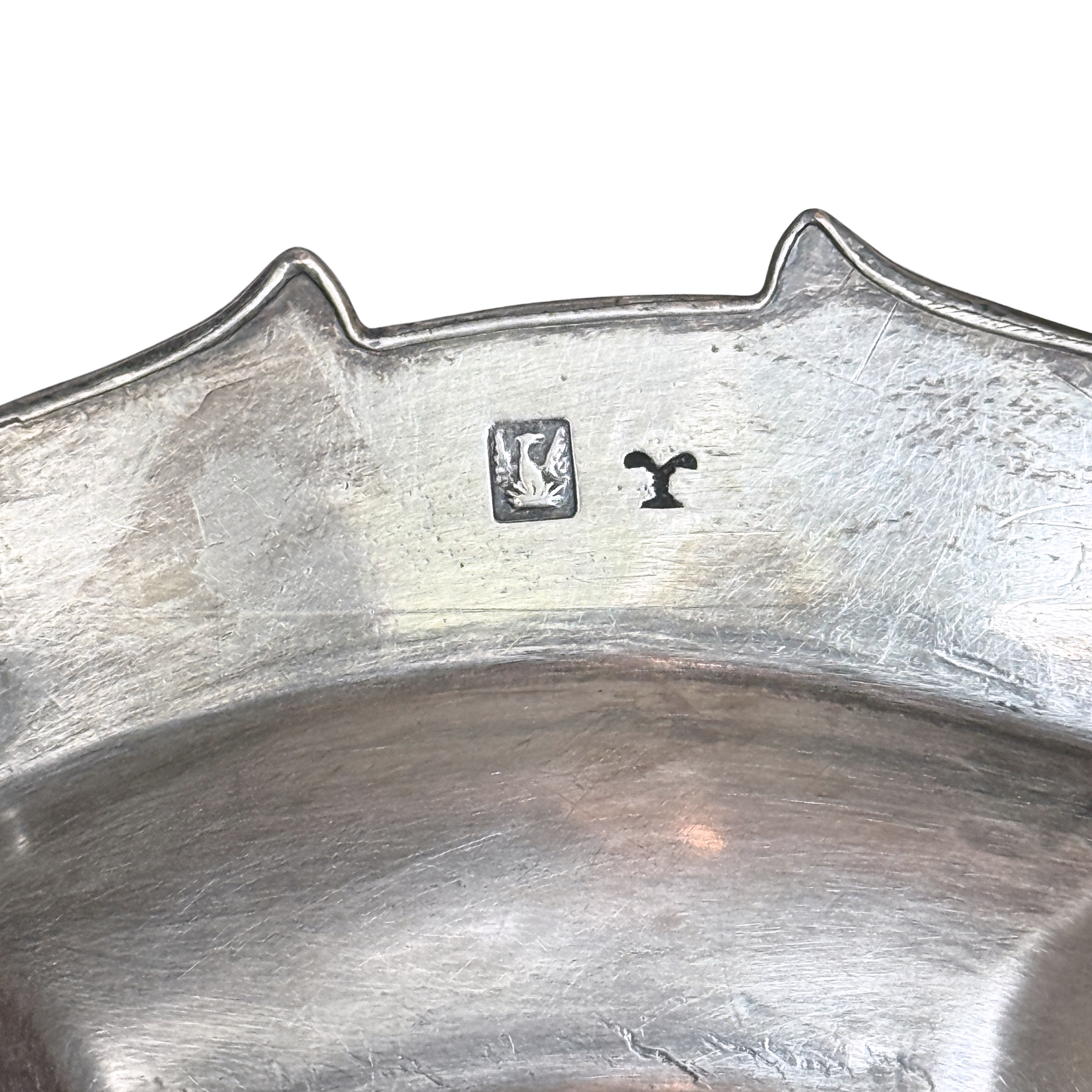 Details: A large, authentic George II antique tray with an engraved family crest/coat of arms in the center. The edged are trimmed in a scrolling shell motif with large handles faceted on each end. The tray is stamped with a phoenix or griffin stamp hallmark as well as with a “Y” shaped symbol just next to it, both on the bottom. There is another string of numbers that has been later carved into the edge of the tray on the bottom.