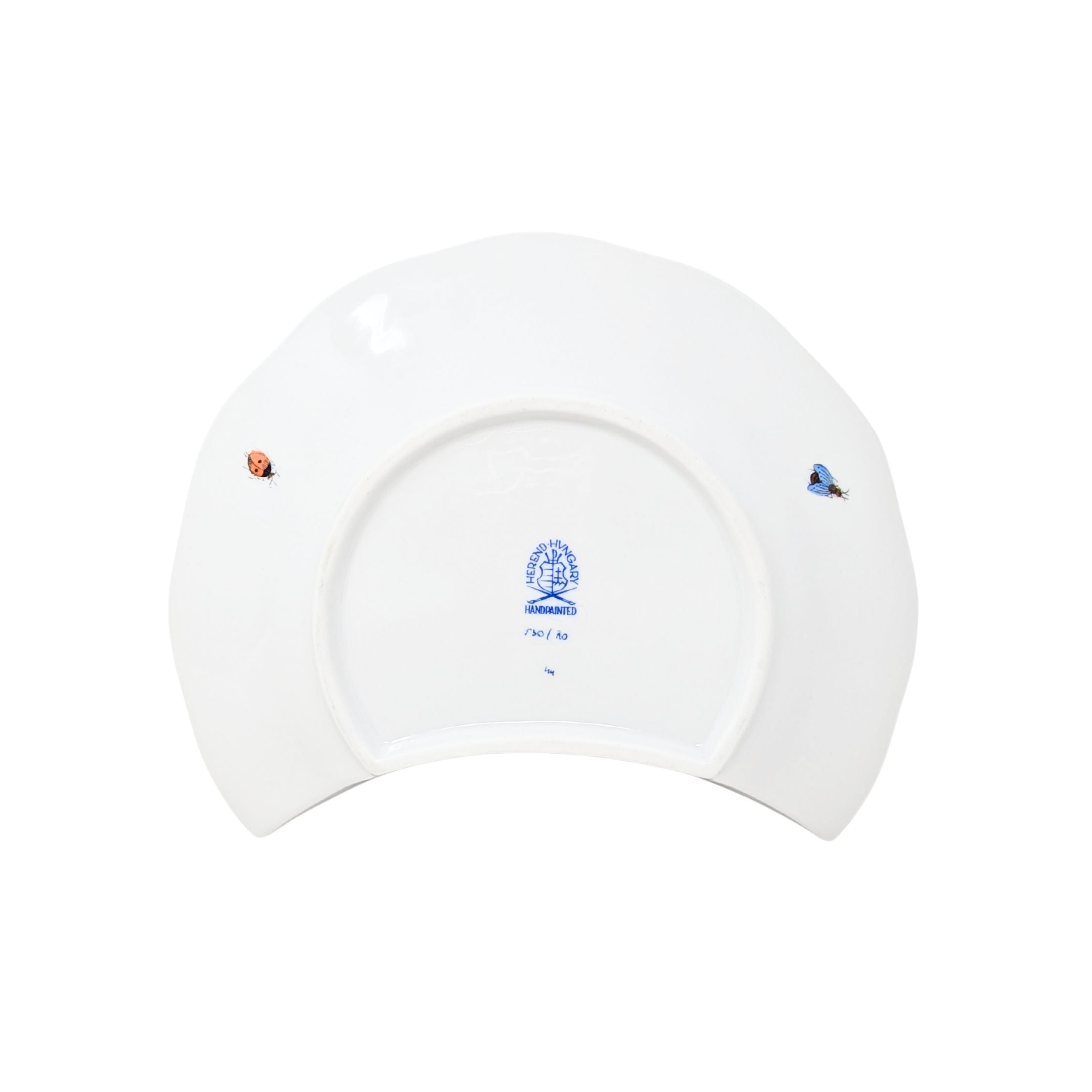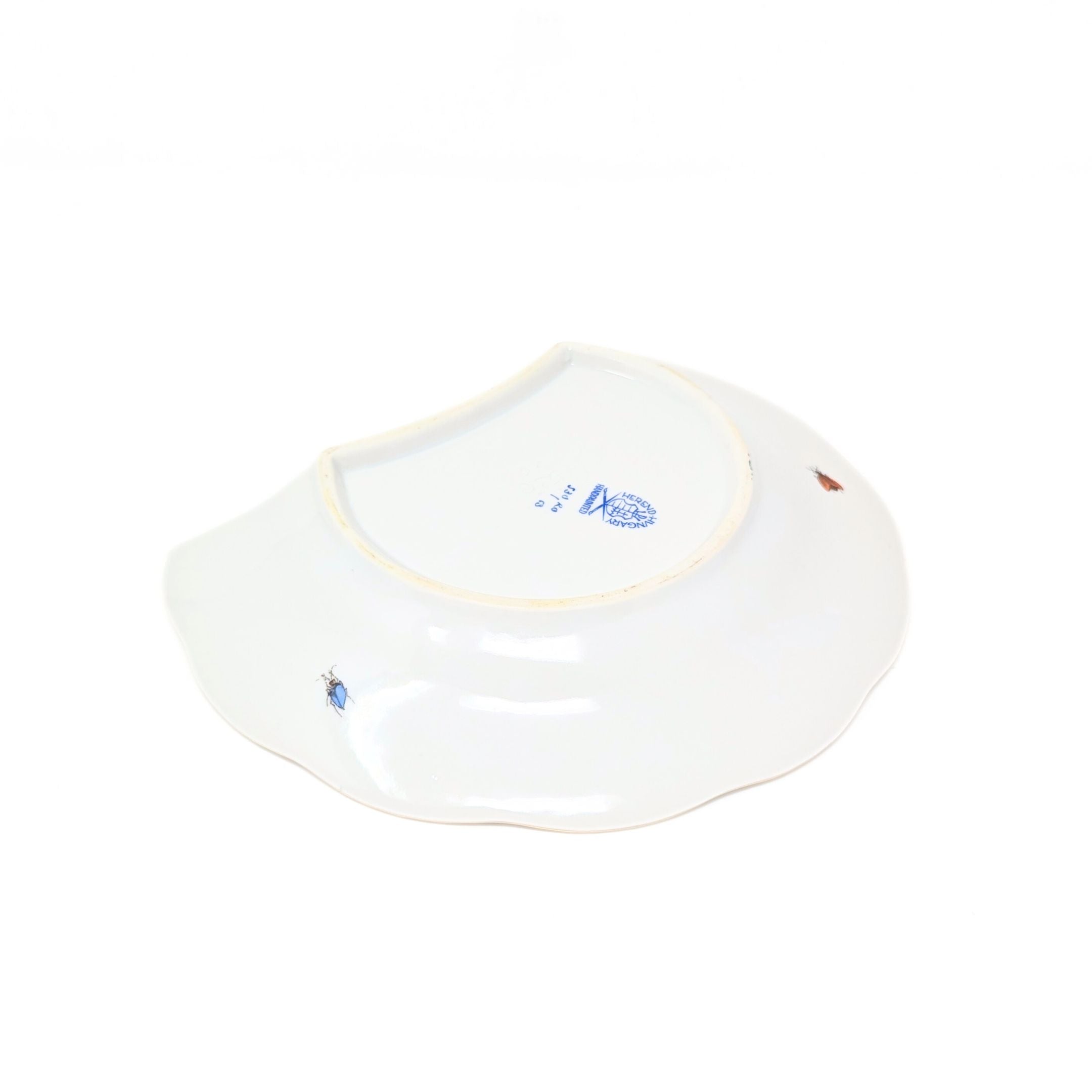 Details:  A unique addition to a holiday dinner setting, the crescent salad plates are made of white porcelain.  The set comprises eight salad plates, crescent-shaped with the classic Herend basketweave around the rim.  Each plate is painted with a different central design of birds perched on twigs, a pearl necklace draped among the branches.  Butterflies and other insects are scattered on the front and back rims.  A narrow gold band adorns the rims.  Each piece is marked on bottom with Herend's blue mark, and hand-numbered.