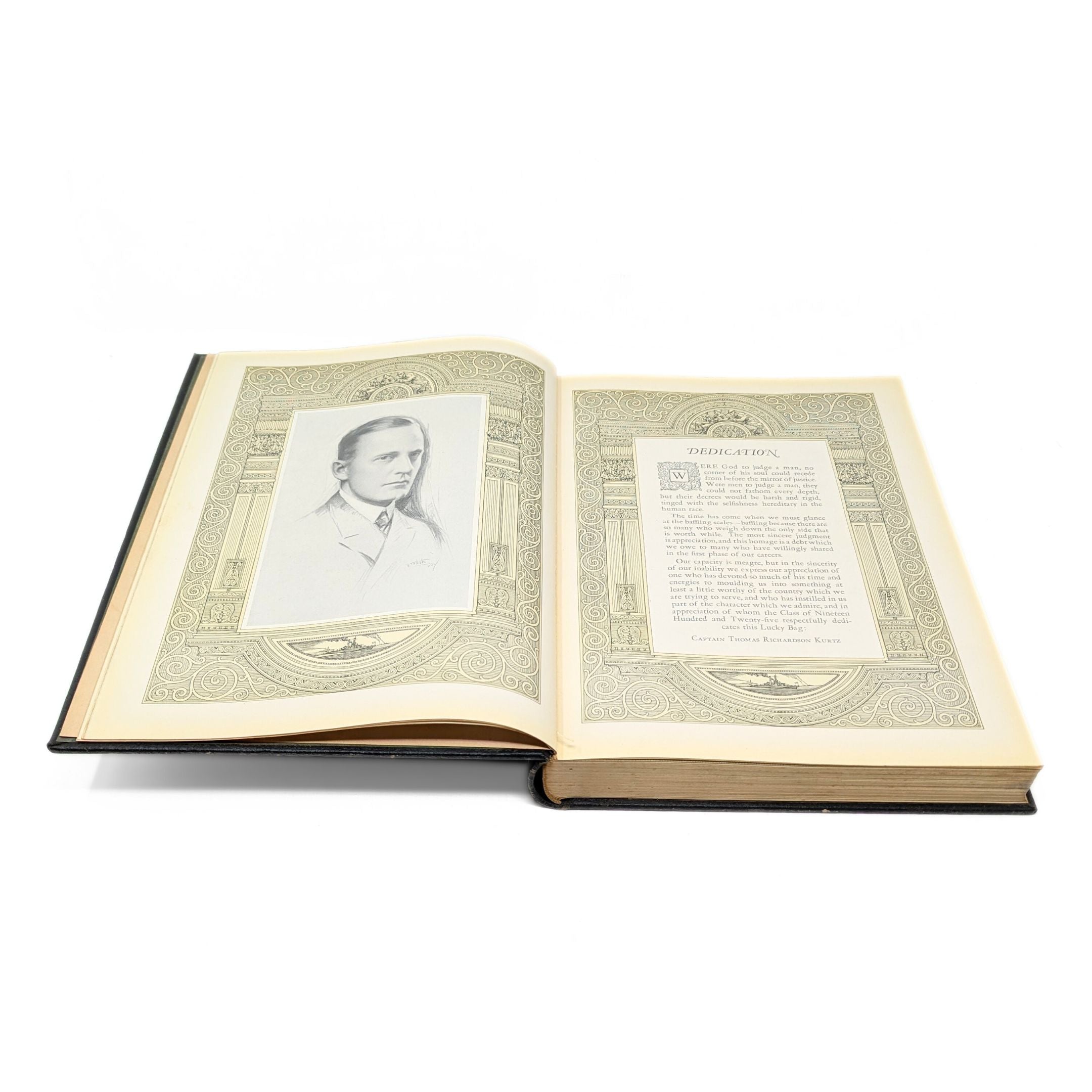 Details: Large black leather-textured cloth covered book with gold embossed lettering and decoration on spine and front cover, Endpapers feature a cameo image of a ship being launched from dry-dock. Fifteen of the graduates in this class died in WWII.