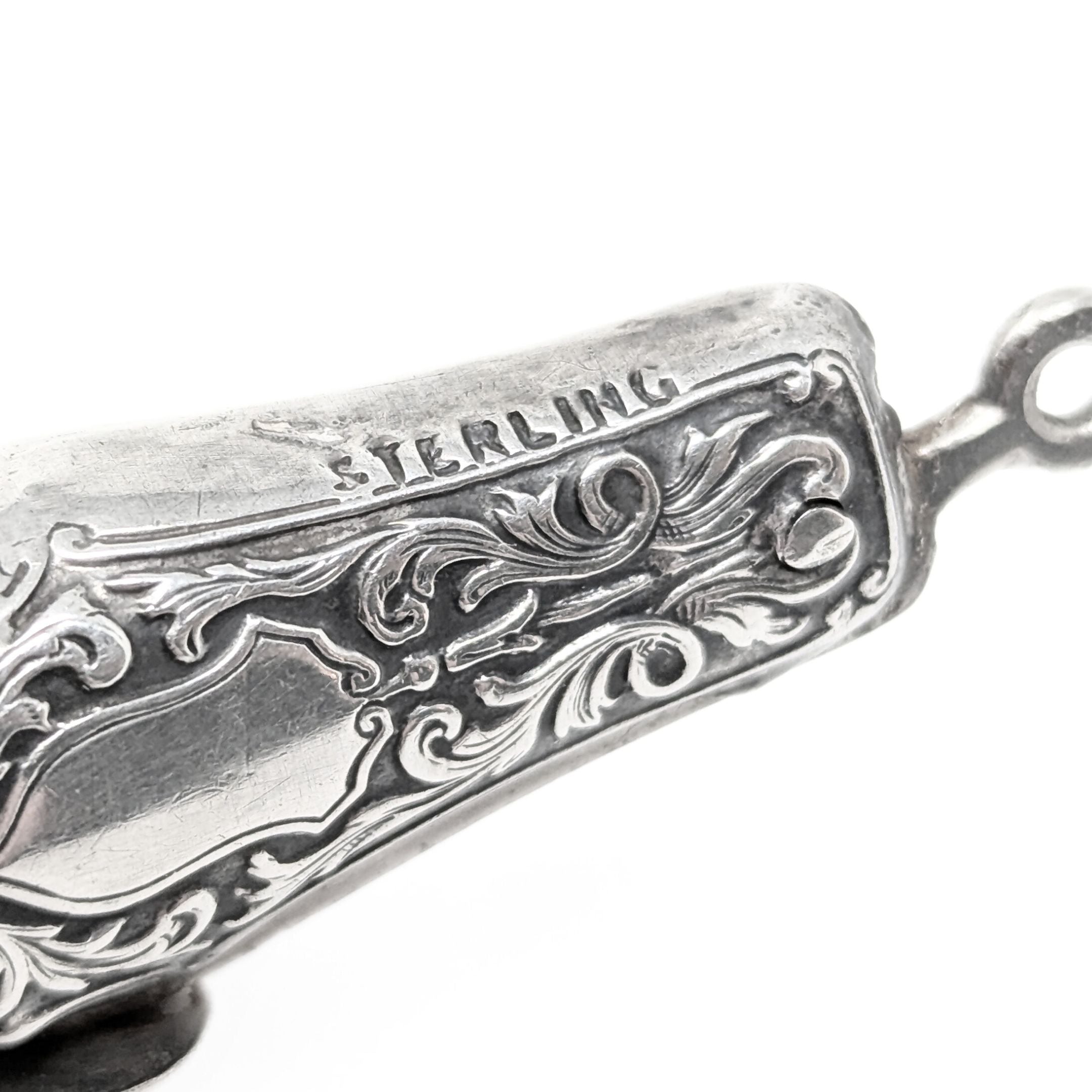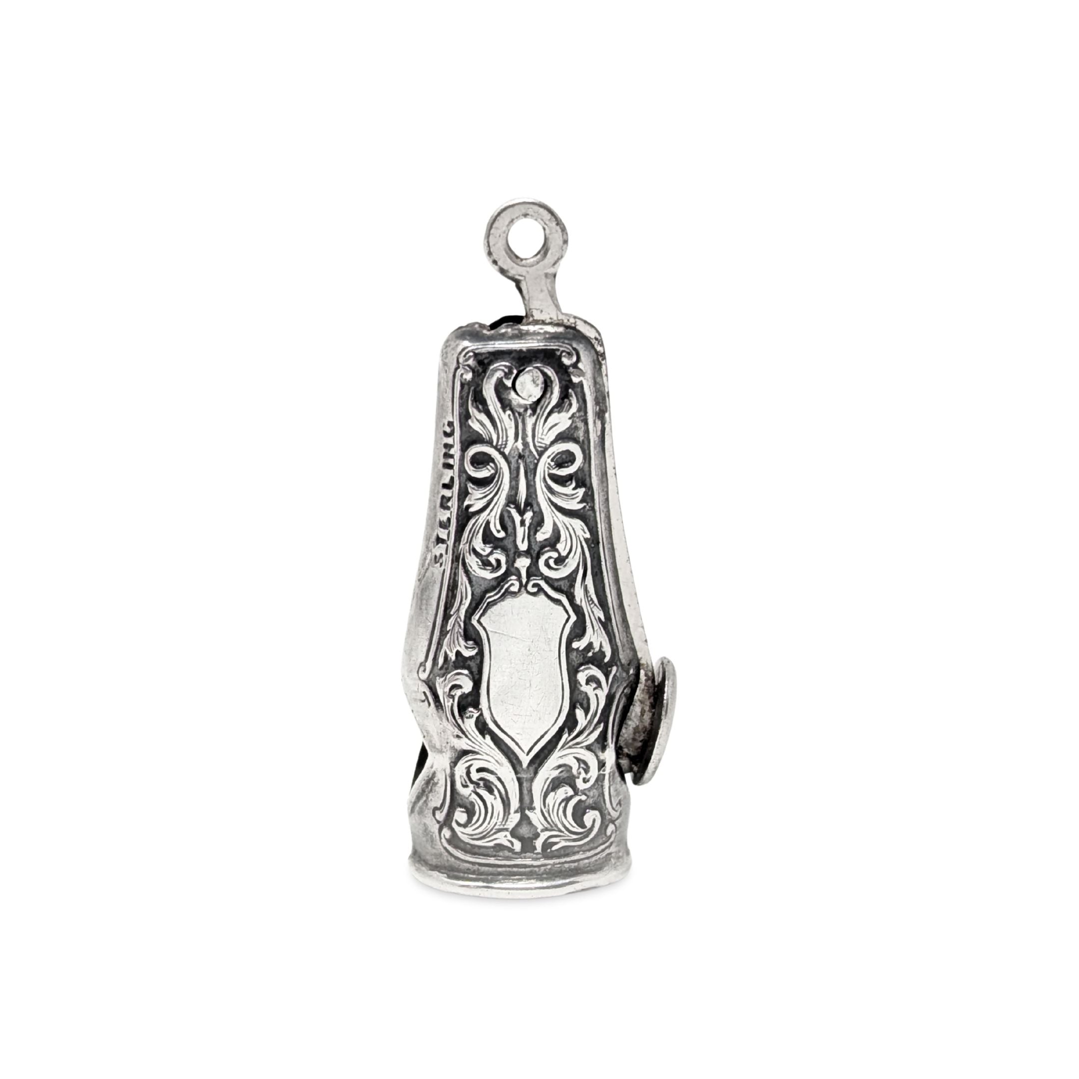 Details: A pocket sized sterling silver cigar cutter designed with deep, crisp repousse floral scrolls and a central shield-shaped cartouche on each side.