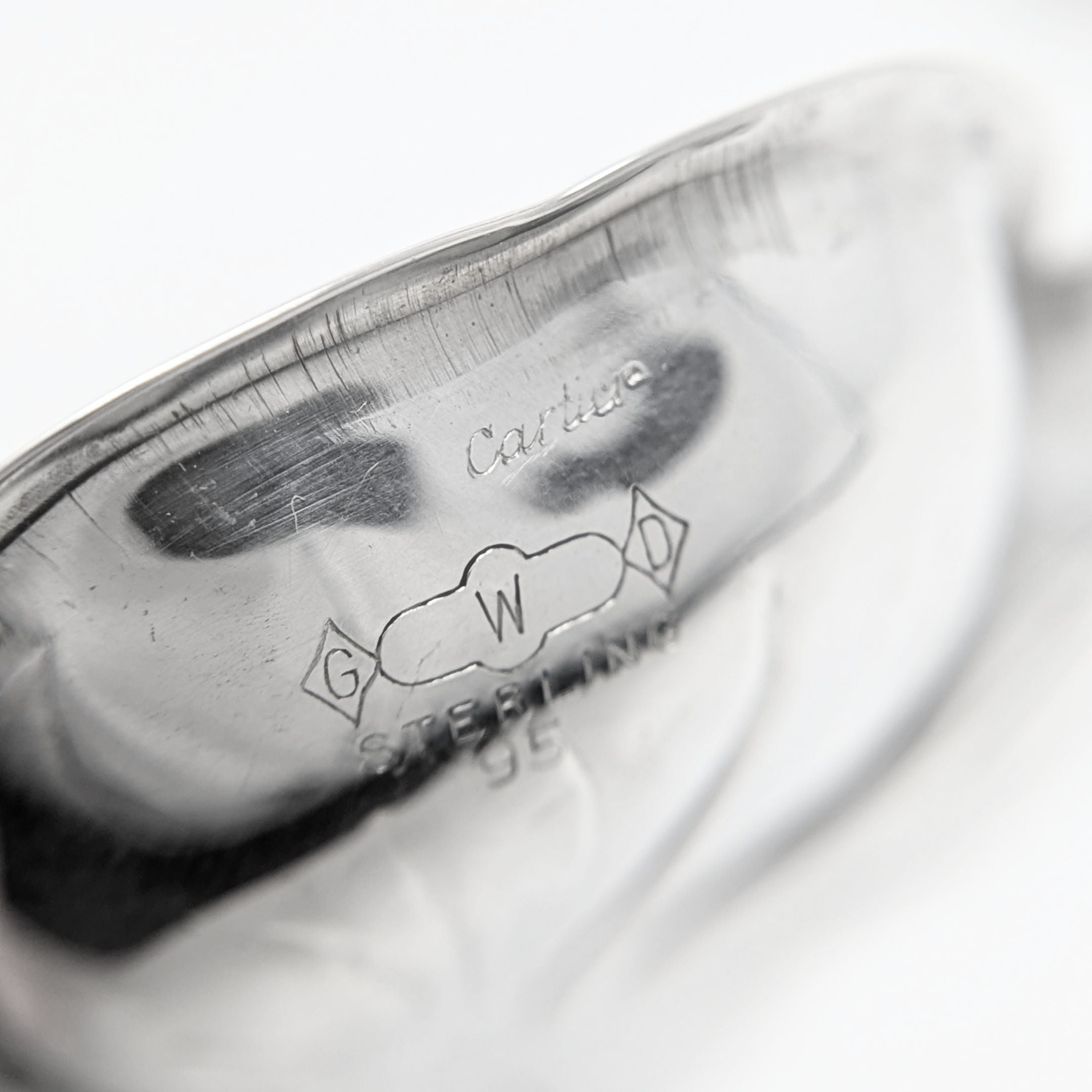 Details: A stunning set of six highly detailed sterling individual ashtrays or nut dishes in the form of four leaf clovers. Marketed by Cartier and handcrafted by famous silversmiths Graff, Washbourne & Dunn. Includes original Cartier felt storage pouch.