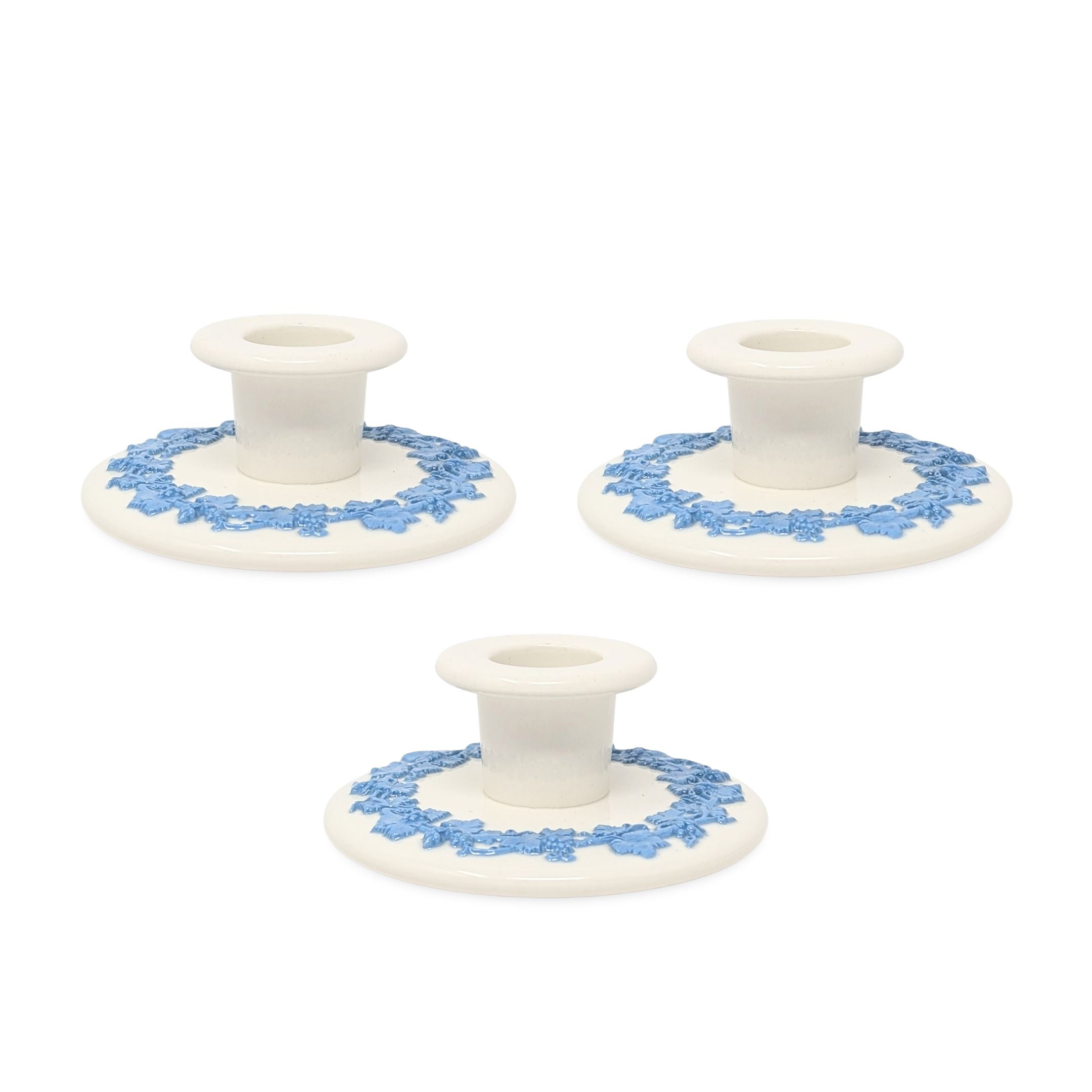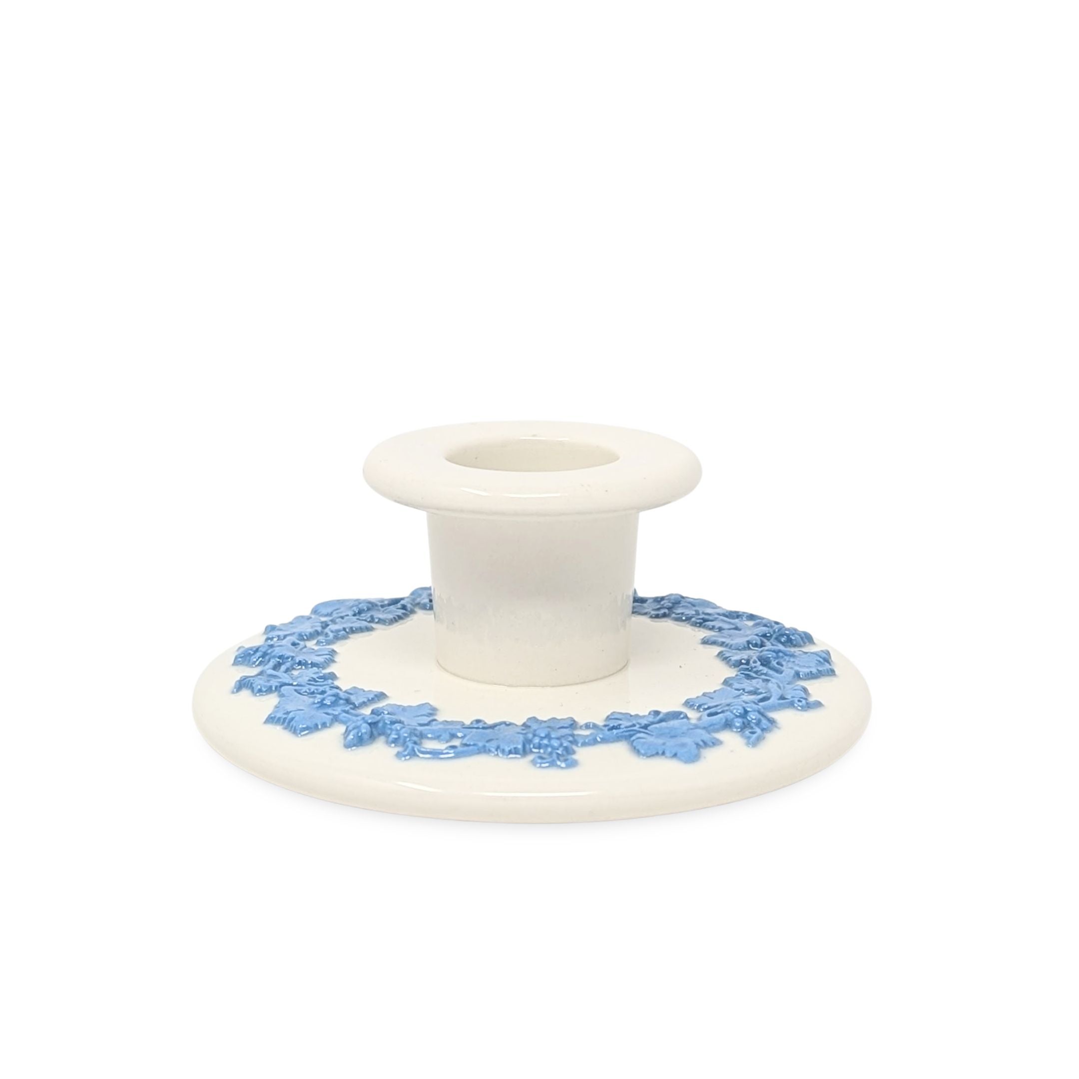 Details: One of the most popular and recognizable Wedgwood patterns, these candlesticks are bordered with a raised grape and vine motif in Wedgwood blue or, “lavender”. Stamped “WEDGWOOD of ETRURIA & BARLASTON / MADE IN ENGLAND / EMBOSSED QUEEN’S WARE” on the bottom as well as impressed with the Wedgwood logo and lettering/numbering system.
