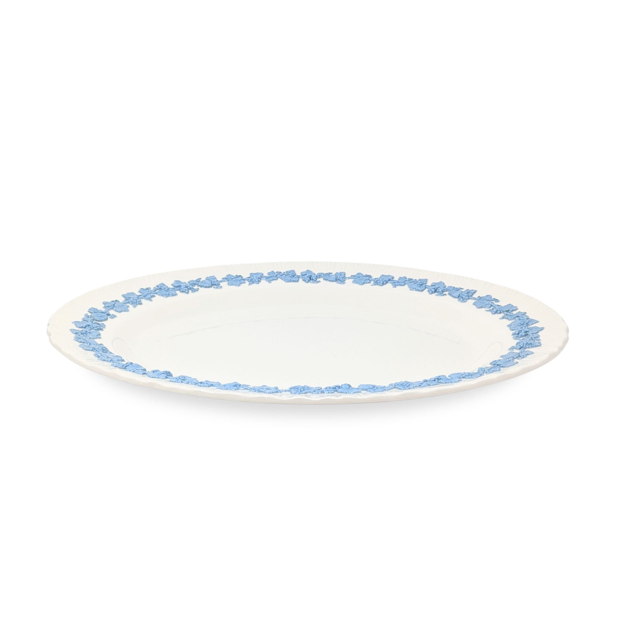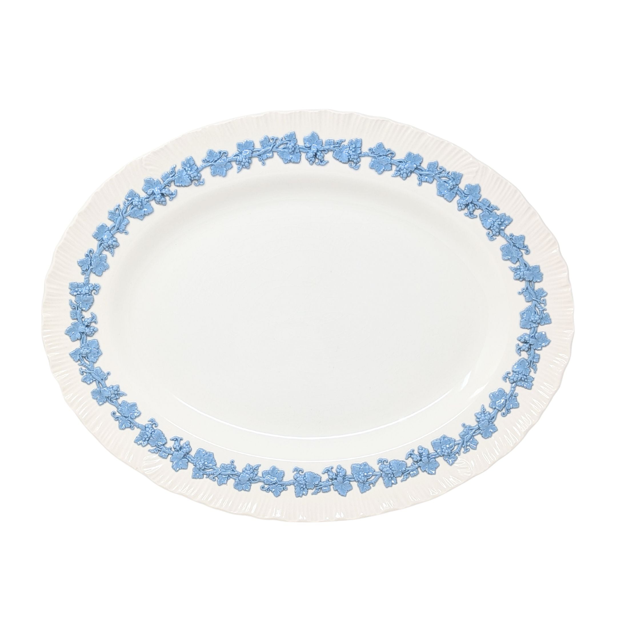 Details: One of the most popular and recognizable Wedgwood patterns, this platter is bordered with a raised grape and vine motif in Wedgwood blue or, “lavender”. The bottom stamped “WEDGWOOD OF ETRURIA & BARLASTON / MADE IN ENGLAND / EMBOSSED QUEENS WARE” as well as impressed with the Wedgwood logo and lettering/numbering system.
