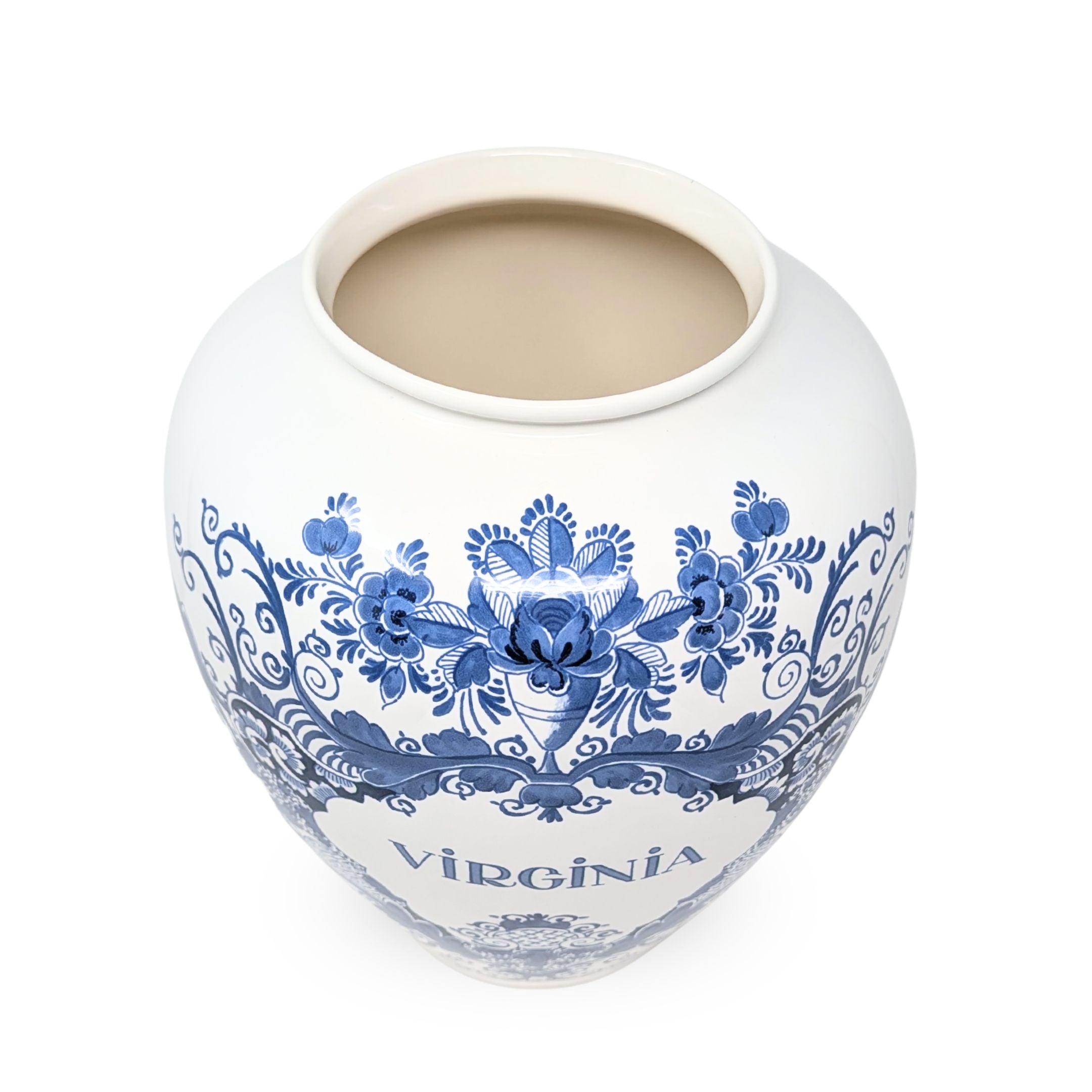 Details: Blue and white delft porcelain tobacco jar based on the 18th century original in the collection of Colonial Williamsburg.