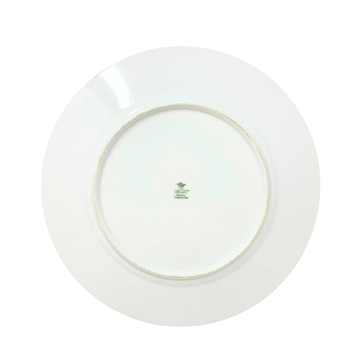 Details: Set of 9 large plates with heavy gold decorated rims and three different designs featuring 18th century court scenes. Three plates are marked on the back in green with a crown and "TK Thun Bohemia Czechoslovakia", four are marked in green with "Omeco New-York Czechoslovakia", two plates are marked "Made in Czechoslovakia".