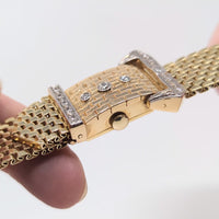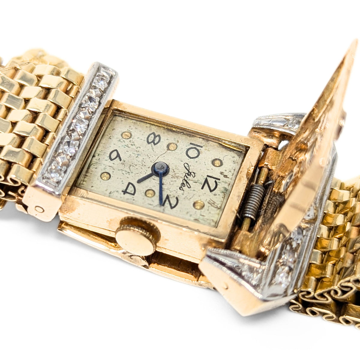 Details: An absolutely stunning 14K yellow gold and diamond 1940’s Jules watch bracelet. Pull on the end of the buckle and the cover flips open to reveal the watch face.