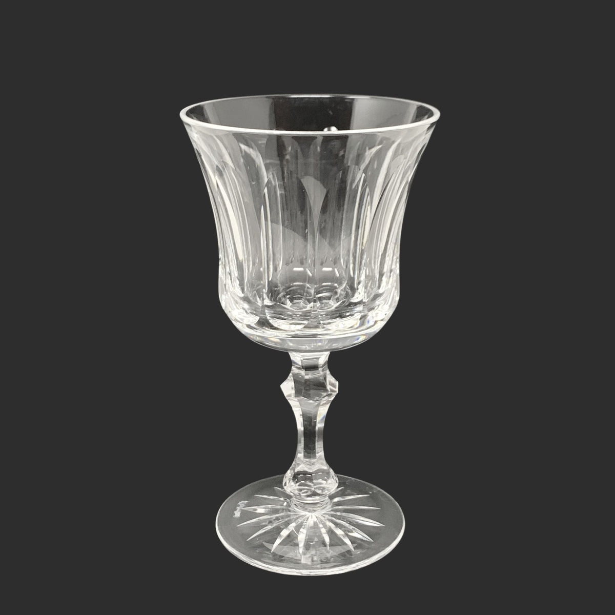 Details: Crystal water goblet by Waterford in the Innisfail pattern. The goblet features a flared bowl and round starburst cut foot. Waterford old hallmark can be seen on the underside of the foot.